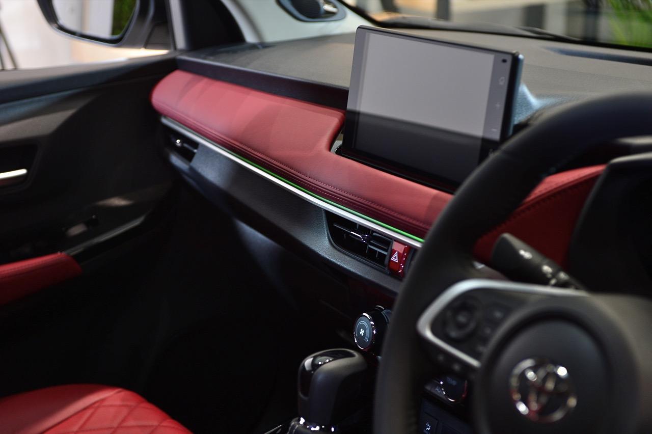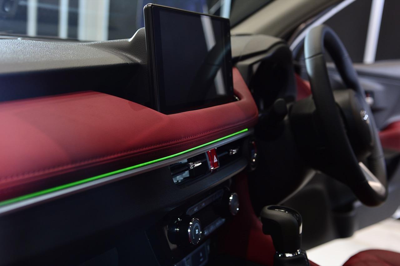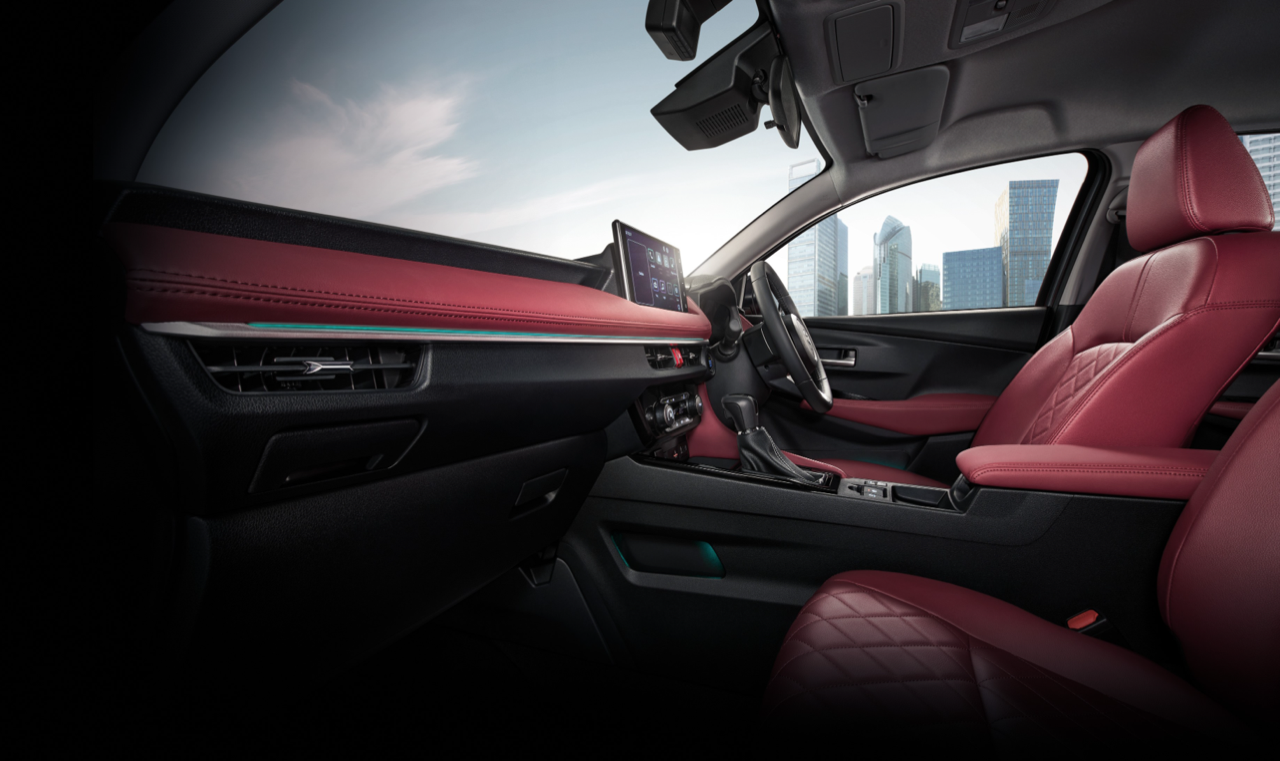 คอนโซลหน้าหุ้มหนังสังเคราะห์สีแดงแบบ Premium Soft Touch พร้อมตกแต่งด้วยแถบสีเงินเมทัลลิก