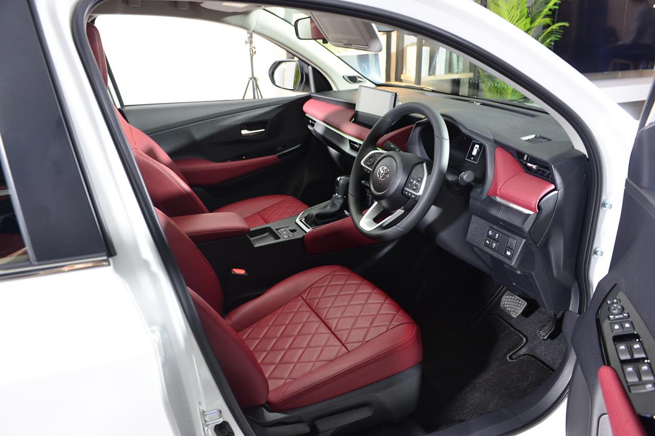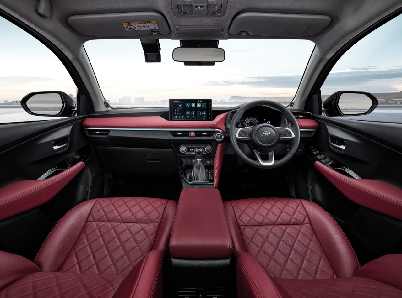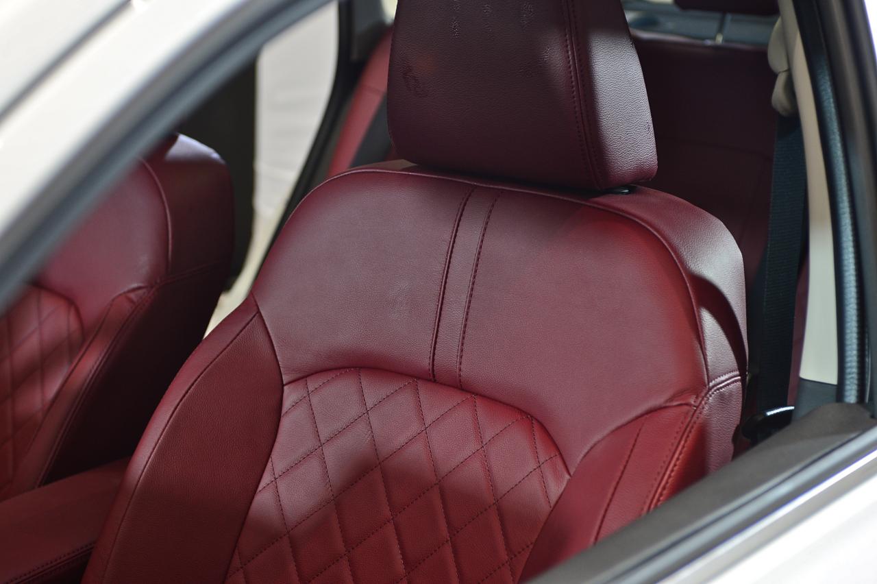 ภายในตกแต่งด้วยสีแดง ทั้งบริเวณคอนโซลหน้าและเบาะหนังแท้