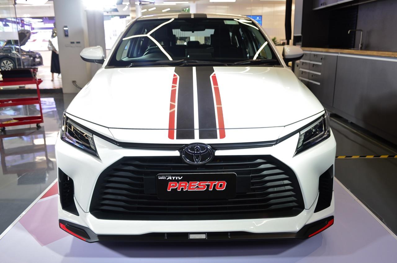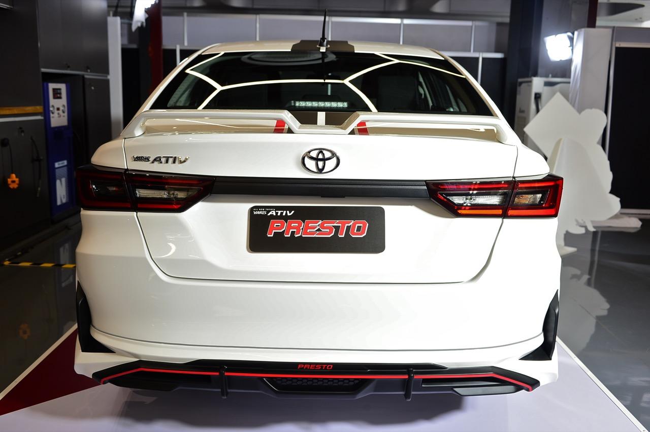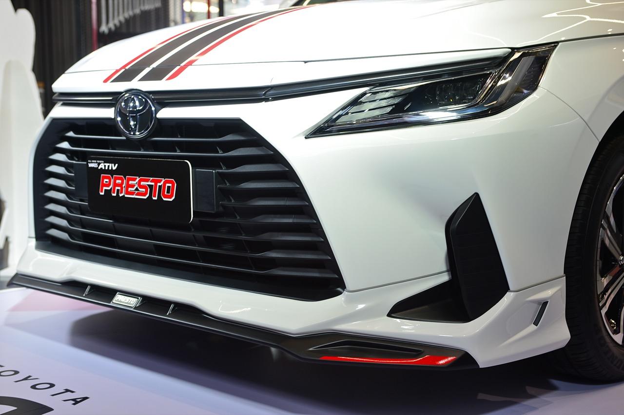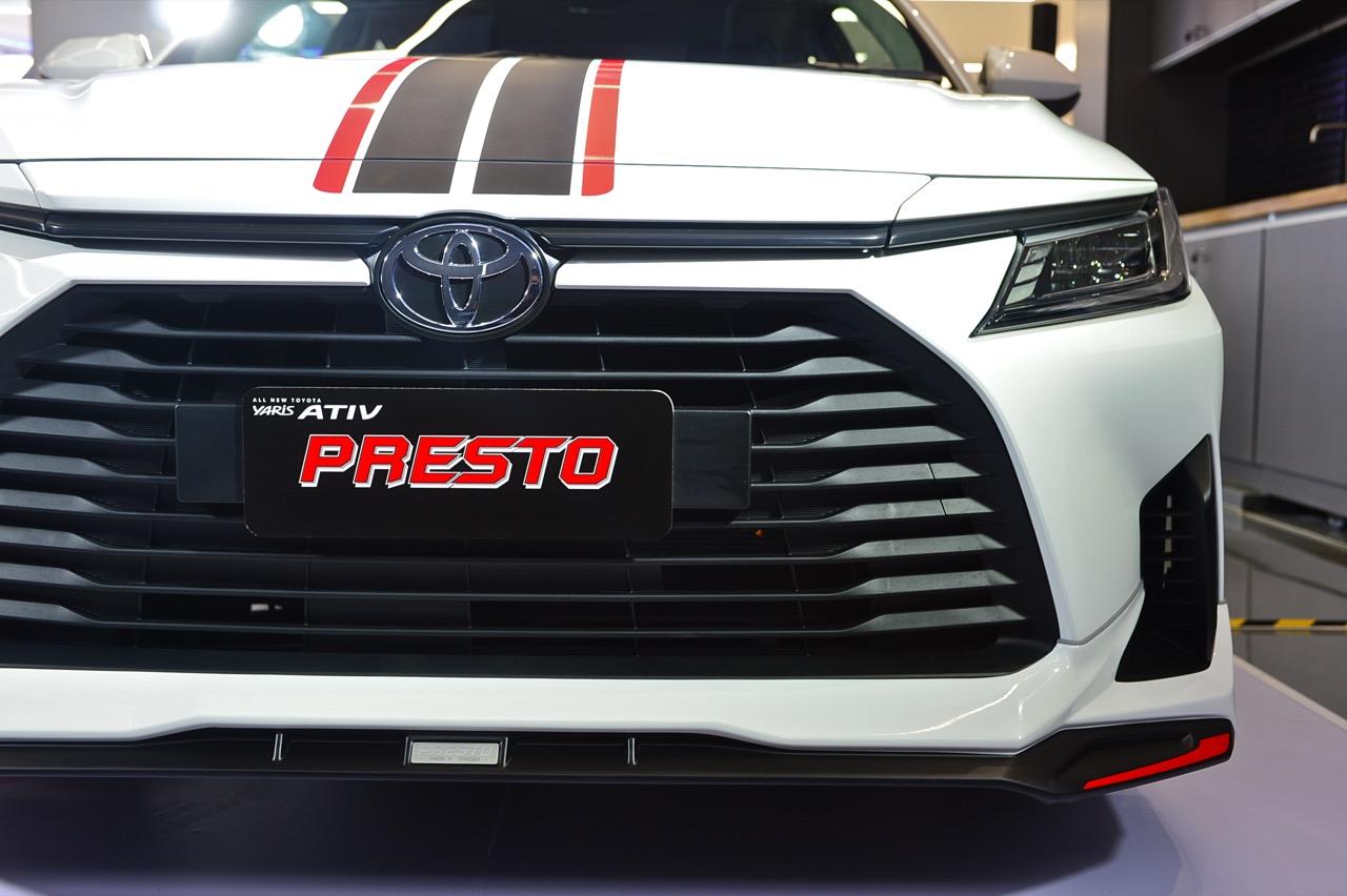 ชุดอุปกรณ์ตกแต่ง PRESTO (เพรสโต้) ที่ตกแต่งใน Toyota New Yaris Ativ ได้รับแรงบันดาลใจจากสนามแข่ง นำมาสู่การออกแบบชุดแต่ง PRESTO ที่เน้นรูปลักษณ์แบบรถแข่งในสนามแข่ง One Make Race Toyota แจ้งว่า การออกแบบเส้นสายพร้อมลวดลายสติกเกอร์ที่เฉียบคม ทำให้รถ Yaris Ativ 2022 ดูเหมือนพยายามพุ่งทะยานไปข้างหน้า มีการเพิ่มความดุดันด้วยสีทูโทน (สีเดียวกับตัวรถตัดกับสีดำ) และเพิ่มความสปอร์ตด้วยสติกเกอร์คาดฝากระโปรง หลังคา และฝาท้าย สีดำ-แดง