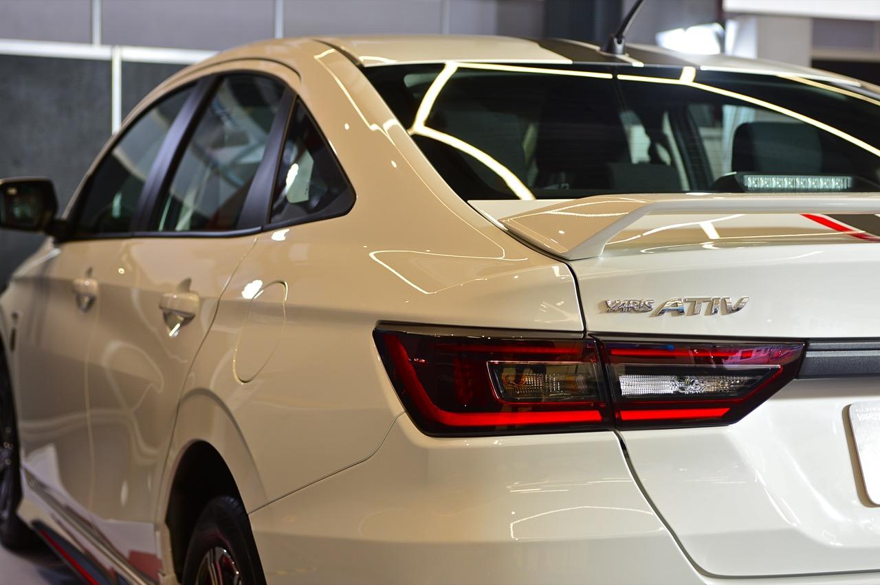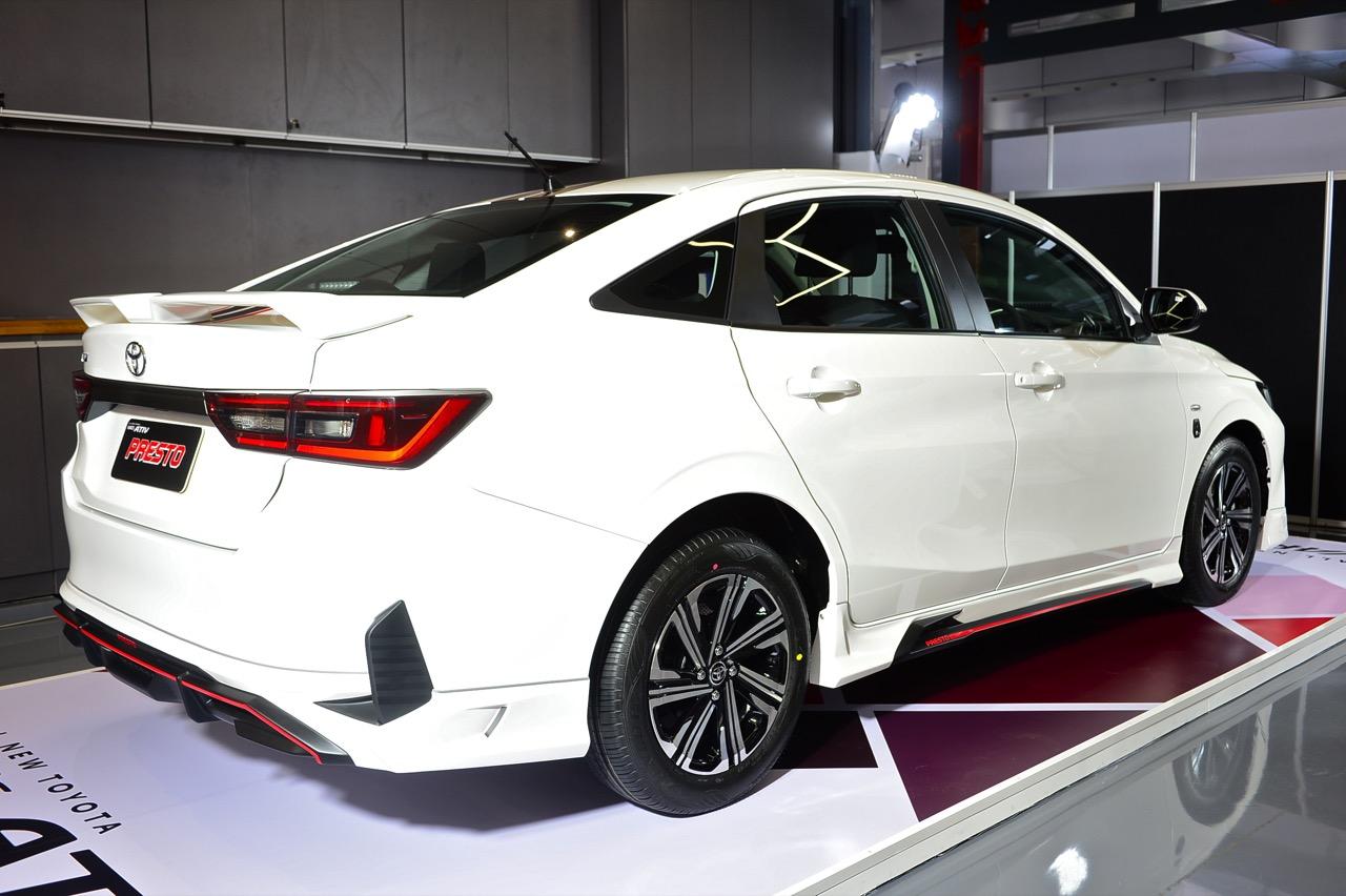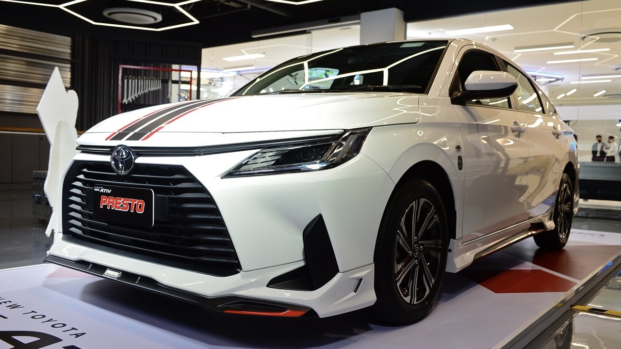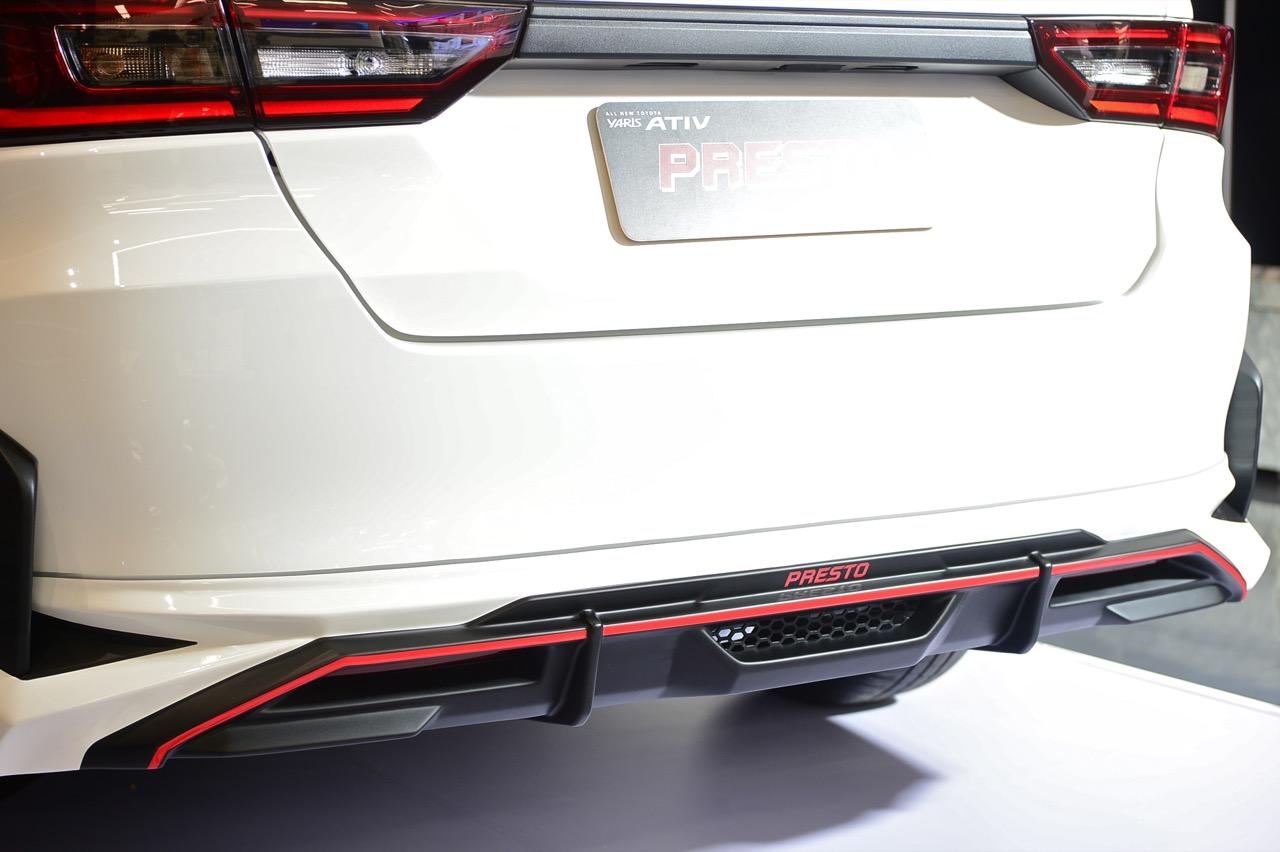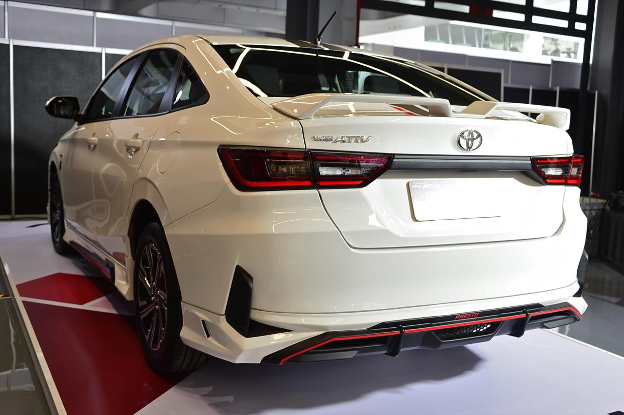ชุดอุปกรณ์ตกแต่ง PRESTO (เพรสโต้) ที่ตกแต่งใน Toyota New Yaris Ativ ได้รับแรงบันดาลใจจากสนามแข่ง นำมาสู่การออกแบบชุดแต่ง PRESTO ที่เน้นรูปลักษณ์แบบรถแข่งในสนามแข่ง One Make Race Toyota แจ้งว่า การออกแบบเส้นสายพร้อมลวดลายสติกเกอร์ที่เฉียบคม ทำให้รถ Yaris Ativ 2022 ดูเหมือนพยายามพุ่งทะยานไปข้างหน้า มีการเพิ่มความดุดันด้วยสีทูโทน (สีเดียวกับตัวรถตัดกับสีดำ) และเพิ่มความสปอร์ตด้วยสติกเกอร์คาดฝากระโปรง หลังคา และฝาท้าย สีดำ-แดง
