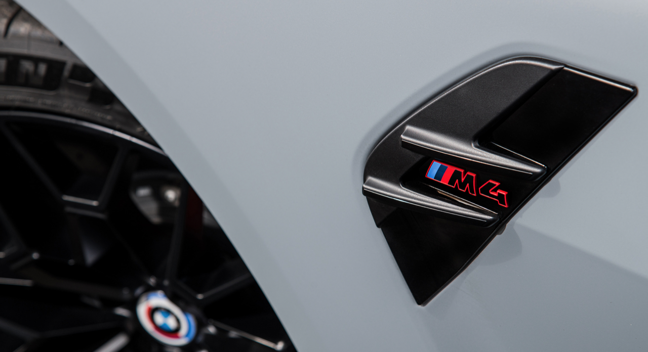 ตัวอักษร M4 CSL ที่ด้านหลัง แผงด้านข้าง กระจังหน้า ใช้การออกแบบใหม่ด้วยพื้นผิวสีดำและโครงร่างสีแดง ส่งสัญญาณถึงภารกิจด้านมอเตอร์สปอร์ตของ CSL ด้วยสไตล์ที่ดูเรียบง่าย ค้ำยันสตรัทในห้องเครื่อง และท่อเก็บเสียงด้านหลังไทเทเนียม ในห้องเครื่อง ค้ำยันสตรัทส่วนหน้า พัฒนาขึ้นโดยเฉพาะสำหรับ M4 CSL ยกระดับความแข็งแกร่งของแชสซีขณะที่ต้องเลี้ยวมุมแคบด้วยความรวดเร็ว ชิ้นส่วนประกอบอะลูมิเนียมหล่อขึ้นรูป เชื่อมต่อเบ้าโช้คยึดติดกับส่วนหน้าอย่างแข็งแรง รูปทรงของค้ำโช้คได้รับการปรับแต่งให้เข้ากับแรงที่รถต้องรับมือในสถานการณ์การขับขี่ต่างๆ ช่วยเพิ่มความคล่องตัวและความแม่นยำในการบังคับเลี้ยว