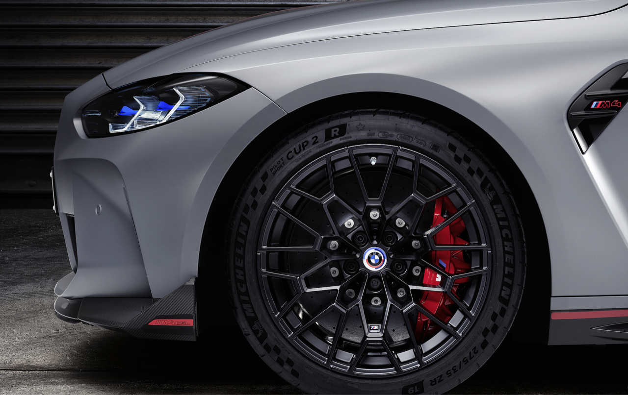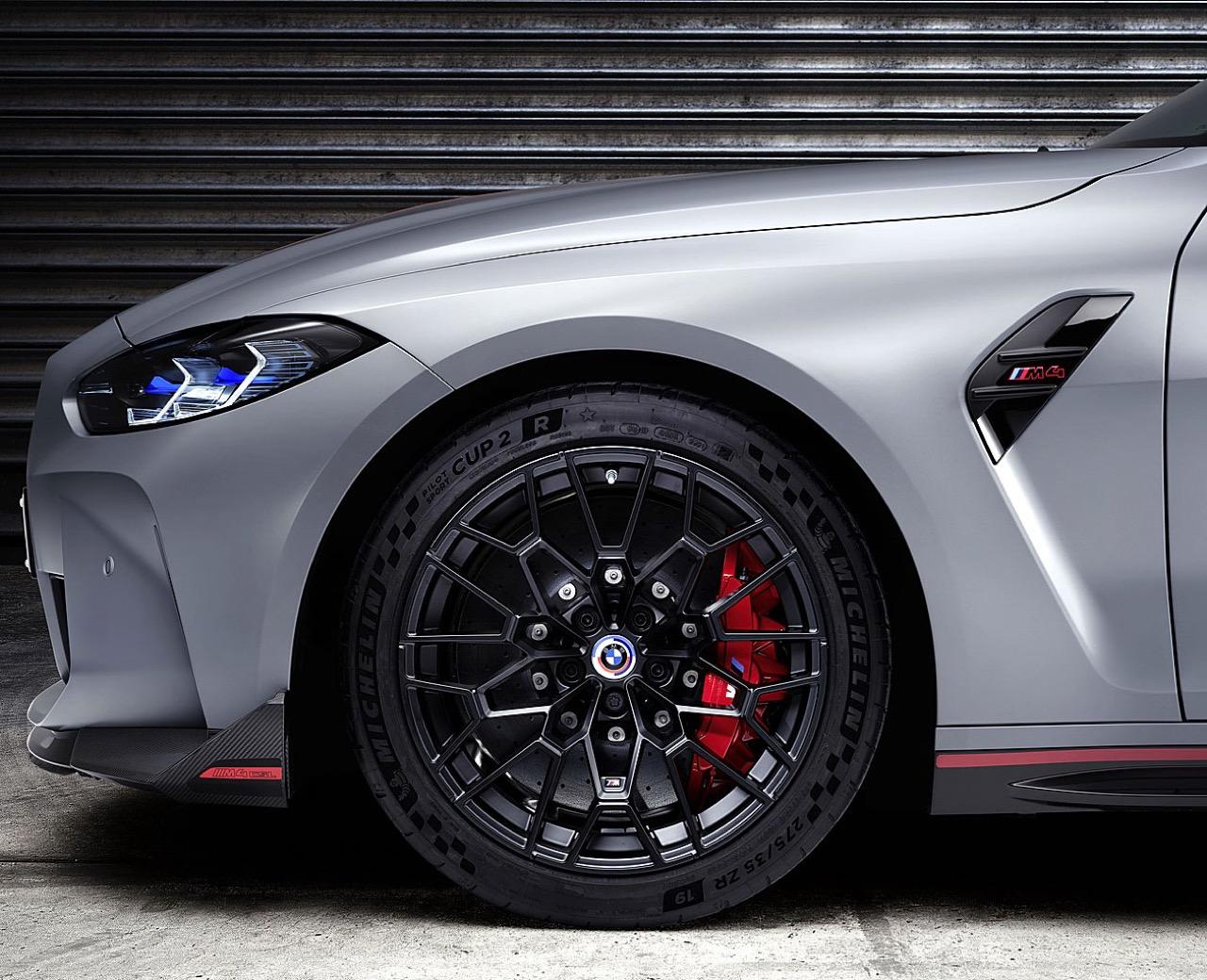 BMW M4 CSL ใช้ล้ออัลลอยน้ำหนักเบาแบบฟอร์จ ดีไซน์ลายซี่ล้อแบบไขว้ ล้อน้ำหนักเบาห่อรัดด้วยยางสปอร์ตสมรรถนะสูง Michelin Pilot Sport Cup 2 R ไซส์ 275/35 ZR19 ที่ด้านหน้า และ 285/30 ZR20 ที่ด้านหลัง ซึ่งเป็นยางที่พัฒนาสำหรับ CSL โดยเฉพาะ ยาง Pilot Sport Cup 2 R ได้รับการออกแบบสำหรับวิ่งในสนามแข่ง ส่งผ่านแรงเร่งความเร็วและแรงควบคุมด้านข้างเมื่อเข้าโค้ง รวมถึงการเบรกได้อย่างมีประสิทธิภาพ ยางรุ่นนี้ช่วยให้การขับ M4 CSL มีไดนามิกสูง เพิ่มความสะดวกสบายเมื่อใช้งานในชีวิตประจำวันและการเดินทางระยะไกล.