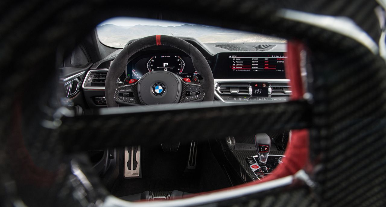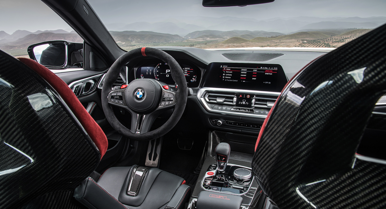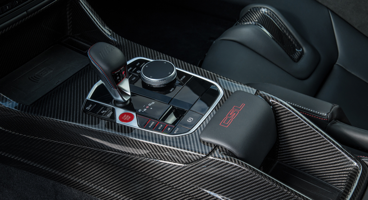คอนโซลกลางคาร์บอนไฟเบอร์ของ BMW M4 CSL ทำมาจาก CFRP ทั้งหมด รูปแบบที่โดดเด่นของวัสดุ สามารถระบุได้อย่างชัดเจนบนพื้นผิวของแผงควบคุมรอบคันเกียร์ ตัวควบคุม iDrive และปุ่มสำหรับเปิดใช้งานการตั้งค่าและฟังก์ชันต่างๆ ของรถ การใช้แผงคาร์บอนไฟเบอร์ ช่วยลดน้ำหนักของคอนโซลกลางได้กว่า 4 กิโลกรัม M4 CS ยังมีฟังก์ชันการทำงานที่คุ้นเคย พร้อมคุณสมบัติต่างๆ เช่น ที่วางแขนหุ้มหนังและแท่นชาร์จไร้สายสำหรับโทรศัพท์มือถือ การตกแต่งเน้นบรรยากาศมอเตอร์สปอร์ตของ M4 CSL ด้วยคาร์บอนไฟเบอร์ พร้อมตรา “CSL” ใต้พนักพิงศีรษะ บนคอนโซลกลาง และแผงด้านหลัง พวงมาลัย M Alcantara อีกหนึ่งคุณสมบัติมาตรฐานของ BMW M4 CSL พื้นผิวจับกระชับ ขอบพวงมาลัย เครื่องหมายสีแดงที่ตำแหน่ง 12 นาฬิกา ก้านวงคาร์บอนไฟเบอร์ แป้นเปลี่ยนเกียร์ คาร์บอน แป้นเหยียบคันเร่งและเบรก รวมถึงที่พักเท้า สร้างความรู้สึกเหมือนรถแข่งจริงทั้งในแง่ของรูปลักษณ์และการใช้งาน