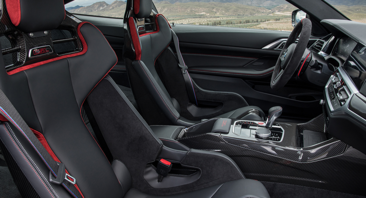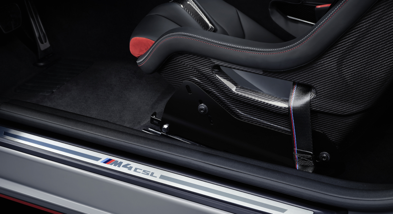การตกแต่งภายในของ BMW M4 CSL คูเป้น้ำหนักเบามีที่นั่งสำหรับคนขับและผู้โดยสารหนึ่งคนเท่านั้น เบาะนั่งแบบฟูลบัคเก็ต M Carbon ได้รับการพัฒนาสำหรับ BMW M4 CSL โดยเฉพาะ เน้นไปที่การขับบนสนามแข่ง โครงสร้างคาร์บอนไฟเบอร์ที่เบาและสวยงามแต่ไม่มีความสะดวกสบาย มันเป็นเบาะรถแข่งที่ไม่มีมอเตอร์ปรับตั้งไฟฟ้า ไม่มีระบบระบายอากาศในตัวเบาะ ไม่มีระบบทำความเย็น หรืออุ่นเบาะ ไม่มีตัวรองหนุนแผ่นหลังหรือครีบด้านข้างตัวเบาะ ซึ่งช่วยลดน้ำหนักได้ 24 กิโลกรัม เมื่อเทียบกับเบาะนั่งไฟฟ้าที่ติดตั้งใน BMW M4 Competition