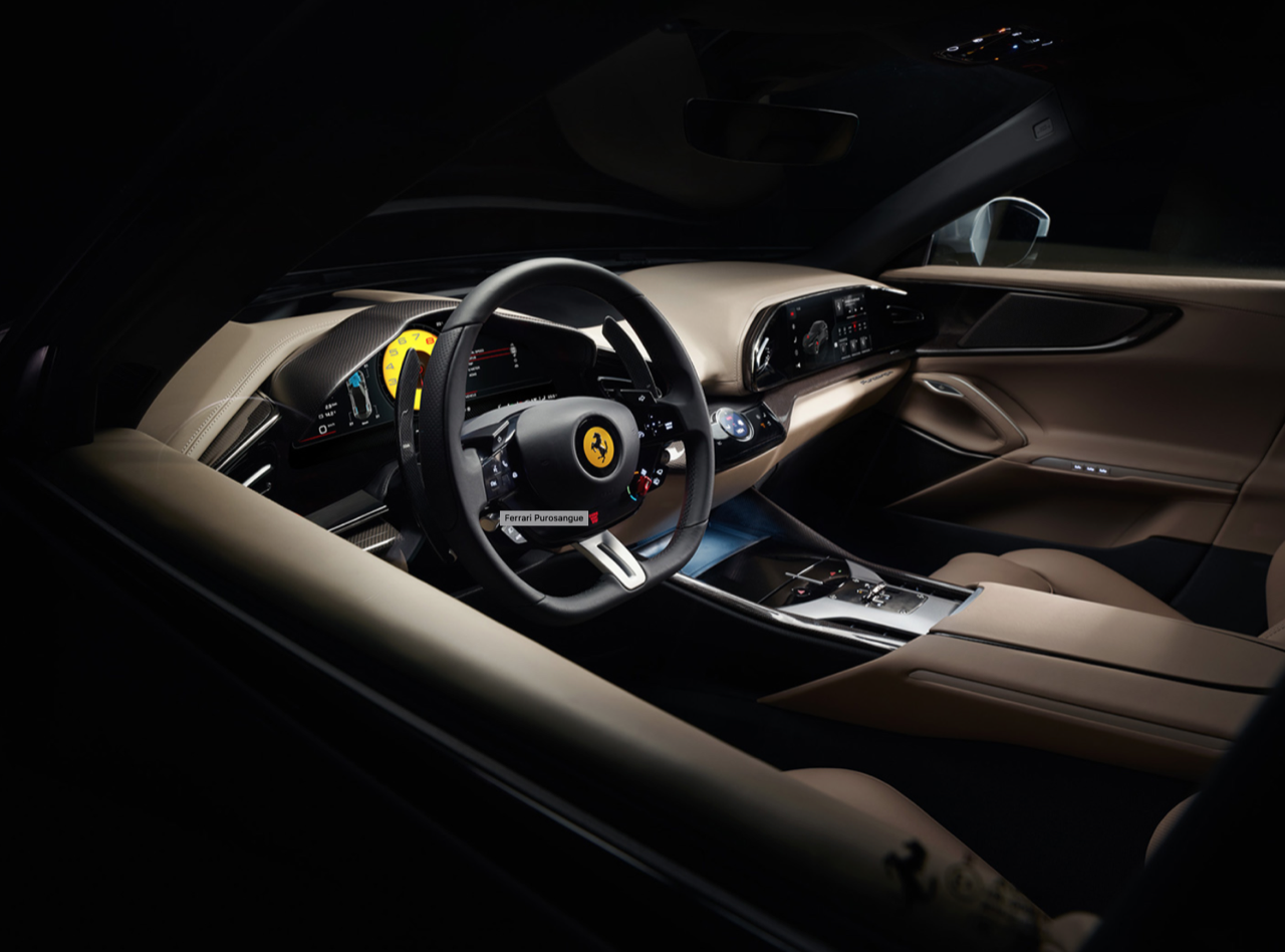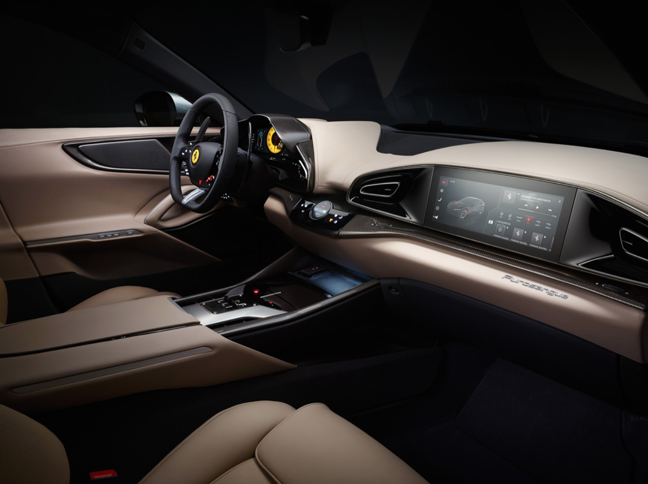 ในฐานะที่เป็น Ferrari เพียงรุ่นเดียวในปัจจุบัน ที่มีการนำเสนอประตูสี่บาน กับเบาะนั่งสี่ตำแหน่งสำหรับคนขับและผู้โดยสารทั้งหมดสี่คน Purosangue ได้รับการติดตั้งชุดประตูด้านหลังแบบบานพับด้านหลังแบบโค้ช (หรือที่เรียกว่า "suicide door") ช่วยให้เข้าหรือออกจากห้องโดยสารบริเวณเบาะหลังได้ง่ายขึ้น Purosangue พยายามรักษารูปลักษณ์และมาตรฐานงานประกอบของรถยนต์จากมาลาเนลโล เบาะนั่งด้านหน้าและด้านหลังเป็นแบบแยกส่วน ซึ่งหมายความว่ามันจะไม่มีที่นั่งด้านหลังสำหรับผู้โดยสารคนที่ 5 ทั้งสองแถวมีคอนโซลกลาง แน่นอนว่าภายในหุ้มด้วยวัสดุคุณภาพ ระบบควบคุมส่วนใหญ่ของรถทำงานผ่านสวิตช์ระบบสัมผัสบนพวงมาลัย ความประหลาดใจครั้งใหญ่ในยุคของหน้าจอ center-stack แบบแท็บเล็ตก็คือ Purosangue ไม่มีหน้าจอสัมผัสของระบบ Infotainment ที่ติดตั้งไว้ตรงกลาง เพื่อความเรียบง่ายและสไตล์ของพี่ม้า หลังคากระจก Panoramic เป็นออปชันเสริม สำหรับแผงหลังคาคาร์บอนไฟเบอร์แบบมาตรฐาน ช่วยลดน้ำหนักได้บ้างแต่ก็ไม่มากเท่าที่ควร อย่างท่ีบอกว่า Purosangue เป็นรถสี่ประตูสี่ที่นั่งรุ่นแรกของแบรนด์ม้าลำพองที่สามารถเข้าถึงเบาะหลังได้โดยใช้ประตูแบบตู้กับข้าว บานพับด้านหลังที่ขับเคลื่อนด้วยมอเตอร์ไฟฟ้านั้นเจ๋งดี อย่างไรก็ตาม ขนาดความยาว 4,973 มิลลิเมตร และสูง 1,589 มิลลิเมตร สั้นกว่าและต่ำกว่า Lamborghini Urus เล็กน้อย เมื่อดูจากตัวเลขห้องเก็บสัมภาระส่วนท้าย กระทิงผยอง Lamborghini จะใช้งานได้จริงมากกว่า ด้วยพื้นที่เก็บสัมภาระขนาด 616 ลิตร เมื่อเทียบกับพื้นที่เก็บสัมภาระ 473 ลิตรของ Ferrari SUV