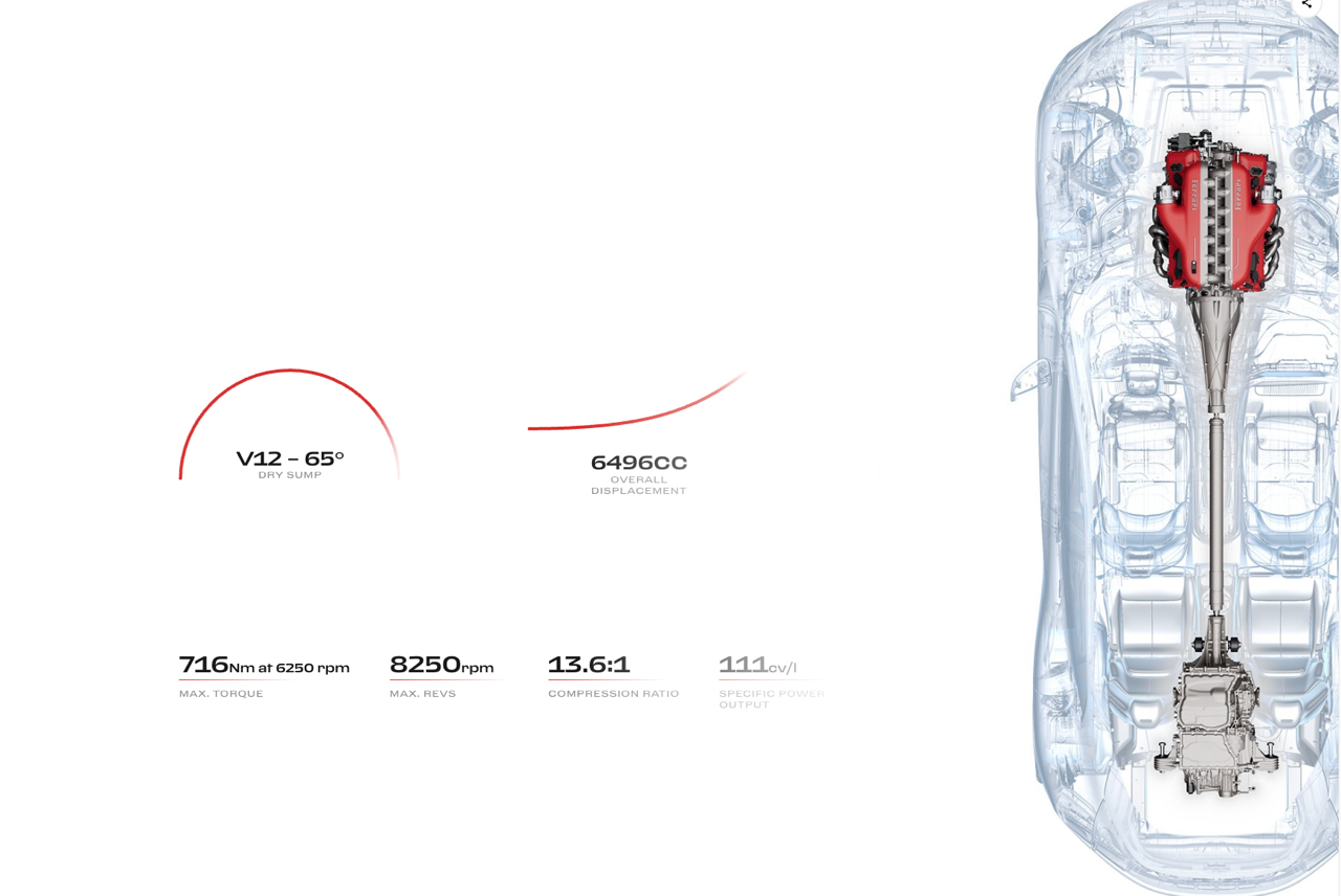 ภายใต้ฝากระโปรงยาวแบบฝาพับเป็นเครื่องยนต์ V12 รุ่นใหม่ ขนาด 6.5 ลิตร โดยไม่มีการช่วยเหลือของมอเตอร์ไฟฟ้าแต่อย่างใดทั้งสิ้น ตัวเครื่องวางร่นตำแหน่งเข้าไปชิดกับห้องโดยสารส่วนหน้า บริเวณกึ่งกลางด้านหน้า เพื่อช่วยในการกระจายน้ำหนัก ระบบส่งกำลังใช้กระปุกเกียร์อัตโนมัติแบบคลัตช์คู่ 8 สปีด เกียร์ 1-7 ออกแบบให้มีอัตราทดสั้นโดยเจตนา เกียร์ถูกวางอยู่ที่ด้านหลังใกล้กับเฟืองท้าย ระบบขับเคลื่อนสี่ล้อแบบ Active ขณะที่ power transfer unit รับหน้าที่ถ่ายโอนกำลัง เปลี่ยนถ่ายแรงบิดไปที่ล้อหน้า เพื่อขับเคลื่อนสี่ล้อในบางสถานการณ์ที่มีความจำเป็นต้องใช้แรงบิดจากทุกล้อเพื่อเอาตัวรอด