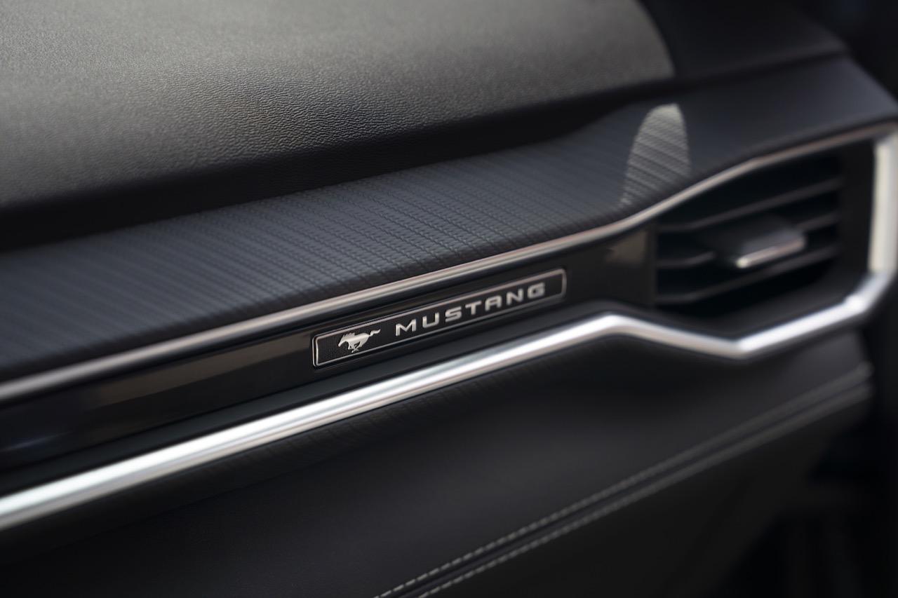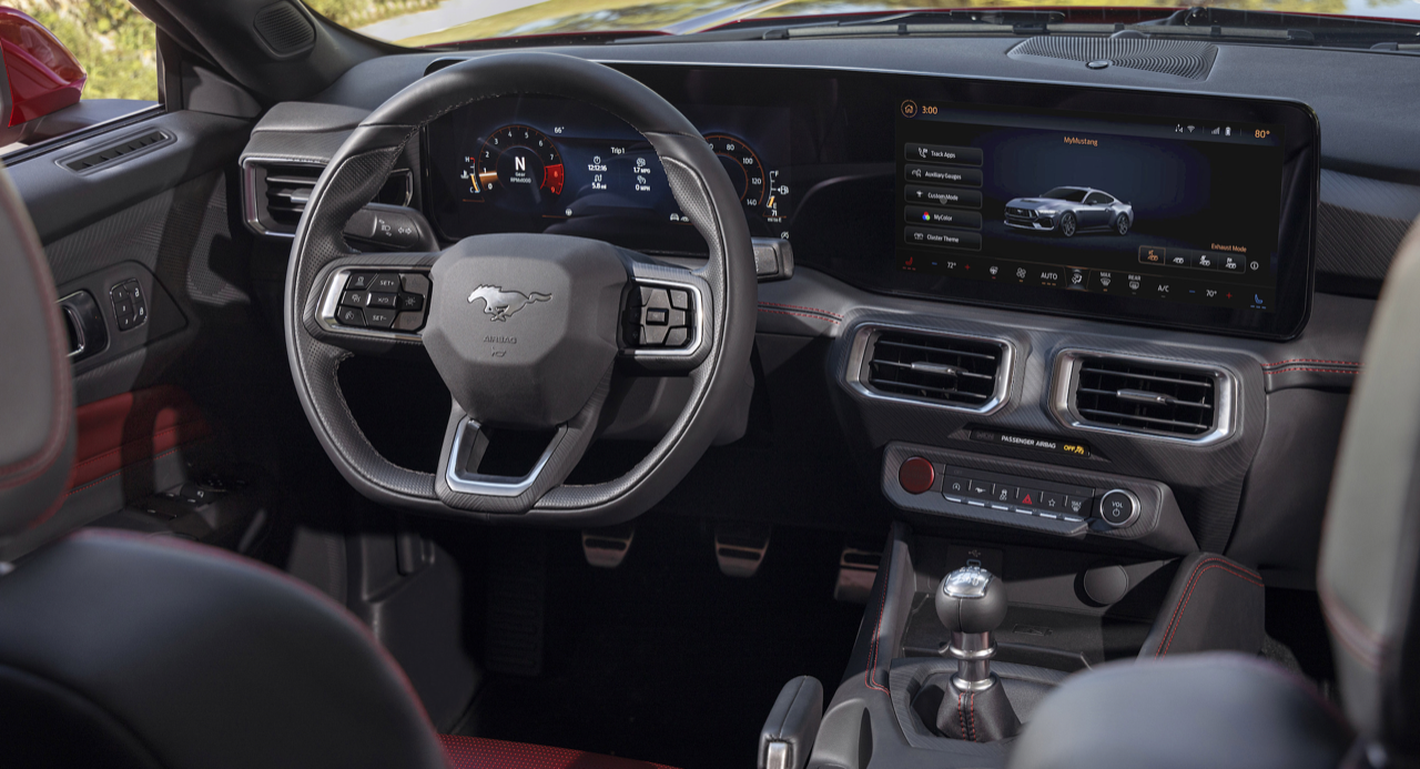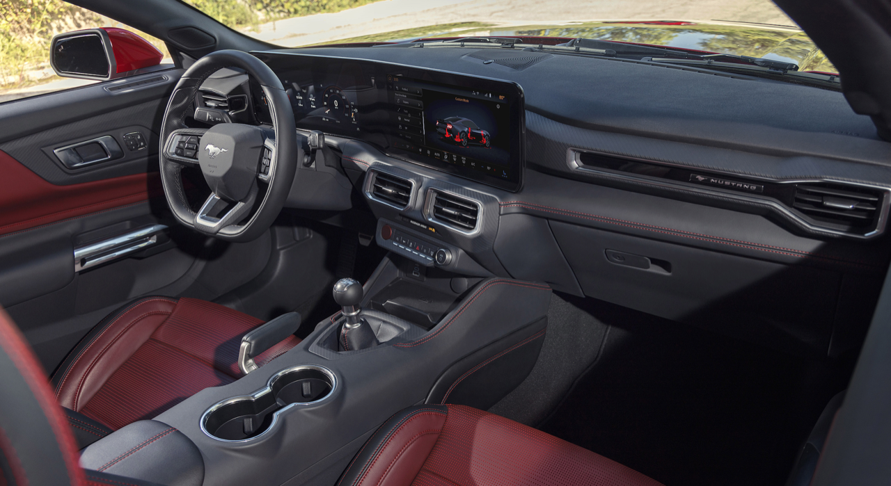 ห้องโดยสาร ออกแบบแผงหน้าปัดใหม่ ใช้เทคโนโลยีล้ำสมัย โดยมีการพัฒนาให้ตอบโจทย์ผู้ขับมากที่สุดเท่าที่ Mustang เคยมีมา จอโค้งที่แสดงผลแบบต่อเนื่อง 2 จอ ปรับเปลี่ยนเพื่อดูข้อมูลที่ต้องการได้อย่างรวดเร็ว ได้แรงบันดาลใจมาจากเครื่องบินรบ แผงหน้าปัดดิจิทัลขนาด 12.4 นิ้ว ปรับการทำงานให้แสดงผลได้ตามโหมดการขับ ซอฟต์แวร์ปรับเปลี่ยนรูปแบบการแสดงผลแบบแอนิเมชัน ทุกพิกเซลบนจอภาพเพื่อความคมชัดและอ่านค่าได้ง่าย จอภาพแสดงข้อมูลที่จำเป็นต่อการขับขี่อยู่ในตำแหน่งตรงหน้าคนขับ เปิดให้เลือกปรับแต่งการแสดงผลได้ตามต้องการ ตั้งแต่สีของจอ การเลือกหน้าปัดแสดงผลแบบคลาสสิก หรือการเลือกหน้าจอแสดงผลแบบเรียบง่าย ซึ่งจะแสดงเฉพาะข้อมูลพื้นฐานเพื่อเพิ่มสมาธิในการขับขี่ แผงควบคุมดิจิทัลแบบไร้รอยต่อ เชื่อมการทำงานกับหน้าจอระบบอินโฟเทนเมนต์ SYNC4 ขนาด 13.2 นิ้ว ตรงกลางคอนโซล มุมมองของจอภาพจะหันเข้าหาผู้ขับคล้ายค็อกพิตนักบิน แผงหน้าปัดแสดงข้อมูลที่จำเป็นในการขับ ย้ายปุ่มควบคุมบางส่วน เช่น การปรับระดับเสียง และอุณหภูมิ เข้าไปรวมอยู่บนหน้าปัดดิจิทัล พวงมาลัยใหม่แบบครึ่งวงกลมฐานตัดสไตล์รถแข่ง ช่วยเพิ่มพื้นที่คนขับให้กว้างขึ้น ฟีเจอร์ใหม่ล่าสุด Remote Rev ที่กดเร่งเครื่องยนต์จากปุ่มบนกุญแจรีโมตของรถได้