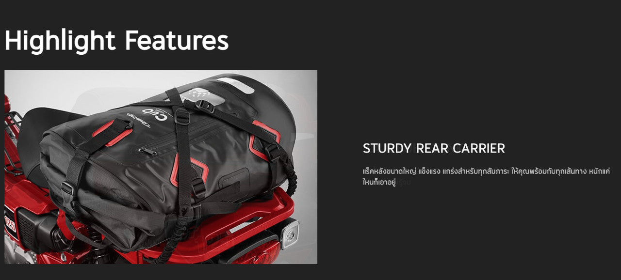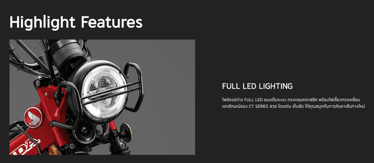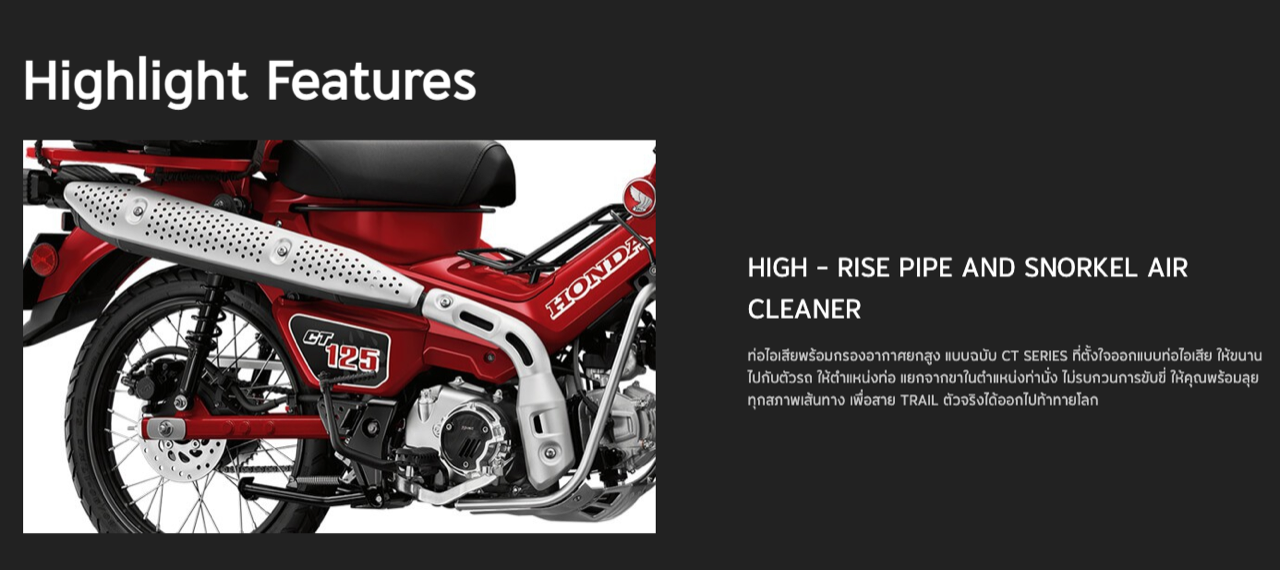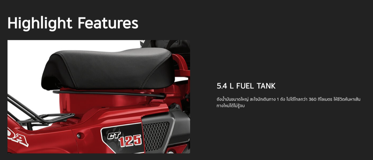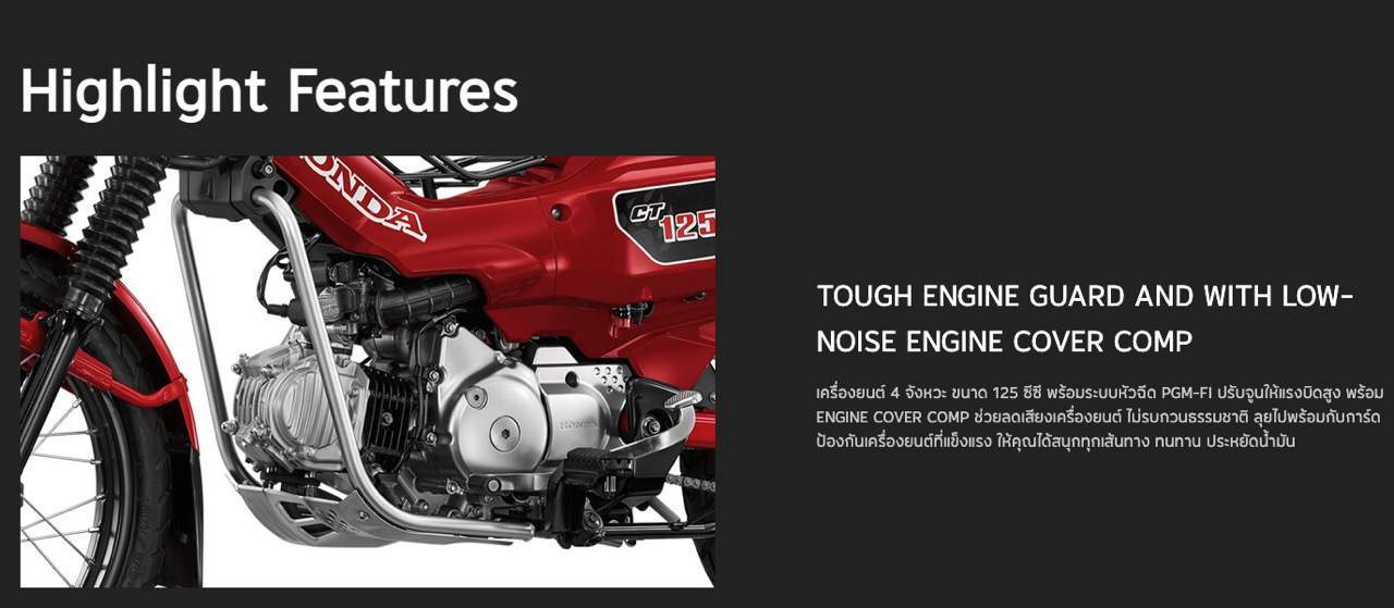 New Honda CT125 ยังมาพร้อมการยกระดับในด้านสมรรถนะ เครื่องยนต์ขนาด 125 ซีซี ที่ได้รับการพัฒนาให้มีแรงบิดมากขึ้น อัตราเร่งดี ระบบกันสะเทือนหลัง Adjustable Rear Suspension ที่สามารถปรับค่า Preload ได้ถึง 5 ระดับ รองรับทุกรูปแบบการใช้งาน ไม่ว่าจะอยู่บนเส้นทางปกติ หรือเส้นทางที่ท้าทาย