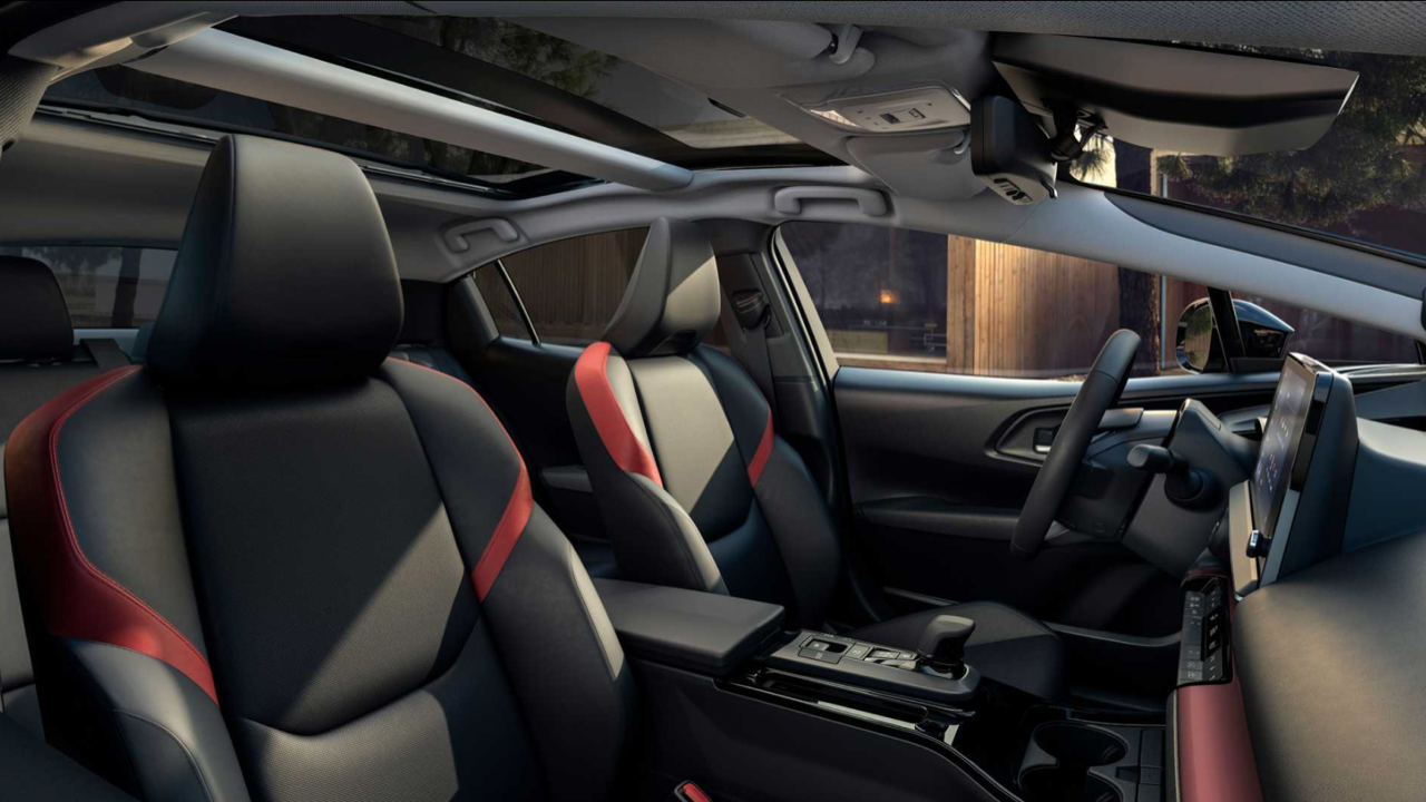 ภายในรถ Prius ใหม่ใช้สไตล์การออกแบบสามส่วน : "รอบข้าง" "โมดูลคนขับ" และ "แผงหน้าปัดแบบลอย" รูปลักษณ์คล้ายกับเลย์เอาต์ในครอสโอเวอร์ไฟฟ้า bZ4X เนื่องจากหน้าจอมาตรวัดยื่นออกมาจากแดชบอร์ด ตรงกลางติดตั้งหน้าจออินโฟเทนเมนต์ที่โผล่ออกมาจากแผงแดชบอร์ด การควบคุมทางกายภาพใช้ปุ่มที่มุมขวาล่างของหน้าจอ ช่องระบายอากาศแยกหน้าจอสาระบันเทิงออกจากส่วนควบคุม HVAC มีปุ่มควบคุมอุณหภูมิเบาะที่นั่ง และปรับอุณหภูมิห้องโดยสาร