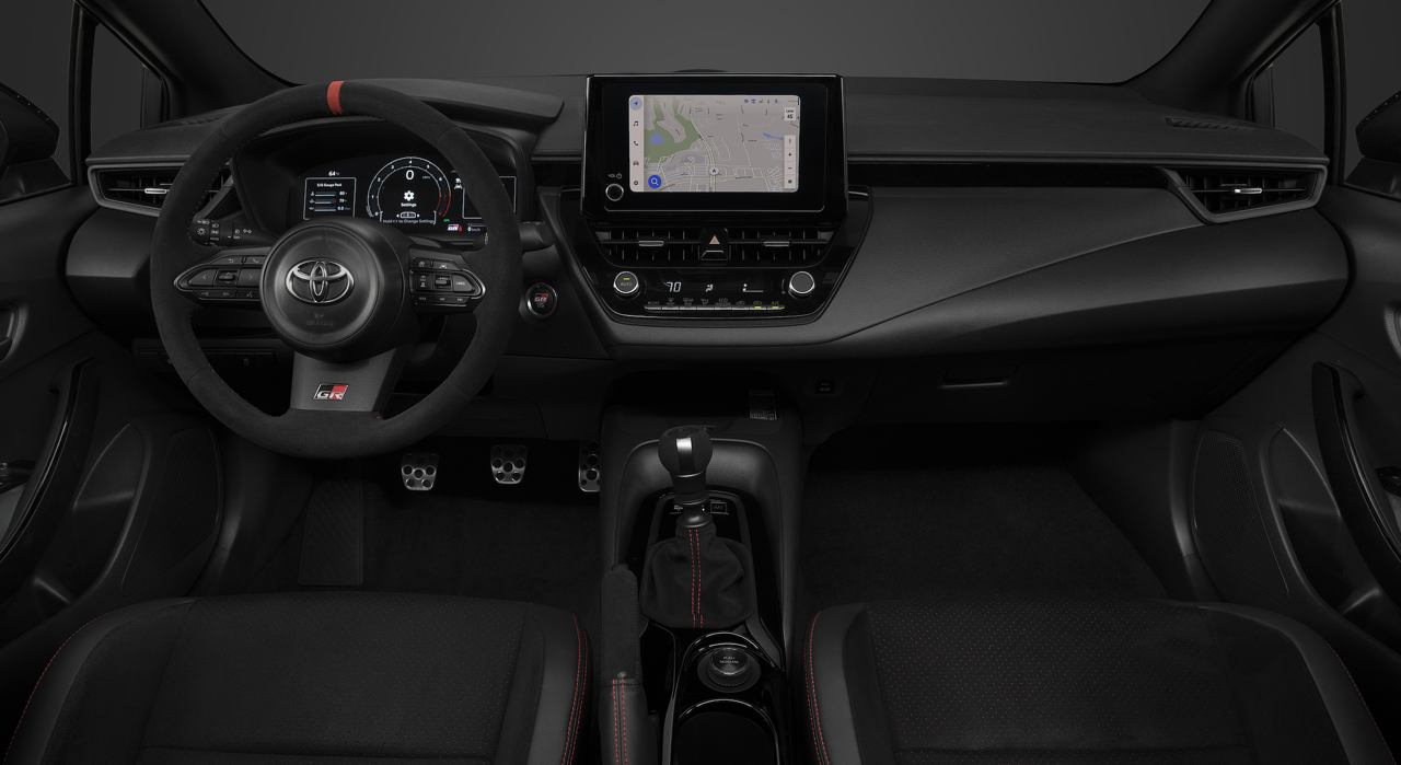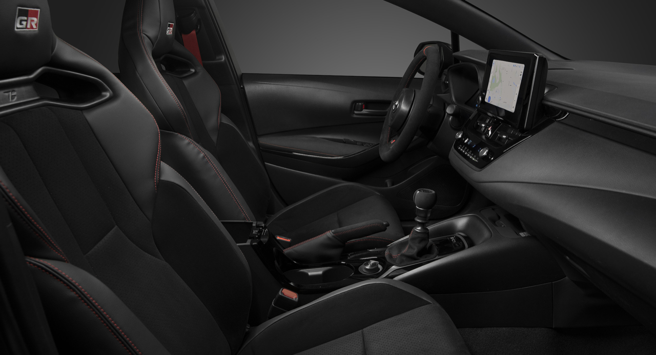 GR Corolla ใช้ห้องโดยสารส่วนใหญ่ร่วมกับ Corolla Hatchback รุ่นมาตรฐาน (โฉมนี้ จำหน่ายในยุโรปและออสเตรเลีย) ซึ่งหมายถึงคุณภาพการประกอบที่ดี วัสดุสัมผัสนุ่ม และคุณสมบัติมากมาย แต่มีการตกแต่งแบบเรซเซอร์เพื่อบรรยากาศของการแข่งรถพร้อมเบาะนั่งแบบสปอร์ต อุปกรณ์มาตรฐาน ประกอบด้วยไฟส่องสว่างภายในห้องโดยสาร เบาะนั่งคนขับปรับได้ 6 ทิศทาง ปุ่มกดสตาร์ต และแป้นเหยียบอะลูมิเนียม ระบบควบคุมอุณหภูมิอัตโนมัติ เบาะนั่งแบบอุ่น และพวงมาลัยแบบปรับอุ่นร้อนได้ ทั้งหมดเป็นอุปกรณ์มาตรฐานในรุ่น Circuit Edition ซึ่งยังใช้เบาะหนังกลับและหนังเทียมแทนเบาะผ้า ในรุ่น Morizo Edition วิศวกรของ GR ให้คำมั่นสัญญาว่ารุ่นสูงสุดที่ผลิตแค่ 200 คัน ปรับแต่งจนทำฟิลลิ่งการขับซิ่งของ GR Corolla จะมีระดับความตื่นเต้นที่สูงกว่า แต่ต้องเสียค่าการใช้งานจริง