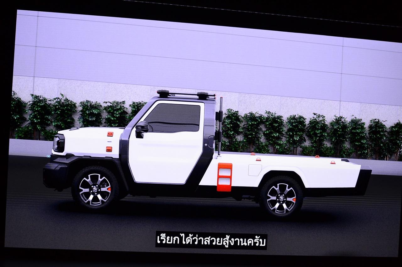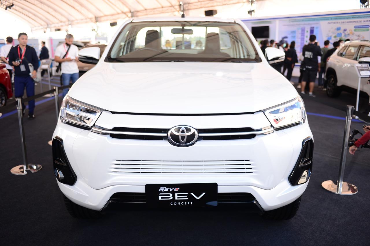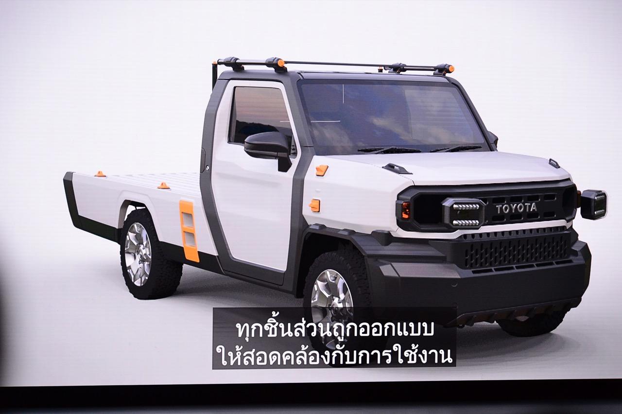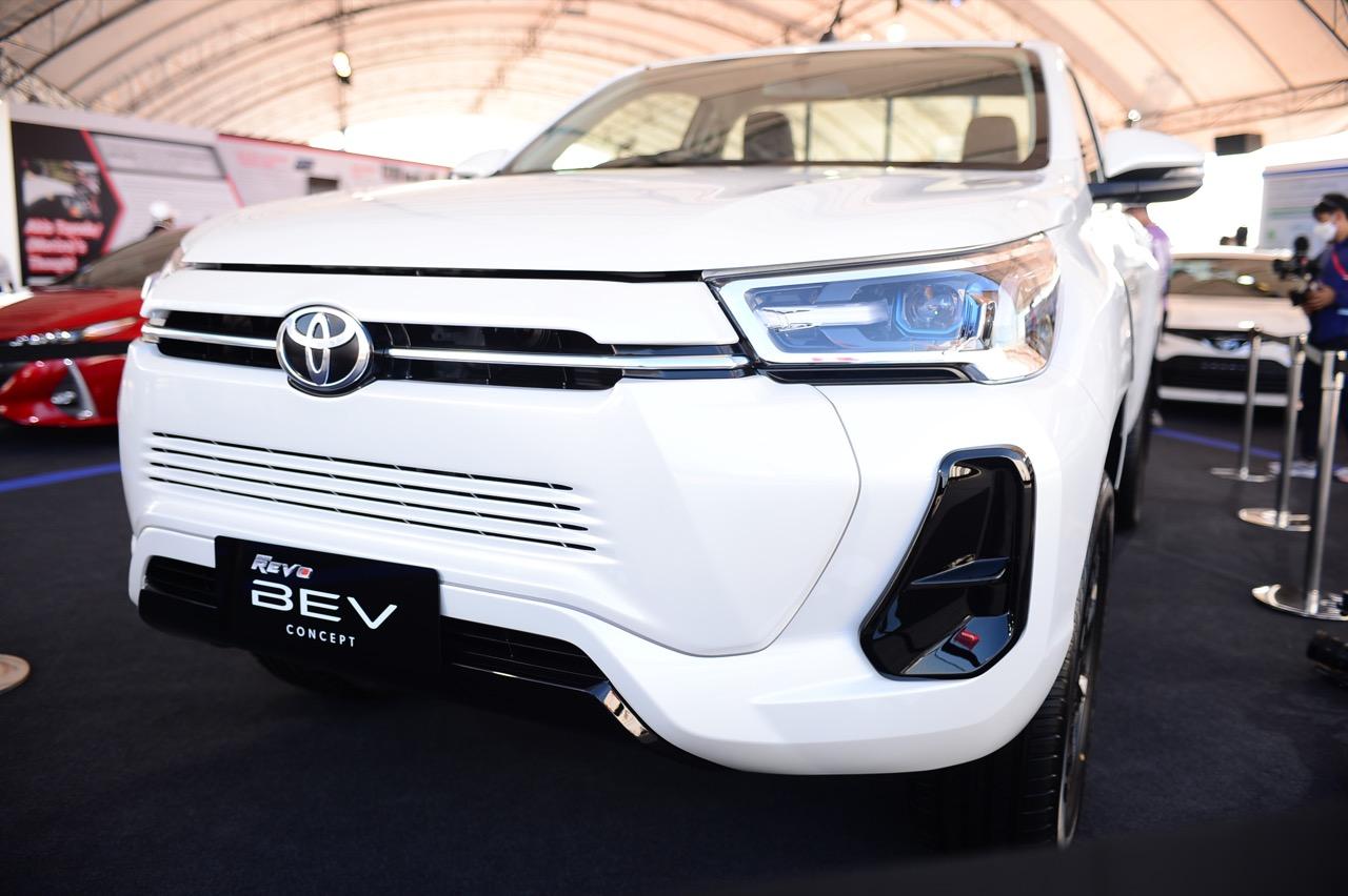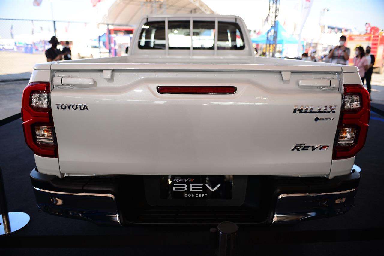 และในกลุ่มลูกค้าที่มีขนาดใหญ่มากของไทย ก็คือกลุ่มรถกระบะ รถบรรทุกขนาดเล็กนั้น ทาง Toyota ก็มีของเตรียมไว้ให้เช่นกัน อย่างแรกก็คือรถต้นแบบ Hilux Revo BEV ซึ่งนำ Revo ตอนเดียวมาทำเป็นรถกระบะไฟฟ้า ซึ่งวางมอเตอร์ขับเคลื่อนไว้ระหว่างล้อคู่หลัง วางแบตเตอรี่ไว้ท้ายรถ