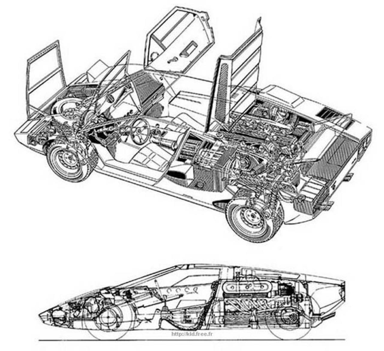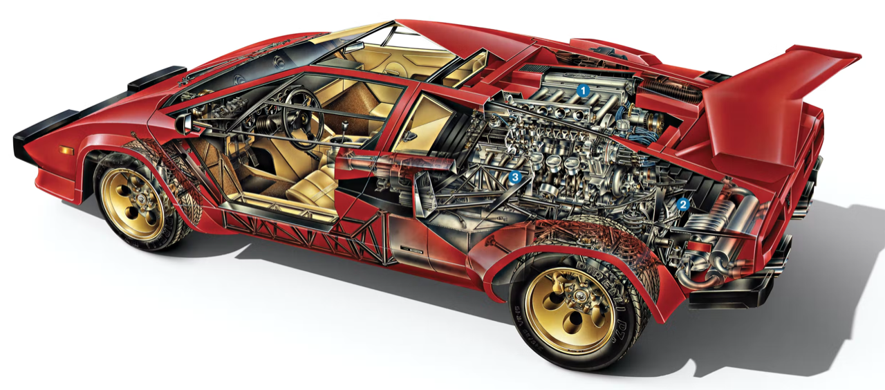 เพื่อยกระดับประสิทธิภาพการกระจายน้ำหนักใน Lamborghini Countach ทำให้ทีมนักออกแบบเลือกใช้เครื่องยนต์แบบเดิม แต่เปลี่ยนตำแหน่งติดตั้ง มาเป็นบริเวณกลางลำ โดยวางทำมุม 90 องศา เป็นการปรับมุมจาก 350 GT ถึง 180 องศา มีการติดตั้งกระปุกเกียร์ที่ด้านหน้าเครื่องยนต์ ในทางปฏิบัติก็คือ “ชุดเกียร์อยู่กึ่งกลางของรถ” เวอร์ชั่นสุดท้าย เครื่องยนต์ของ Countach เพิ่มความจุเป็น 5.2 ลิตร ต่อมาเครื่องยนต์ V12 ใน Countach รุ่นปี 1986 ก็ได้รับการอนุญาตให้ขายใน สหรัฐอเมริกา เหตุการณ์ครั้งสำคัญนี้ สำเร็จได้ด้วยการใช้ระบบหัวฉีดน้ำมันเชื้อเพลิงอิเล็กทรอนิกส์ ซึ่งนำมาทดแทนการใช้คาร์บูเรเตอร์ เพื่อให้สอดคล้องตามข้อกำหนดเรื่องการลดมลพิษที่เข้มงวดมากกว่าในสหรัฐอเมริกา