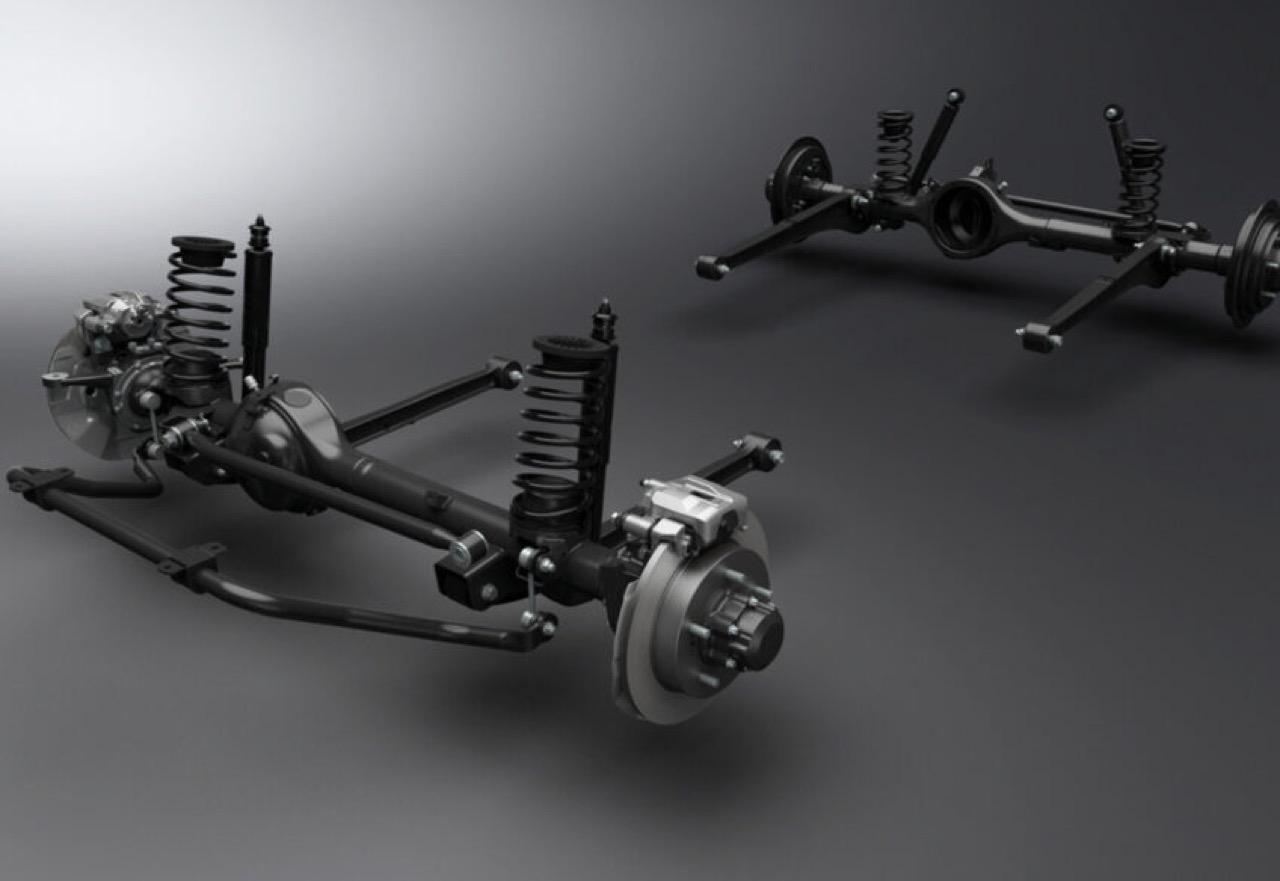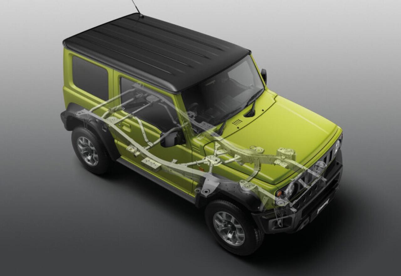 Jimny มีเพลาหน้าและหลังที่มั่นคงแข็งแกร่ง แชสซีเฟรมขั้นบันไดแบบดั้งเดิมรองรับการลุยฝ่าทางวิบากที่รถทั่วไปเข้าไม่ถึง นับตั้งแต่ปี พ.ศ. 2530 จนถึงปัจจุบัน มีรถออฟโรด 4X4 ไม่มากนักที่มีสายเลือดทางวิศวกรรมแบบนี้ การติดตั้งระบบขับเคลื่อน ช่วงล่างและชิ้นส่วนต่างๆ แบบดั้งเดิมซึ่งใช้แนวคิดเรียบง่ายแบบอนุรักษนิยม ให้ความสะดวกต่อการตกแต่งดัดแปลง หรือซ่อมบำรุงได้ง่ายกว่ารถออฟโรดทั่วไป