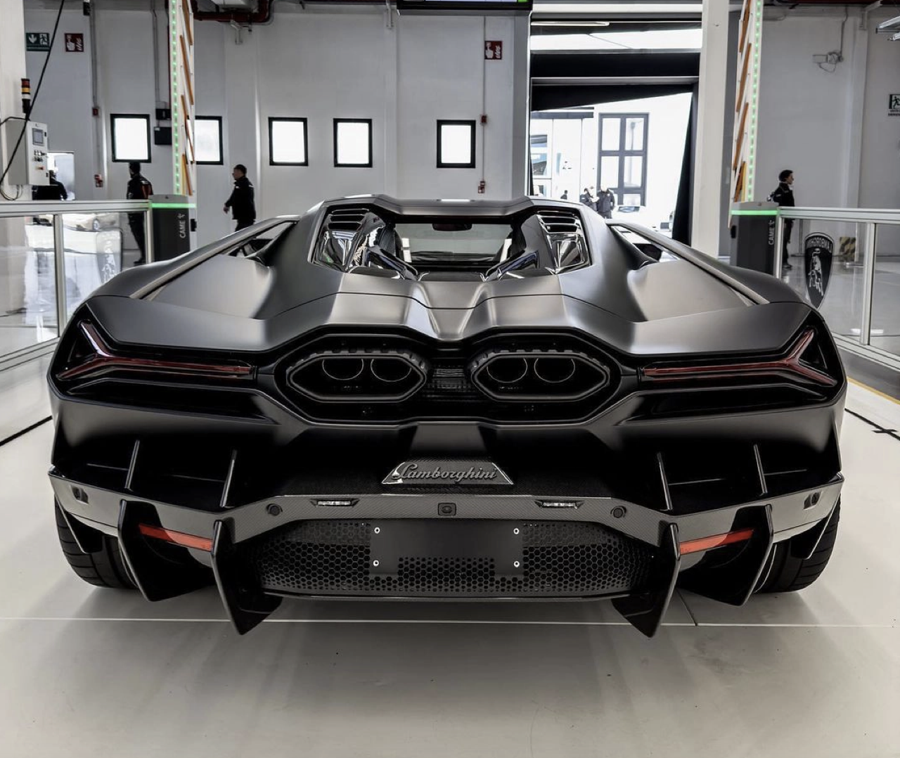 การออกแบบส่วนท้ายรถให้ความสำคัญกับการติดตั้งระบบไฮบริด เครื่องยนต์ V12 ซึ่งเครื่องยนต์ที่ติดตั้งตามแนวยาวแบบเปิดโล่ง ถือเป็นหัวใจสำคัญของ Revuelto เชื่อมต่อไปยังชุดท่อไอเสียคู่รูปหกเหลี่ยม ปีกทรงเรขาคณิต โอบล้อมด้วยชุดไฟหน้ารูปตัววาย “Y”