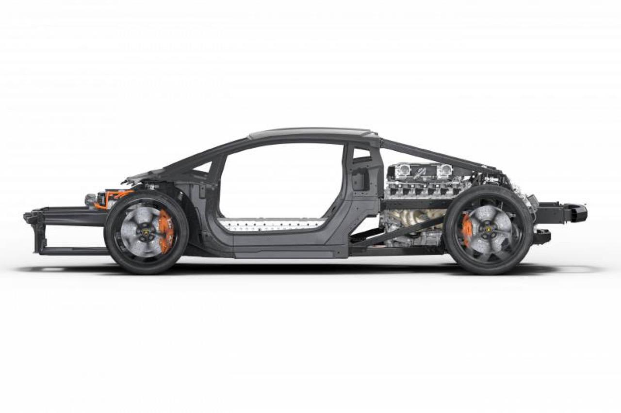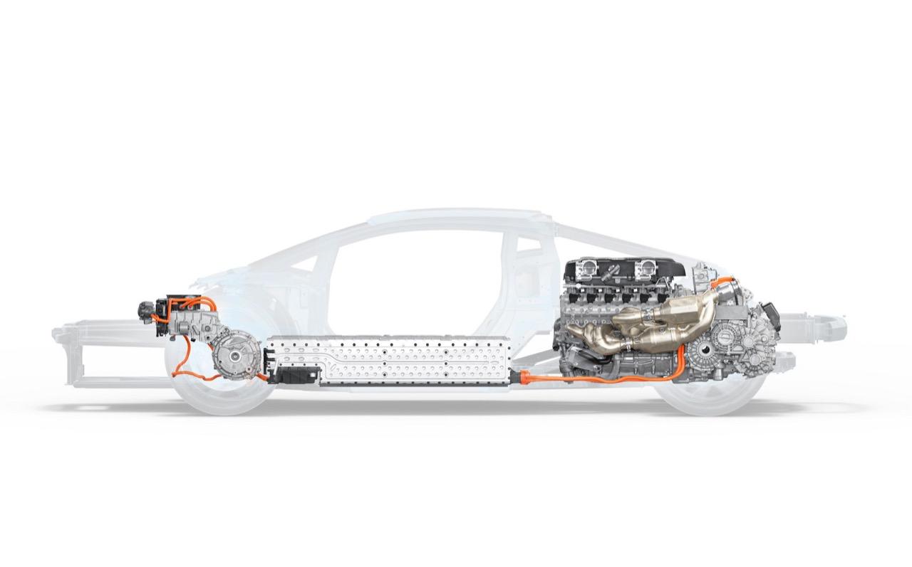 เลย์เอาต์การวางตำแหน่งเครื่องยนต์ ติดตั้งเครื่องยนต์ V12 แบบไร้ระบบอัดอากาศขนาด 6.5 ลิตร บริเวณกลางตัวรถ มอเตอร์ไฟฟ้า 3 ตัว มอเตอร์ไฟฟ้า 2 ตัวแรก จะอยู่ที่เพลาขับคู่หน้า อีก 1 ตัว ติดตั้งอยู่กับชุดเกียร์ดับเบิลคลัตช์ 8 สปีดรุ่นใหม่ เป็นครั้งแรกที่ชุดเกียร์ถูกติดตั้งอยู่หลังเครื่องยนต์ เป็นการติดตั้งแนวขวางอยู่ด้านหลังเครื่องยนต์สันดาป V12 พื้นที่ของอุโมงค์เกียร์ที่มีมาตั้งแต่ Countach ถูกแทนที่ด้วยแบตเตอรี่ลิเธียมไอออนพลังสูง เพื่อใช้ในการขับเคลื่อนมอเตอร์ไฟฟ้า