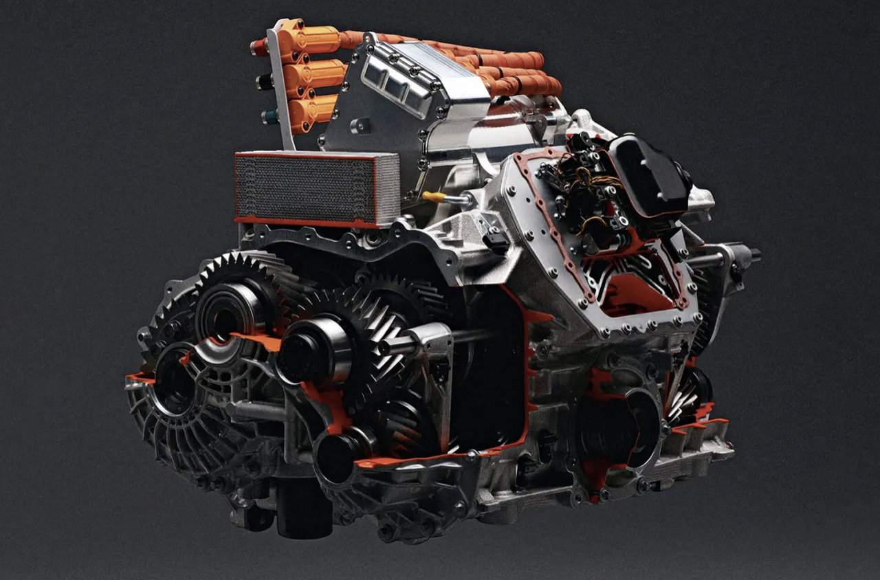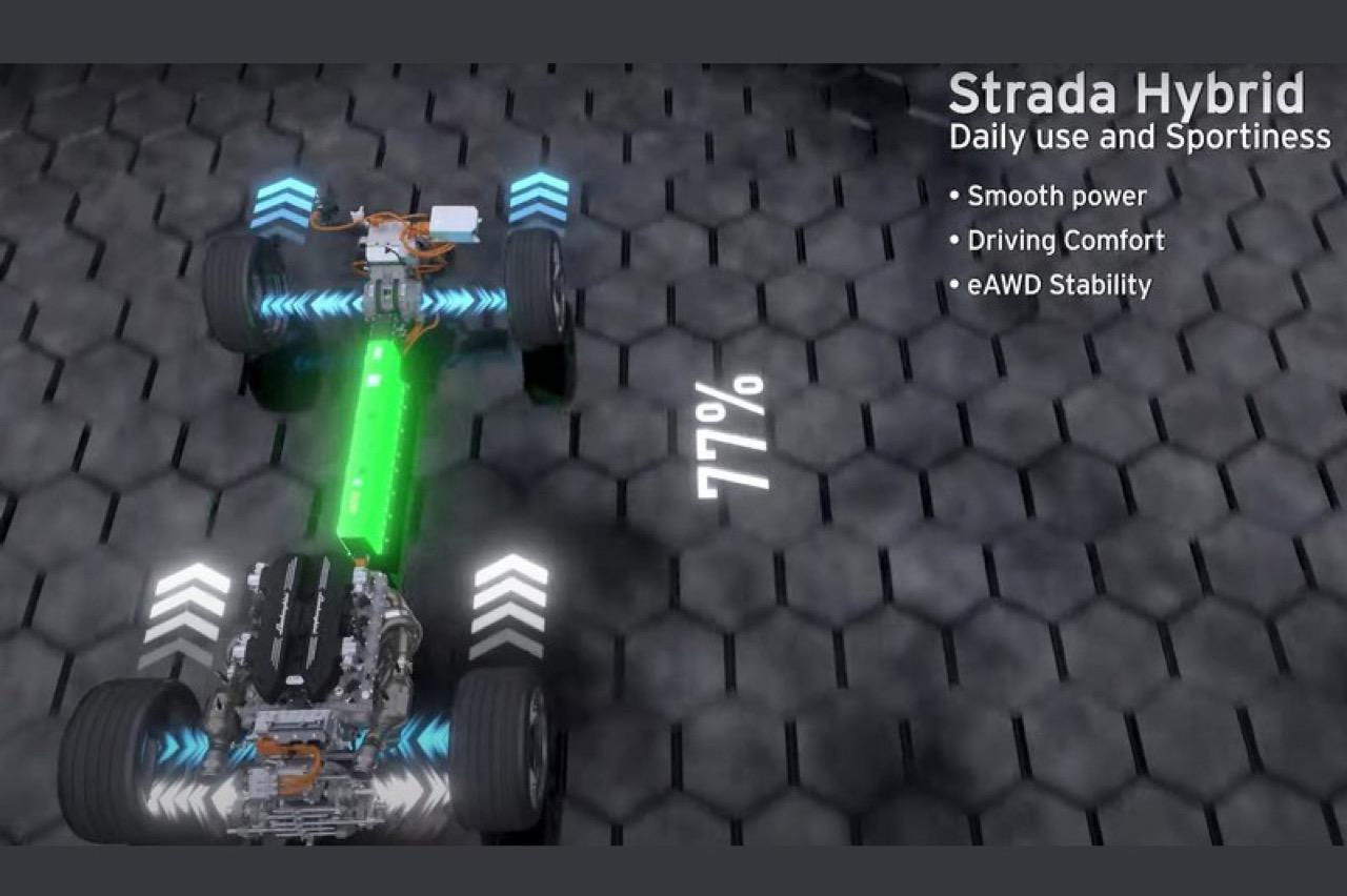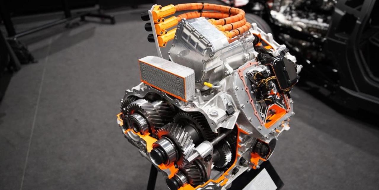 ในขณะที่เครื่องยนต์สันดาปภายในถ่ายกำลังให้กับล้อหลัง มอเตอร์ไฟฟ้าคู่ให้กำลังแรงบิดกับเพลาหน้า มอเตอร์แต่ละตัว จะสร้างแรงบิดในล้อหน้าแต่ละข้าง มอเตอร์ไฟฟ้าตัวที่สาม วางอยู่เหนือชุดเกียร์ดับเบิลคลัตช์ 8 สปีด ช่วยเสริมแรงบิดล้อหลัง ขึ้นอยู่กับโหมดการขับที่เลือกและสภาพของพื้นถนน แรงบิดรวมจากเครื่องยนต์สันดาปและมอเตอร์ไฟฟ้า 3 ตัว ด้วยแรงบิดสูงสุด 725 นิวตันเมตร จากเครื่องยนต์สันดาปภายใน และอีก 350 นิวตันเมตร จากมอเตอร์หน้าแต่ละตัว