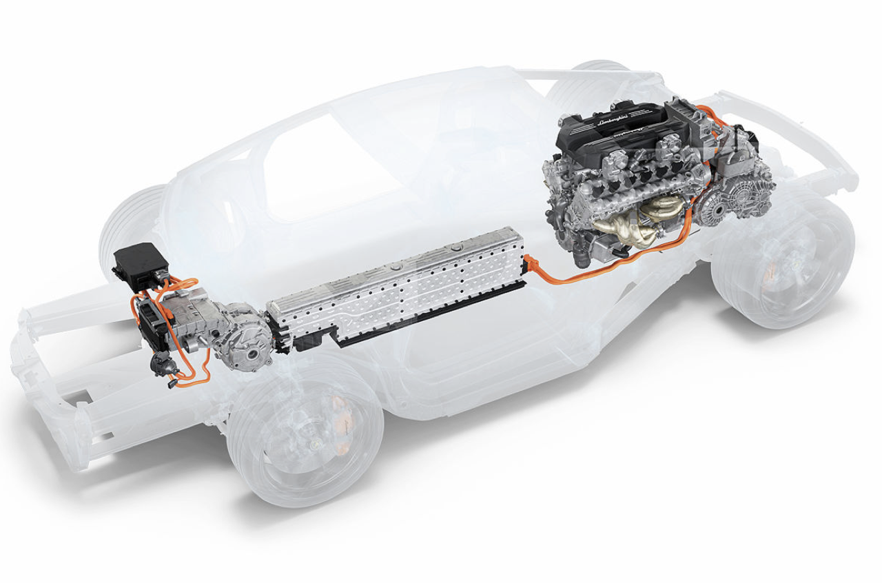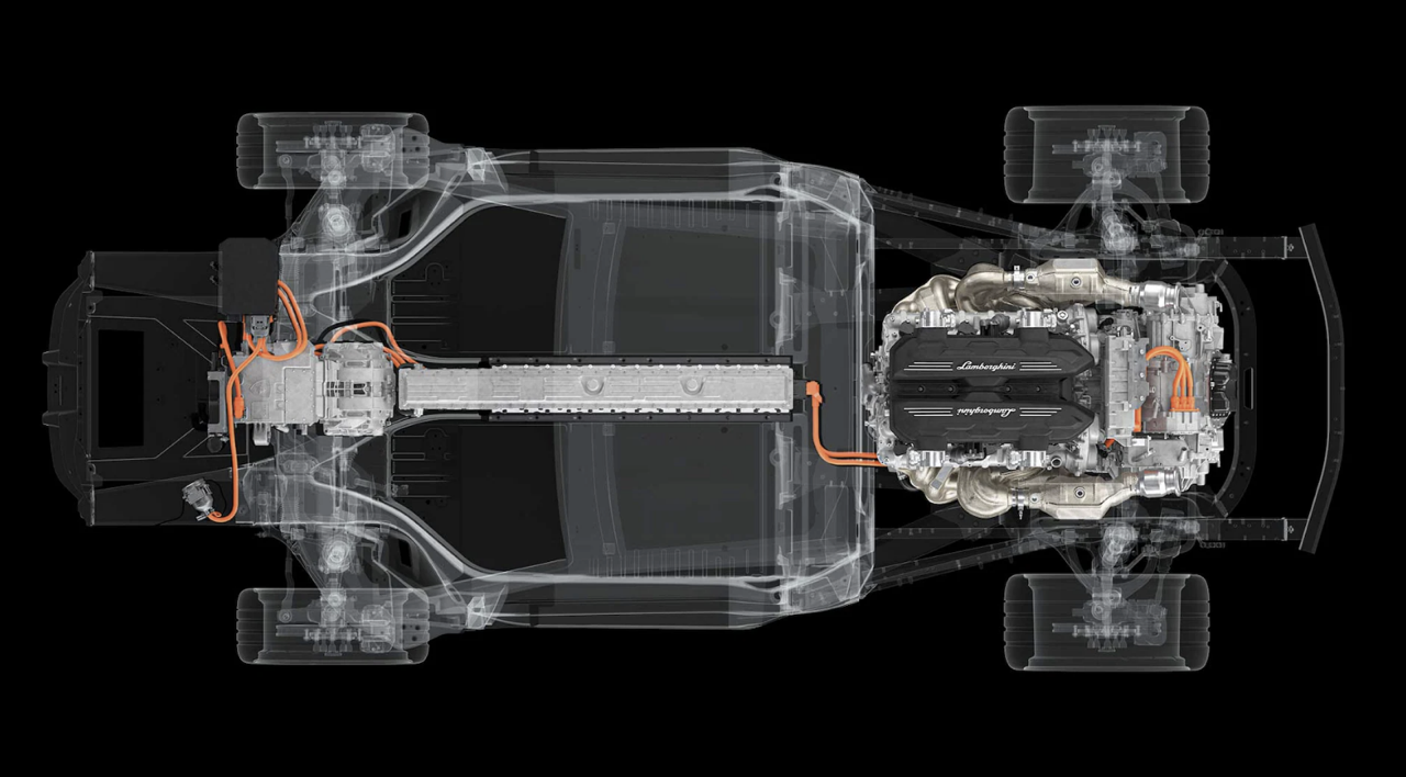 ระบบส่งกำลังประสานพลังของเครื่องยนต์สันดาปรุ่นใหม่ ที่มีค่ากำลังจำเพาะ 128 CV ต่อลิตร ทำงานร่วมกับมอเตอร์ไฟฟ้า Axial Flux Motor ด้านหน้า 2 ตัว ให้อัตราส่วนน้ำหนักต่อแรงม้าที่ดี ร่วมกับมอเตอร์ไฟฟ้าแบบ Radial Flux Electric Motor อีก 1 ตัว ติดตั้งด้านบนชุดเกียร์ดับเบิลคลัตช์ 8 สปีดดีไซน์ใหม่ ซึ่งเปิดตัวเป็นครั้งแรกใน Lamborghini เครื่องยนต์ 12 สูบ มอเตอร์ไฟฟ้า 3 ตัวใช้พลังงานจากแบตเตอรี่ลิเธียมไอออนกำลังสูง (4,500 วัตต์ต่อกิโลกรัม) รองรับโหมดการขับขี่แบบไฟฟ้า 100% ได้