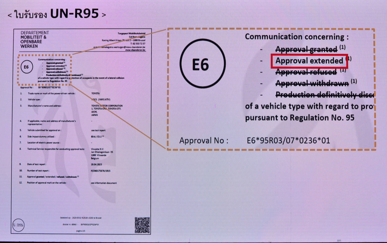 หลังจากทดสอบการชนปะทะที่ด้านข้าง Toyota Yaris ATIV ผ่านการทดสอบมาตรฐานการชนด้านข้าง และได้รับการรับรองจากหน่วยงานภายนอกที่มีอำนาจในการตรวจสอบมาตรฐาน เป็นหนึ่งในคุณสมบัติด้านความปลอดภัยของรถยนต์ประหยัดพลังงานมาตรฐานสากล รุ่นที่ 2 (ECO Car 2) ตามข้อกำหนดของกระทรวงอุตสาหกรรม ซึ่งต้องผ่านการทดสอบคุณสมบัติต่างๆ ตามมาตรฐานสากล Toyota Motor ได้ยื่นผลทดสอบที่ผ่านตามมาตรฐานการชนด้านข้าง UN R95 ที่ออกโดยหน่วยงานทดสอบการชนที่เป็นสากล ให้กับกระทรวงอุตสาหกรรมรับทราบ หลังจากนั้น จึงได้รับการรับรองจากกระทรวงอุตฯ ว่า รถ Toyota Yaris Ativ ผ่านมาตรฐานการทดสอบการชนปะทะด้านข้าง UN R95