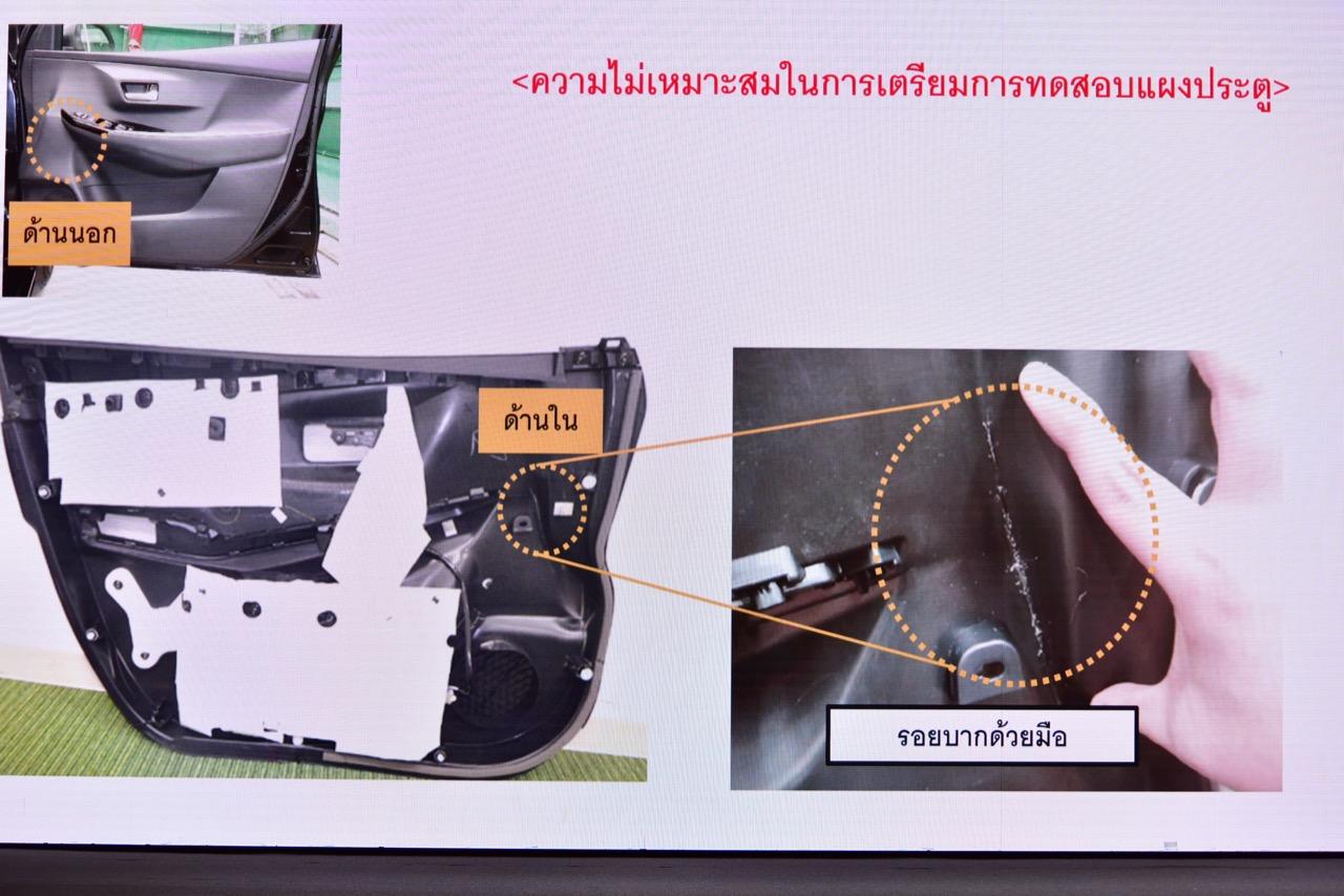 การชนด้านข้างตามมาตรฐาน UN R95 เมื่อเดือนเมษายนปี 2565 มีการตรวจพบความไม่สมบูรณ์ของรถยนต์ที่ใช้ทดสอบ โดยตรวจพบว่า มีรอยบากบริเวณด้านข้างแผงประตูรถยนต์ฝั่งคนขับ ซึ่งเกิดขึ้นก่อนนำรถไปทดสอบตามมาตรฐาน UN R95 และมีข่าวแพร่สะพัดออกมา ทำให้เกิดความไม่มั่นใจในมาตรฐานความปลอดภัยของรถยนต์ Toyota Yaris ATIV หลังจาก Toyota Motor ตรวจพบความไม่สมบูรณ์ของรถทดสอบ จากรอยบากดังกล่าว จึงมีการชี้แจงเรื่องที่เกิดขึ้นผ่านสื่อมวลชน และระงับการขายรถยนต์ Yaris Ativ แล้วจึงทำการทดสอบใหม่อีกครั้ง เพื่อทำให้เกิดความมั่นใจในมาตรฐานของรถยนต์ Toyota ที่ผลิตและจำหน่ายทั่วโลก