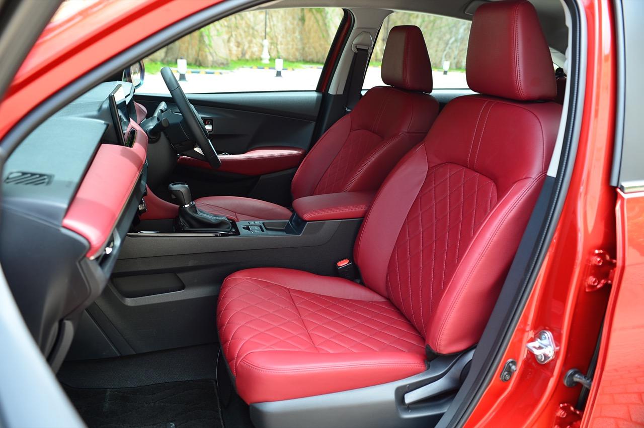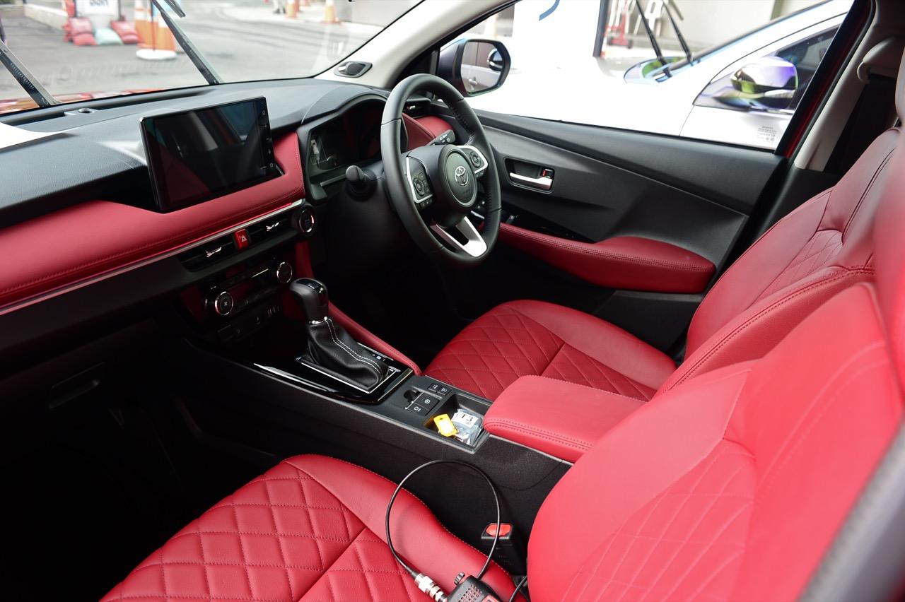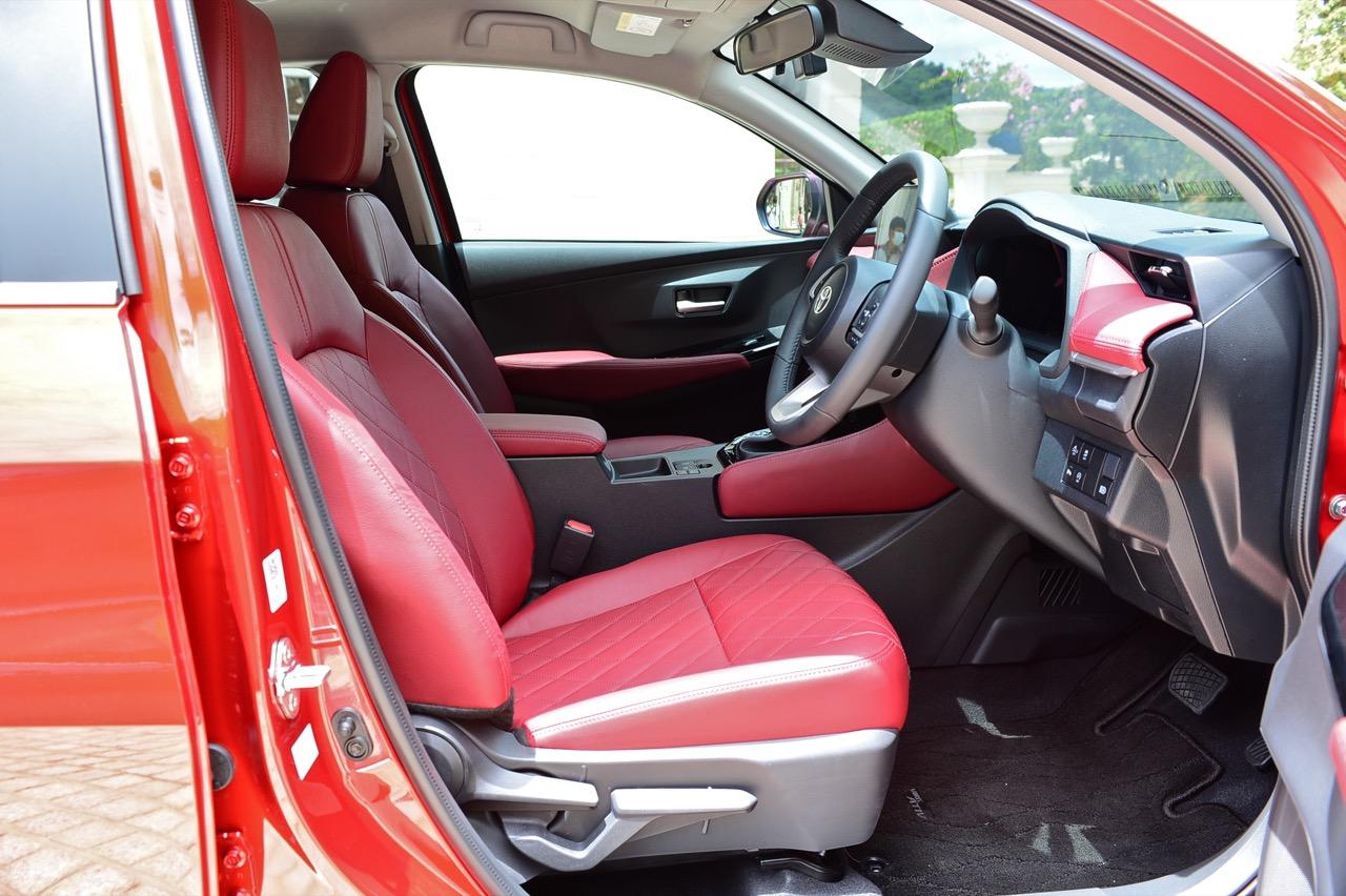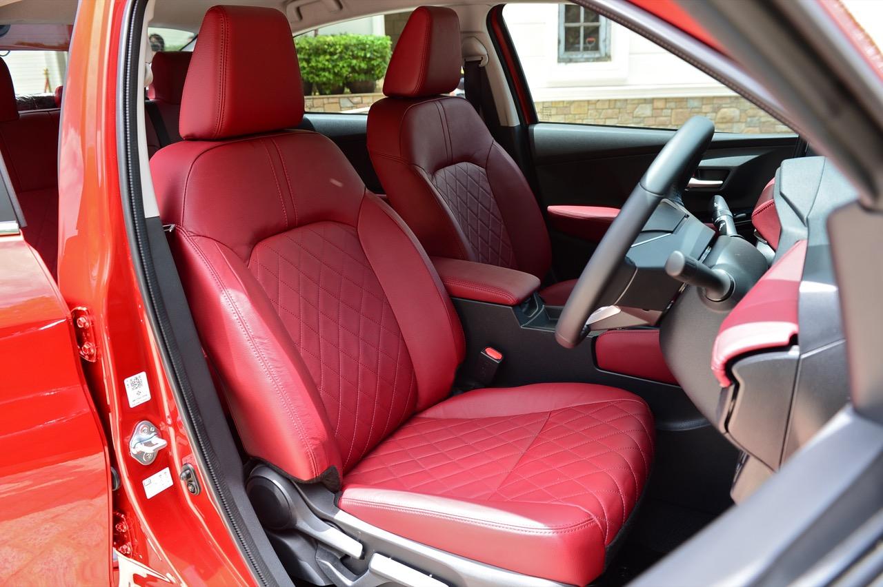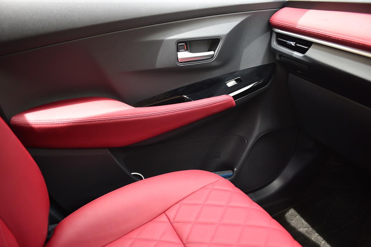 Yaris Ativ 2022 รุ่น Premium Luxury ราคา 6.99 แสนบาท มีเบาะคู่หน้าปรับมือ หุ้มด้วยหนังแท้สีแดง และภายในบางจุดที่ตกแต่งด้วยหนังสังเคราะห์สีแดงบริเวณแผงประตูที่มือจับและกึ่งกลางของแดชบอร์ด หนังสีเจ็บ เย็บเดินตะเข็บด้วยด้ายแดง เพิ่มความหรูหราให้กับห้องโดยสารของรถเล็กราคาประหยัด ส่วนรุ่นที่รองลงไปอย่าง Premium จะได้เบาะหนังสีดำที่นั่งได้สบายพอๆ กัน เบาะด้านหน้ายังออกแบบด้านหลังให้เป็นกระเป๋าเก็บของกระจุกกระจิก สำหรับเบาะหลังมีพื้นที่เหนือกบาลน้อยไปนิดสำหรับคนที่สูงเกิน 175 เซนติเมตร สำหรับพื้นที่วางเท้ามีให้อย่างพอเพียง นั่งแล้วความนิ่มของเบาะหลังจะทำให้คนนั่งรู้สึกสบาย