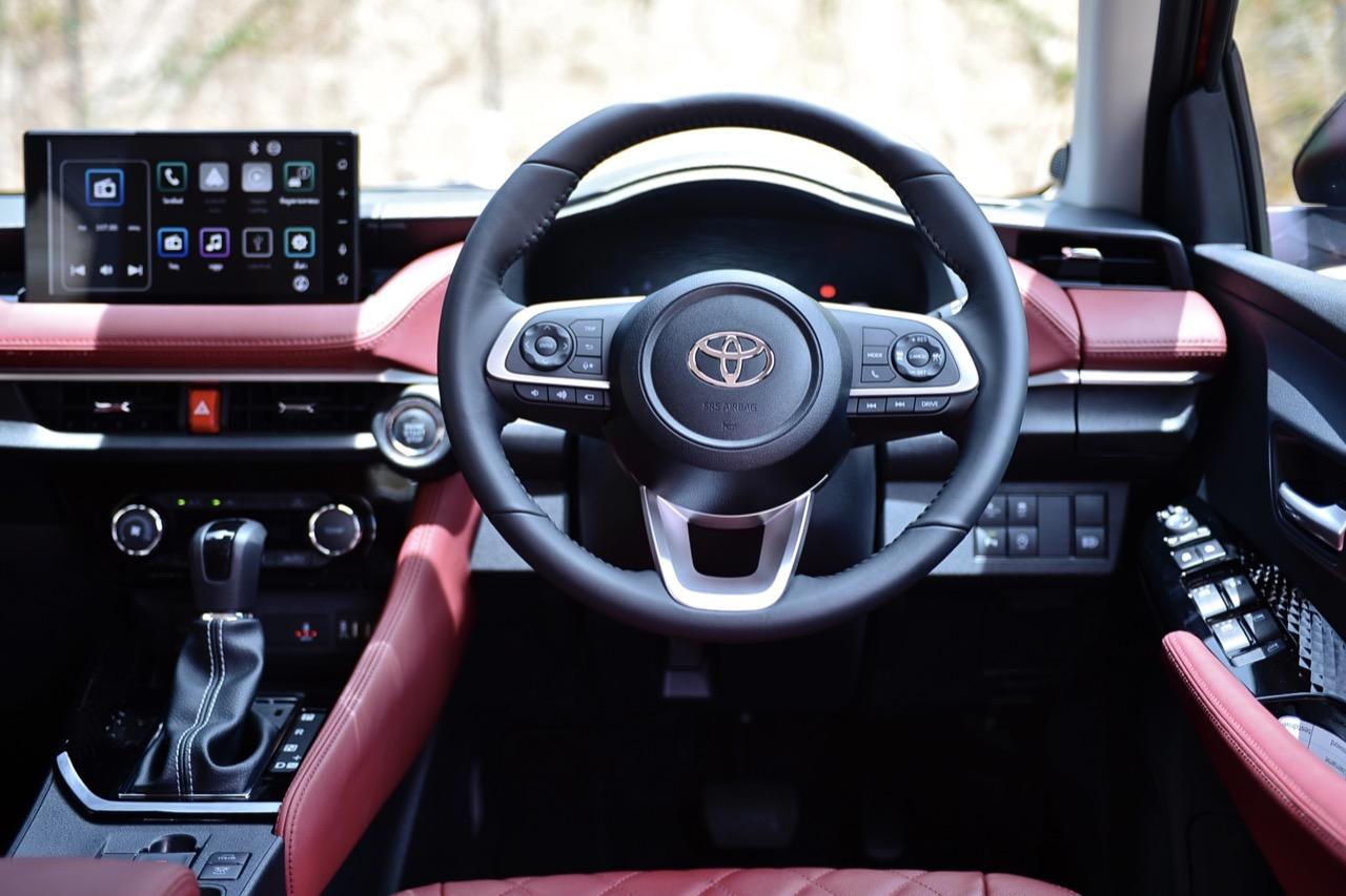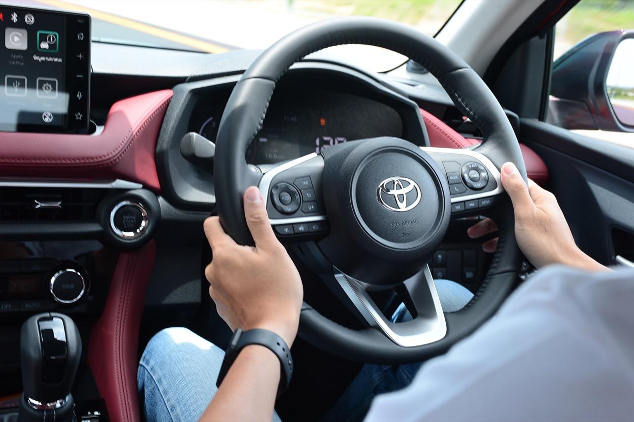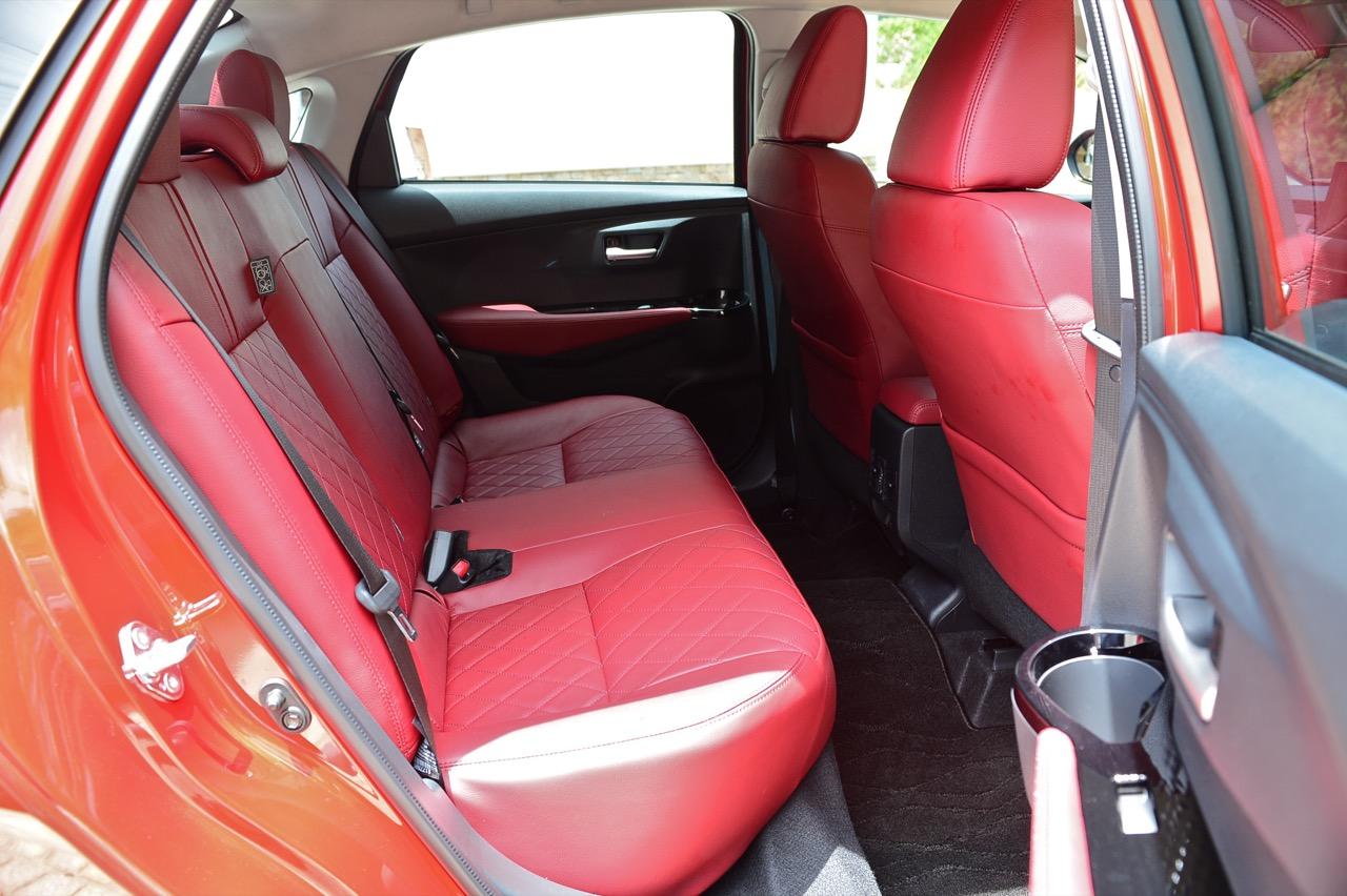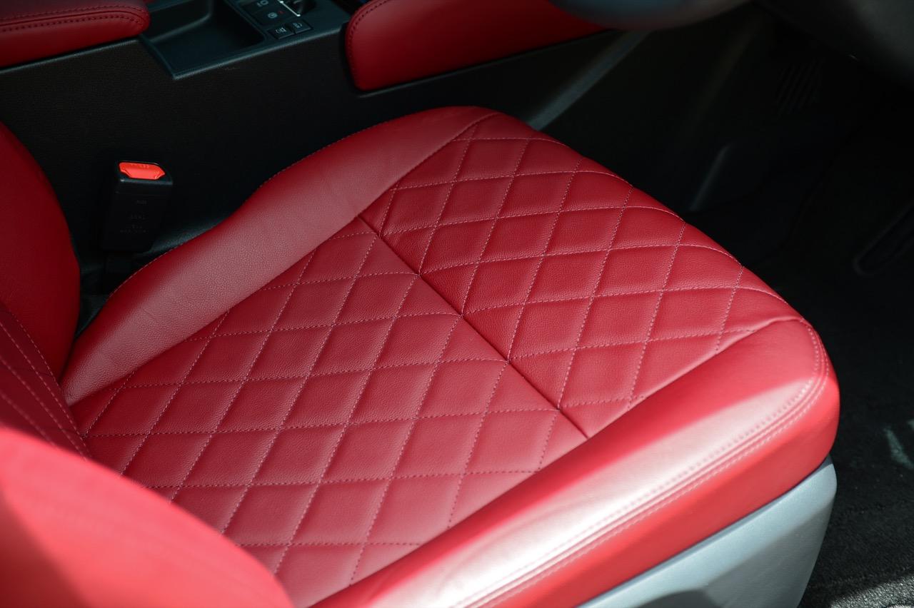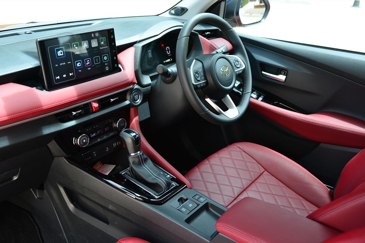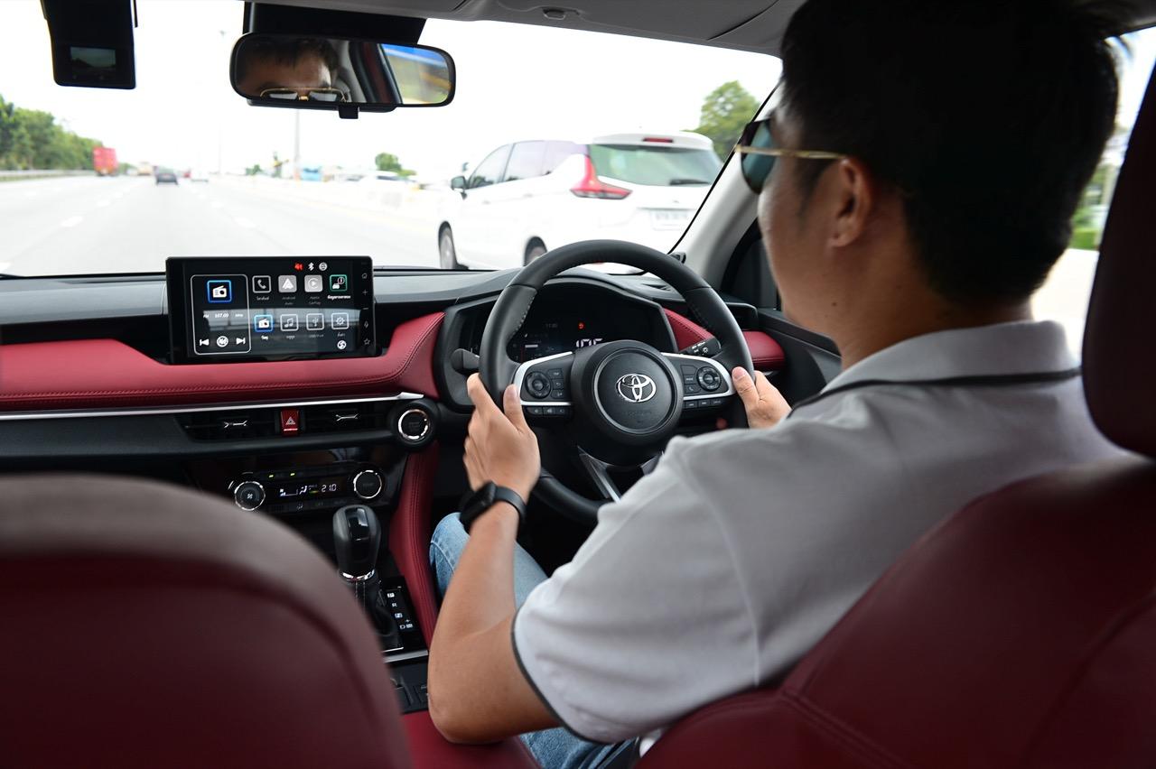 Yaris Ativ 2022 รุ่น Premium Luxury ราคา 6.99 แสนบาท มีเบาะคู่หน้าปรับมือ หุ้มด้วยหนังแท้สีแดง และภายในบางจุดที่ตกแต่งด้วยหนังสังเคราะห์สีแดงบริเวณแผงประตูที่มือจับและกึ่งกลางของแดชบอร์ด หนังสีเจ็บ เย็บเดินตะเข็บด้วยด้ายแดง เพิ่มความหรูหราให้กับห้องโดยสารของรถเล็กราคาประหยัด ส่วนรุ่นที่รองลงไปอย่าง Premium จะได้เบาะหนังสีดำที่นั่งได้สบายพอๆ กัน เบาะด้านหน้ายังออกแบบด้านหลังให้เป็นกระเป๋าเก็บของกระจุกกระจิก สำหรับเบาะหลังมีพื้นที่เหนือกบาลน้อยไปนิดสำหรับคนที่สูงเกิน 175 เซนติเมตร สำหรับพื้นที่วางเท้ามีให้อย่างพอเพียง นั่งแล้วความนิ่มของเบาะหลังจะทำให้คนนั่งรู้สึกสบาย