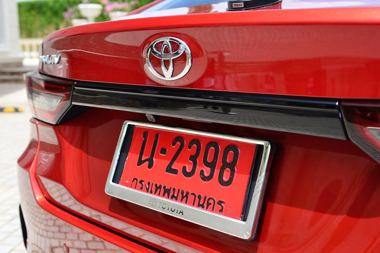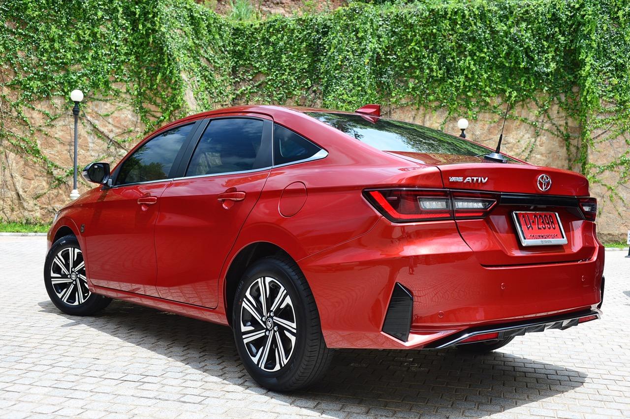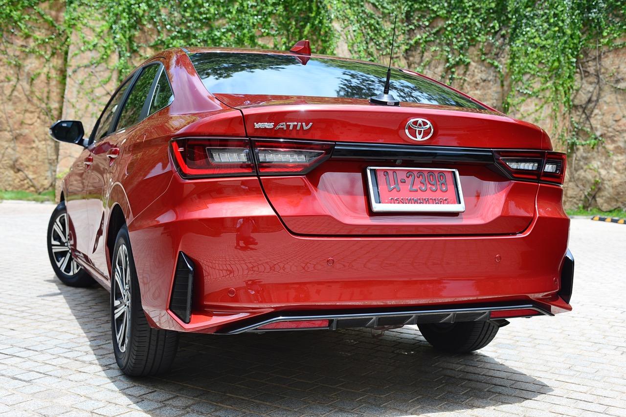 พื้นที่เก็บสัมภาระ เก็บของได้อย่างจุใจ เช่น ช่องเก็บรองเท้าและของกระจุกกระจิกด้านล่าง แสดงถึงความใส่ใจในการออกแบบเพื่อเน้นความอเนกประสงค์ของการใช้งาน ส่วนท้ายของ New Yaris Ativ ติดตั้งไฟท้ายทรงยาวแบบสองชิ้น เดินเส้นพลาสติกเชื่อมไฟท้ายทั้งสองข้างด้วยพลาสติกสีดำ ไฟท้าย LED หลอดไฟท้ายเป็นแบบผสม ทั้งหลอดไฟ LED และหลอดไฟแบบปกติ ฝากระโปรงท้ายออกแบบให้มีขนาดที่ใหญ่ เพื่อเพิ่มพื้นที่ความจุภายใน กันชนหลังสอดรับกับทรงของฝากระโปรงหลัง ตกแต่งชายล่างของกันชนหลังด้วยชิ้นงานที่ทำเลียนแบบครีบรีดอากาศดิฟฟิวเซอร์ พร้อมพลาสติกสะท้อนแสงมัลติรีเฟกเตอร์เพิ่มความปลอดภัยเมื่อจอดในที่มืด ไฟเบรกดวงที่สามติดตั้งอยู่หลังกระจกบังลมบานหลังตรงตำแหน่งกึ่งกลางของตัวรถเพื่อทำให้สังเกตได้ง่าย จุดที่ทำออกมาได้ดีก็คือ ฝาถังน้ำมันทรงกลมที่อยู่บนเส้นข้างตัวถัง จุดเด่นของการใช้งานอีกอย่าง อยู่ในพื้นที่เก็บของใต้ฝาท้ายที่ให้มาอย่างจุใจ เรียกว่ายัดกระเป๋าใบใหญ่หรือถุงกอล์ฟได้หลายใบ