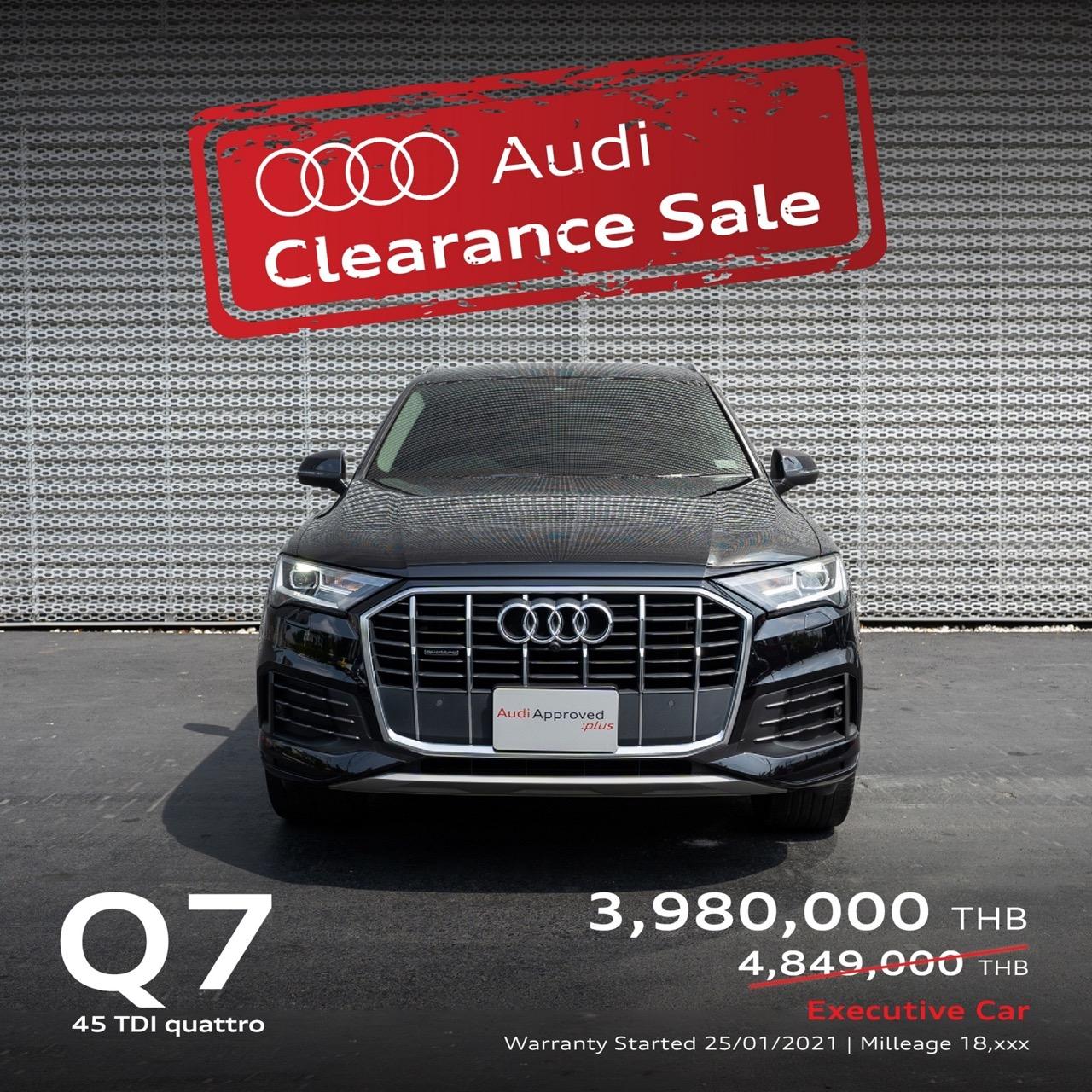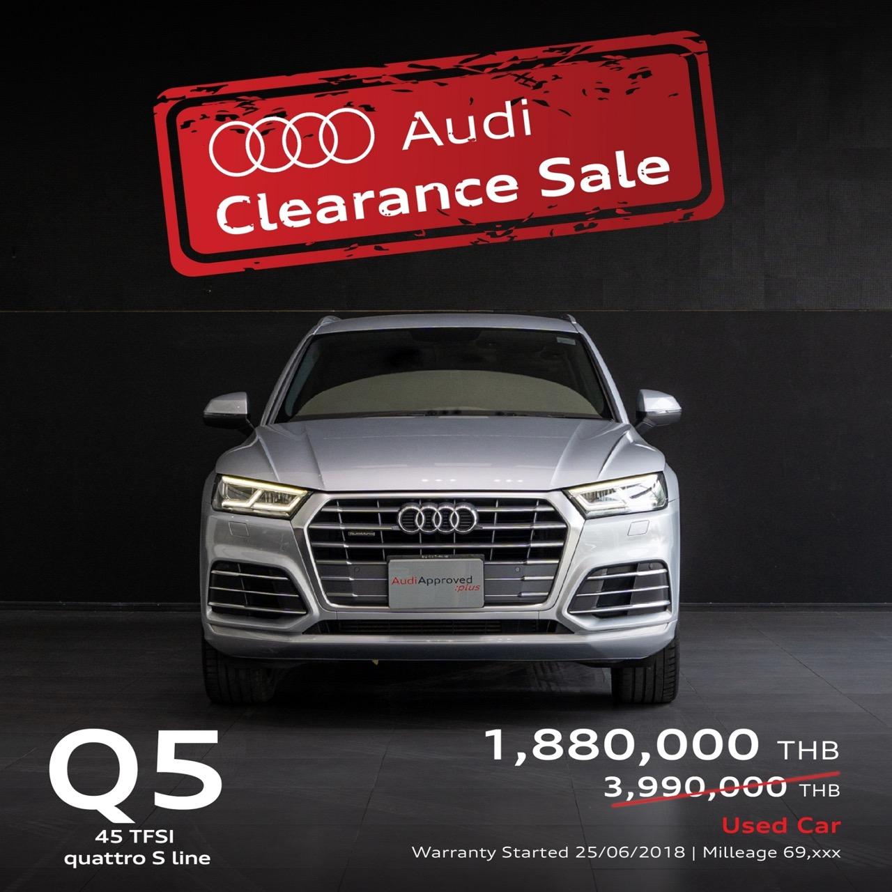 Audi Thailand มั่นใจว่ากิจกรรม “Audi Clearance Sale” จะได้รับความสนใจจากแฟน Audi ทั่วประเทศ ที่รอแฟลชดีลพิเศษ ราคาเดือดจากงานนี้ รถทดลองขับ รถผู้บริหารป้ายแดง ไมล์น้อย และรถยูสคาร์ที่นำมาจัดรายการในรอบนี้ล้วนเป็นรุ่นยอดฮิต หลากหลายรุ่น และแต่ละรุ่นลดเป็นล้าน