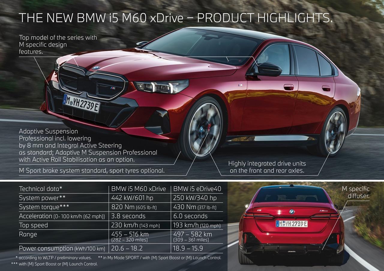 i5 M60 xDrive มอเตอร์ไฟฟ้าคู่ วางเหนือเพลาขับเคลื่อนล้อหน้าและล้อหลัง มอเตอร์คู่ให้กำลัง 590 แรงม้า แรงบิด 820 นิวตันเมตร หรือ 605 ปอนด์-ฟุต และเมื่อเปิดใช้งาน M Sport Boost พลังงานหลักจะเพิ่มเสริมเข้ามาอีก 60 แรงม้า โหมด M Launch Control เร่งจาก 0-100 กิโลเมตรต่อชั่วโมงใน 3.8 วินาที และทำความเร็วได้ถึง 240 กิโลเมตรต่อชั่วโมง และถูกจำกัดความเร็วสูงสุดด้วยระบบอิเล็กทรอนิกส์ มีแป้นเปลี่ยนเกียร์ที่ระบุว่าเป็น "Boost" ซึ่งอาจเป็นสิ่งที่ยอดเยี่ยมที่สุดที่ BMW มอบให้กับลูกค้าขาโหด ด้วยราคา $84,100 คิดเป็นเงินไทยยังไม่รวมภาษีนำเข้าและส่วนต่างยานยนต์ไฟฟ้าที่ได้รับการสนับสนุนจากภาครัฐ จะอยู่ที่ 2,915,000 บาท