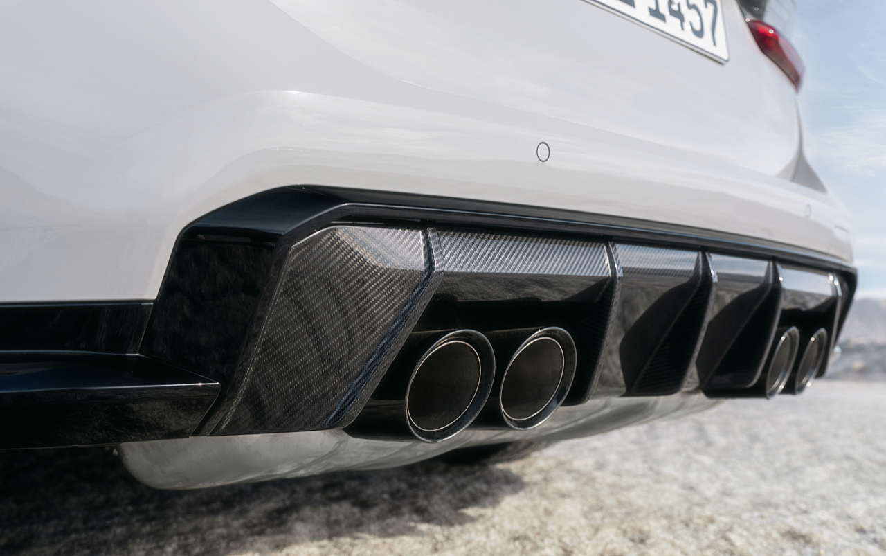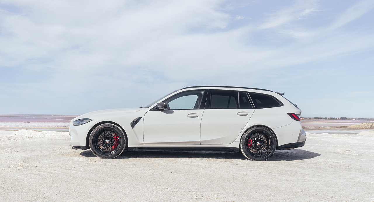 BMW M3 Competition M xDrive Touring ยาวกว่า M3 G80 และ M4 G82 มิติตัวถัง มีขนาดความยาว 4,801 มิลลิเมตร กว้าง 1,903 มิลลิเมตร สูง 1,446 มิลลิเมตร ความยาวฐานล้อ 2,857 มิลลิเมตร ความกว้างล้อหน้า 1,617 มิลลิเมตร ความกว้างล้อหลัง 1,645 มิลลิเมตร ความสูงจากพื้นถึงใต้ท้องรถ 123 มิลลิเมตร น้ำหนัก 1,940 กิโลกรัม ทรงของมันเมื่อมองจากด้านข้างจะมีความปราดเปรียวผสมกับความดุดันของโป่งซุ้มล้อกับล้ออัลลอย M ขอบ 20 นิ้ว ยาง Pilot Sport 4S ยางหน้า 275/35ZR19 ยางหลัง 285/30ZR20 ตัวถังแวกอนกับการใช้งานจริงในชีวิตประจำวัน ความสามารถในการวิ่งครอบคลุมระยะทางไกล การออกแบบภายนอก พื้นผิวและรูปทรงที่แข็งแกร่ง ให้ความสำคัญกับแอโรไดนามิกส์ ด้วยระบบอากาศพลศาสตร์ที่บังคับกระแสลมสำหรับการระบายความร้อนและเพิ่มความสมดุลของรถ กระจังหน้ารูปไตคู่แนวตั้งแบบไร้กรอบ การจัดวางในแนวตั้งที่เชื่อมโยงกับ BMW 2000 CS ในยุค 1960 ช่องดักอากาศด้านข้างขนาดใหญ่ ซุ้มล้อพร้อมโป่งที่ทำให้รถดูทรงพลัง สเกิร์ตข้างขยายออกอย่างเด่นชัด ชิ้นส่วนยึดสำหรับกันชนหน้าและหลัง ด้วยแถบพลาสติกสีดำเงารอบคัน แผงด้านข้าง M ฝากระโปรงมีเส้นที่เชื่อมกับแนวขอบของกระจังหน้าแนวตั้ง แผงด้านข้าง ปลายท่อไอเสีย กันชนหลัง BMW M3 Touring หลังคาสีดำไฮกลอส แรคหลังคา ลิ้นอากาศ Gurney บนสปอยเลอร์หลังคาที่มีเฉดสีเดียวกัน สามารถเลือกสีของหลังคาให้เป็นสีเดียวกับตัวถัง ชุดแต่งภายนอก M Carbon เป็นออปชั่นเสริมที่เจ้าของรถต้องควักเงินเพิ่มหากอยากได้