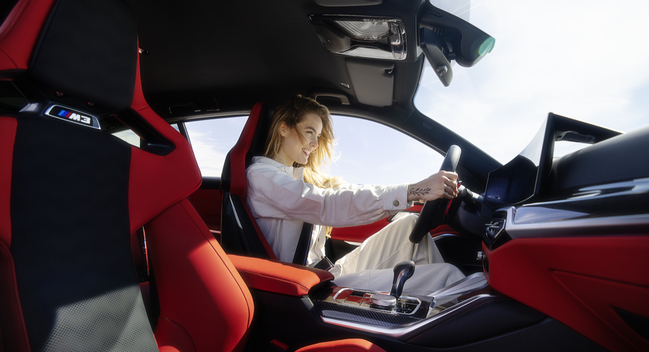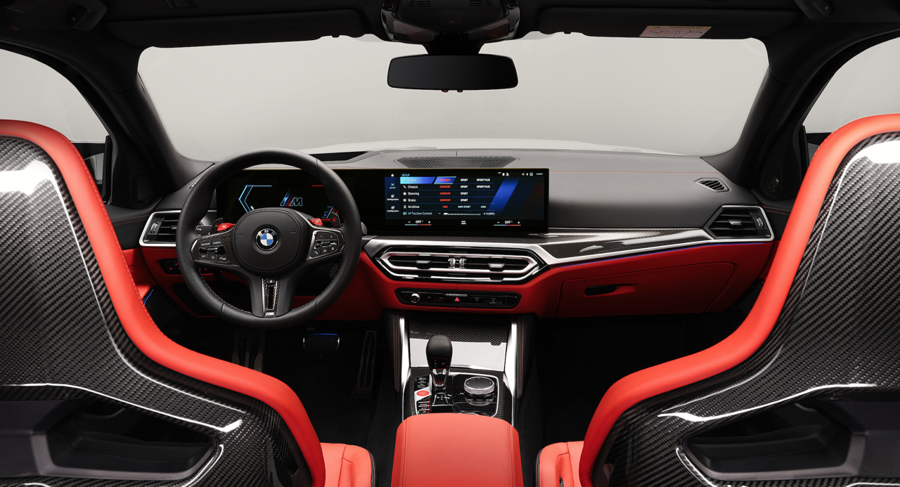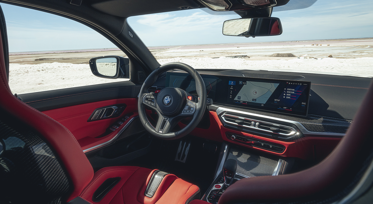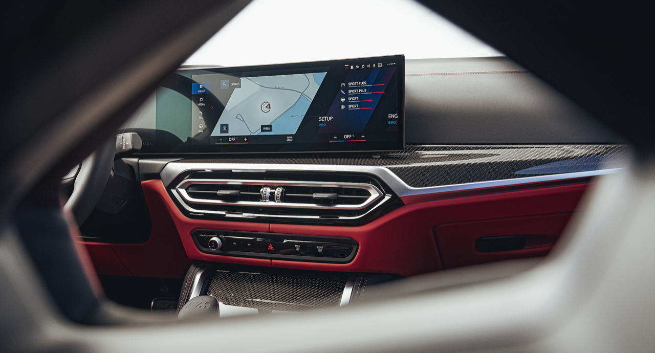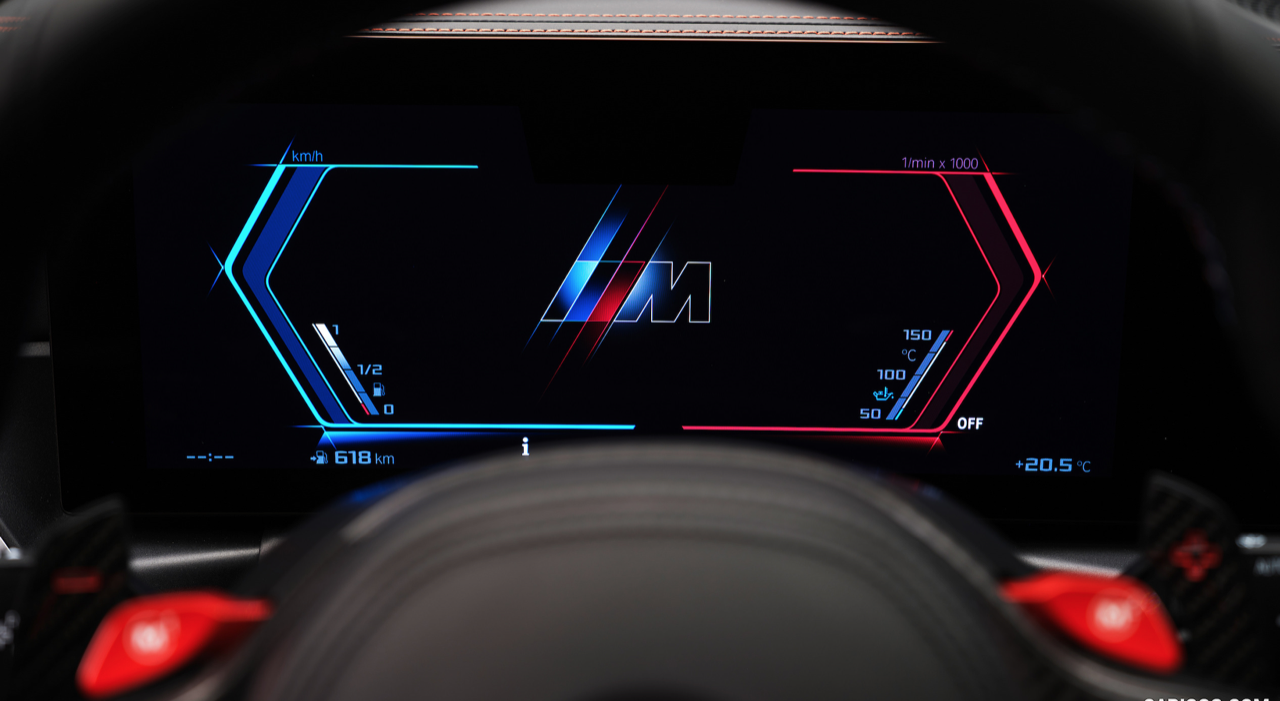 BMW Curved Display อุปกรณ์มาตรฐานใน BMW M3 Touring การตีความใหม่เกี่ยวกับการออกแบบห้องโดยสารของ BMW M Car ยุคใหม่ การจัดกลุ่มของหน้าจอดิจิทัลทั้งหมดประกอบด้วยหน้าจอภาพมาตรวัดที่แสดงข้อมูลสำคัญตรงหน้าคนขับ ขนาด 12.3 นิ้ว หลอมรวมกับหน้าจอควบคุมขนาด 14.9 นิ้ว ติดตั้งอยู่ด้านหลังพื้นผิวกระจกแผ่นเดียว โดยทำมุมเข้าหาคนขับ จอแสดงข้อมูลหลังพวงมาลัยแสดง จะข้อมูลการขับขี่ที่เกี่ยวข้องทั้งหมด พร้อมกราฟิกใหม่ในสไตล์เฉพาะของ M พร้อมข้อมูลเกี่ยวกับการตั้งค่ารถและสภาพยาง รวมถึง BMW Head-Up Display
