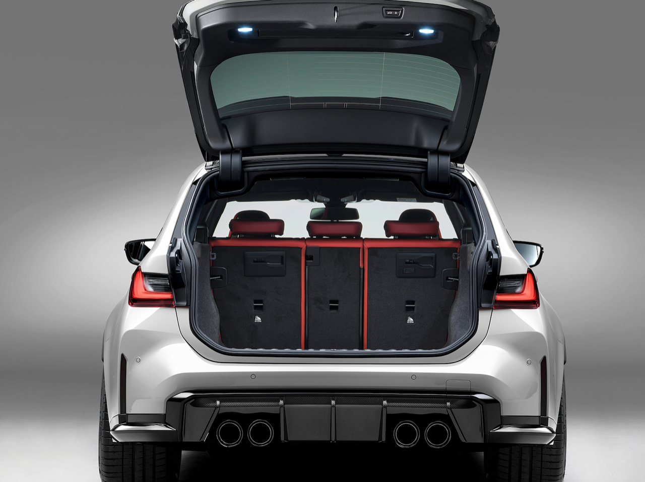 เบาะหลังของ BMW M3 Touring แบบสามที่นั่ง พนักพิงเบาะหลังปรับพับแยกได้ 40 : 20 : 40 การพับเบาะนั่งทีละส่วน หรือทั้งหมด เพิ่มความจุในการบรรทุกจาก 500 ลิตร เป็น 1,510 ลิตร ฝาท้ายระบบไฟฟ้าทำงานอัตโนมัติเมื่อแหย่เท้าไปตรงจุดที่มีเซนเซอร์ ฝาท้ายจะเปิดออกโดยไม่ต้องใช้มือ กระจกหลังบานฝาท้ายมาพร้อมที่ปัดน้ำฝน ช่องเก็บของใต้พื้นห้องเก็บสัมภาระ มีพื้นที่สำหรับฝาปิดช่องเก็บสัมภาระและตาข่ายกั้นห้องเก็บสัมภาระท้ายรถ สามารถสั่งซื้อรางกันลื่นช่วยป้องกันไม่ให้สัมภาระพวกกระเป๋าเดินทางเลื่อนไปมาเมื่อต้องผจญกับทางโค้ง