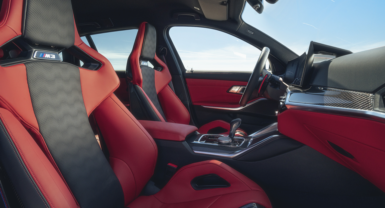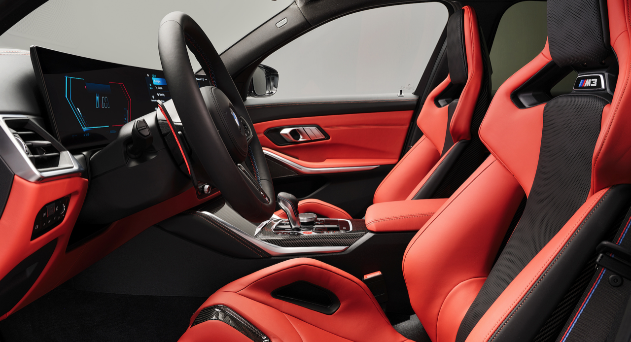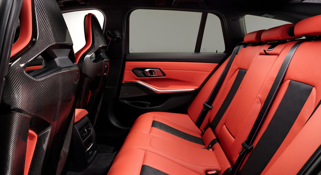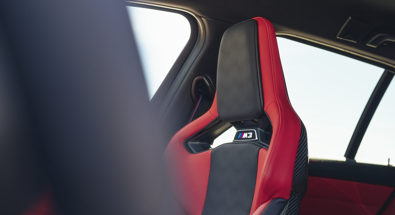 เบาะนั่ง M Sport ปรับด้วยไฟฟ้า พร้อมฟังก์ชั่นหน่วยความจำและระบบอุ่นเบาะนั่ง ตกแต่งด้วยหนัง Merino เป็นอุปกรณ์มาตรฐานใน BMW M3 Touring เบาะนั่งคาร์บอน M สำหรับคนขับและผู้โดยสารตอนหน้า ให้ความรู้สึกเหมือนอยู่ในรถแข่ง เบาะคาร์บอนไฟเบอร์น้ำหนักเบา ผลิตด้วยงานฝีมือที่เน้นความประณีต การใช้พลาสติกเสริมแรงคาร์บอนไฟเบอร์ (CFRP) ในองค์ประกอบโครงสร้างของเบาะนั่งและพนักพิง ร่วมกับคัตเอาต์ใต้พนักพิงศีรษะ ลดน้ำหนักได้มากกว่าเบาะนั่ง M Sport รุ่นมาตรฐานถึง 9.6 กิโลกรัม