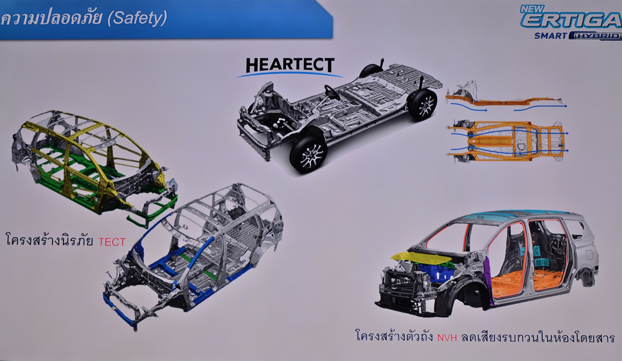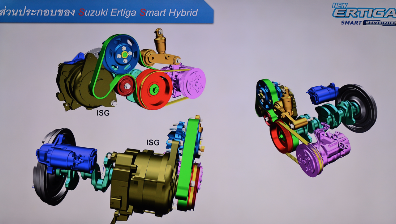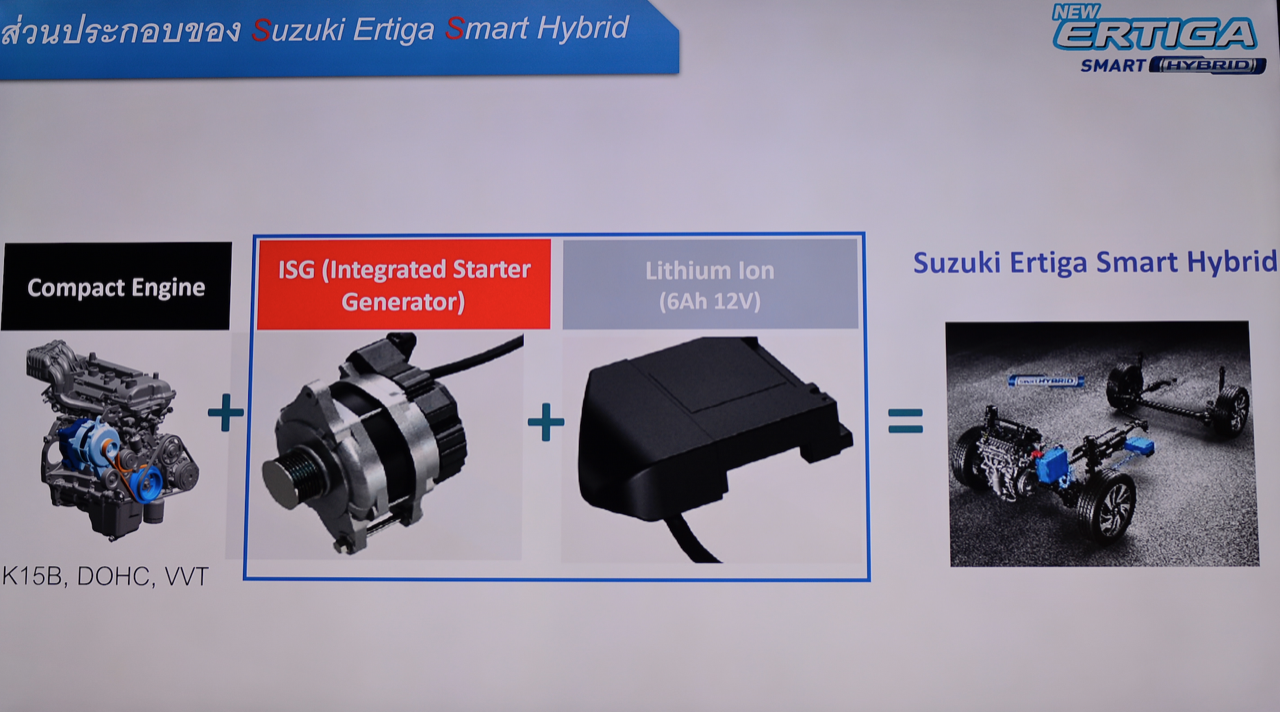 SUZUKI ERTIGA SMART HYBRID เครื่องยนต์เบนซินแถวเรียงสี่สูบ ขนาด 1.5 ลิตร เกียร์อัตโนมัติ มิติความยาว 4,395 มิลลิเมตร กว้าง 1,735 สูง 1,690 มิลลิเมตร เทคโนโลยี SHVS ระบบสมาร์ทไฮบริด มอเตอร์ไฟฟ้า (Integrated Starter Generator หรือ ISG) แบตเตอรี่ Lithium-ION ทำอัตราสิ้นเปลือง 17.9 กิโลเมตรต่อลิตร อัตราการปล่อยก๊าซคาร์บอนไดออกไซด์ 134 กรัม/กิโลเมตร การบำรุงรักษา ไม่แตกต่างจากรถเครื่องยนต์เบนซิน รับประกันอายุแบตเตอรี่นาน 5 ปี