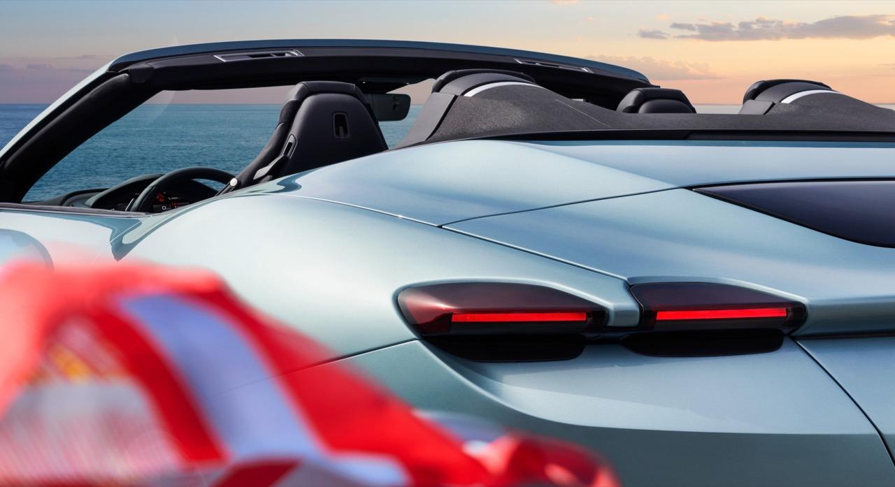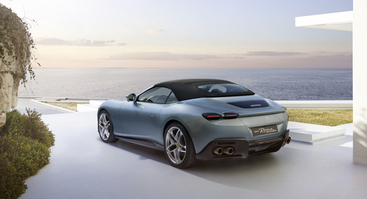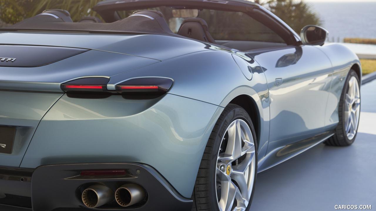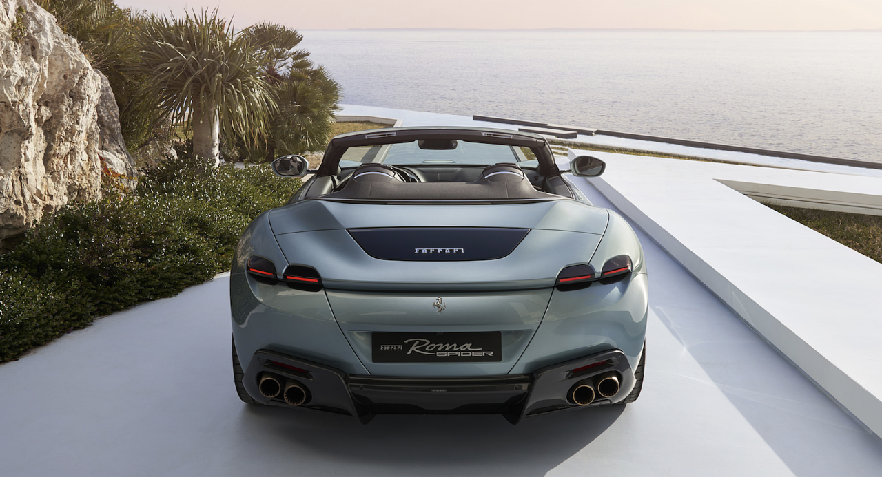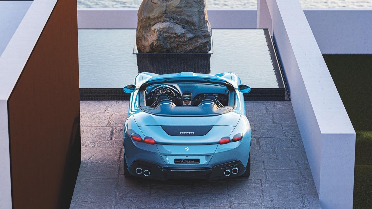 ห้องโดยสารแบบฟาสต์แบ็กมีขนาดกะทัดรัด โหนดด้านล่างที่บอบบาง นักออกแบบได้สร้างสรรค์รูปลักษณ์ที่ทันสมัย ระยะยื่นด้านหลังที่ยาวของ Ferrari Roma Spider เป็นลักษณะเฉพาะของ Ferraris ในช่วงปี 1950 และ 60 ส่วนท้ายเพรียวบาง มีปริมาตรต่ำและกะทัดรัด โอบรับเพลาหลังอย่างลงตัว ส่วนท้ายรถที่โค้งมนเพื่อแสดงออกถึงความทันสมัยของสไตล์การออกแบบส่วนท้าย มีการลดขนาดของชุดไฟท้าย พร้อมงานออกแบบที่เรียบง่าย ด้านหลังเสริมด้วยดิฟฟิวเซอร์แอโรไดนามิกขนาดกะทัดรัด กับปลายท่อไอเสียแบบซุปเปอร์สปอร์ต