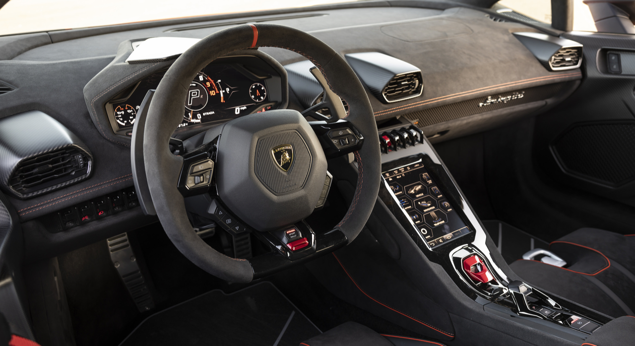 ดีไซน์ห้องโดยสารภายใน แรงบันดาลใจจากเบาะรุ่นเอ็กซ์คลูซีฟใน Alcantara Verde Sterrato ปรัชญา ‘Feel like a pilot’ ประยุกต์ใช้กับรถยนต์ Huracán จอแบบทัชสกรีน พร้อมการแสดงผลด้วยกราฟิกแบบใหม่ ฟีเจอร์พิเศษสำหรับการขับขี่ออฟโร้ด มาตรวัดความลาดเอียงแบบดิจิทัลพร้อมด้วยตัวบอกระยะการยกตัวและการเอียงตัวของรถ เข็มทิศ ตัวบ่งชี้พิกัดทางภูมิศาสตร์ และตัวบ่งชี้มุมบังคับเลี้ยวแบบครบครัน ระบบติดตามรถยนต์ Lamborghini Connect ผสานการทำงานกับ Amazon Alexa เพื่อช่วยในการปรับแต่งฟีเจอร์การทำงานต่างๆ ของรถ เช่น เครื่องปรับอากาศและไฟส่องสว่าง รวมถึงการควบคุมและระบบนำทาง การคุยสายโทรศัพท์และความบันเทิง ซึ่งควบคุมได้ง่ายๆ ผ่านระบบการสั่งการด้วยเสียง นอกจากนี้ ยังสามารถควบคุมรถยนต์จากระยะไกลได้ด้วยแอป Lamborghini UNICA ยกตัวอย่างเช่น การตรวจสอบความเร็วรถจากระยะไกลและการส่งพิกัดจุดหมายไปยังระบบนำทางได้โดยตรง