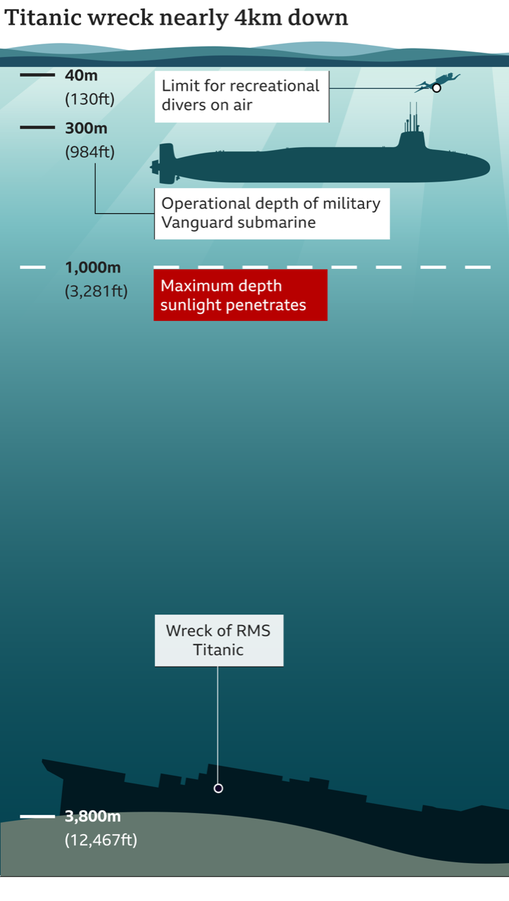 ซากเรือไททานิกจมอยู่ใต้พื้นผิวมหาสมุทรแอตแลนติกลึก 3,800 เมตร (12,500 ฟุต) หากเรือดำน้ำไททันลงไปที่ก้นทะเลแล้วและไม่สามารถกลับขึ้นมาได้ด้วยกำลังของมันเอง ทางเลือกในการกู้ภัยก็มีจำกัดมาก ปัจจุบัน มีเรือดำน้ำสำรวจทะเลลึกเพียงไม่กี่ลำที่สามารถลงไปได้ลึกขนาดนั้นในระดับเกือบสี่กิโลเมตรจากผิวน้ำ แน่นอนว่า ยานพาหนะที่ออกแบบมาสำหรับการช่วยเหลือกู้ภัยเรือดำน้ำของกองทัพเรือ ไม่สามารถดำได้ลึกขนาดนั้น ข้อมูลของ Ocean Gate บริษัทที่เป็นเจ้าของเรือดำน้ำสำรวจใต้ทะเลลึกนั้น เรือ Titan นับเป็นหนึ่งในเรือดำน้ำที่มีคนบังคับควบคุมเพียงแค่ห้าลำในโลก ที่สามารถดำลงไปถึงระดับความลึกที่ไททานิกจมอยู่ แต่เรือกู้ภัยของฝรั่งเศสที่มุ่งหน้าไปยังที่เกิดเหตุมียานดำน้ำ ROV ที่สามารถทำงาน ในระดับความลึกของซากเรือไททานิกได้