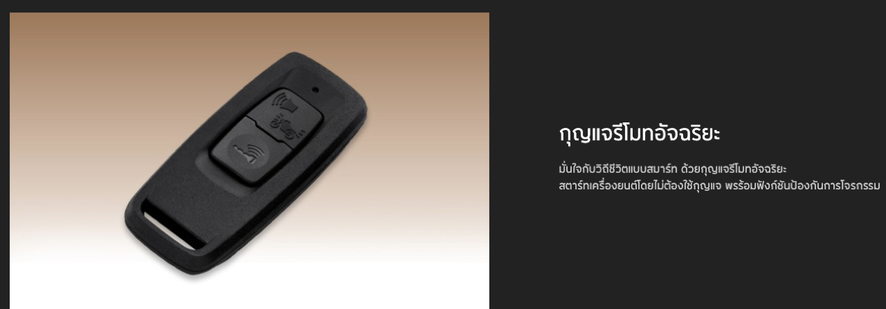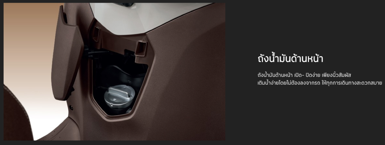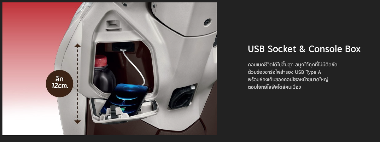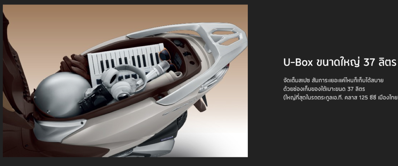 ฟังก์ชันการใช้งานที่ให้ความสะดวกสบาย กุญแจรีโมตสตาร์ตรถโดยไม่ต้องใช้กุญแจ ช่องเสียบสายชาร์จ และช่องเก็บของใต้เบาะใหญ่ที่สุดในรถตระกูลออโตเมติกคลาส 125 ซีซี ของเมืองไทย ใส่หมวกกันน็อกเต็มใบได้ 2 ใบ จบ ครบ ในคันเดียว