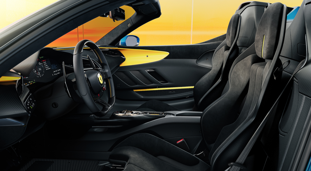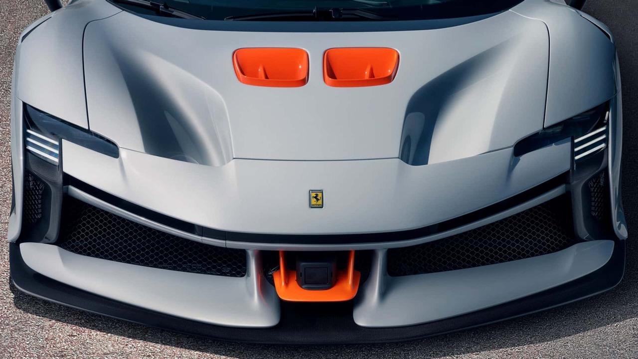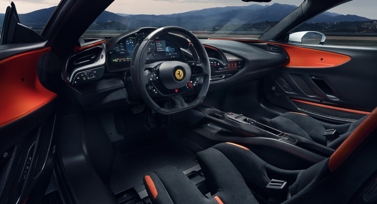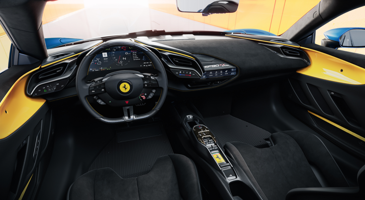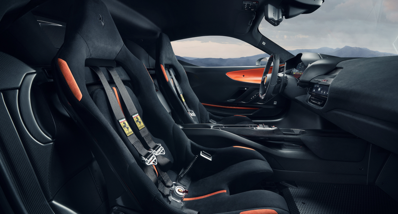 คอนโซลกลางที่ถูกลดขนาดให้เพรียวบางลง ไม่เพียงน่ามองขึ้น ทว่ายังมีน้ำหนักเบาจนน่าทึ่งอีกด้วย นอกจากนี้คันเกียร์แบบร่องได้ถูกเปลี่ยนมาติดตั้งไว้กึ่งกลางและขยับมาทางด้านหน้ารถมากขึ้น เมื่อเทียบกับใน SF90 Stradale สวิตช์กระจกมองข้างและอุปกรณ์หลักอื่นๆ ย้ายไปอยู่ที่ชั้นถัดมา (ด้านล่าง ต่ำลงมา) เบาะนั่งแบบรถแข่งทำขึ้นพิเศษ พร้อมโครงสร้างที่เผยให้เห็นคาร์บอนไฟเบอร์และเบาะรองนั่ง ปุ่มปรับพนักพิงแบบกลไกถูกติดตั้งกลมกลืนไปกับเบาะ ใช้วัสดุยางยืดเพื่อซ่อนรอยแยกระหว่างเบาะนั่งและพนักพิง โครงสร้างเบาะจะดูไร้รอยต่อ เหมือนเบาะแบบชิ้นเดียว แต่ปรับเอนพนักพิงได้ปกติ เมื่อรวมกับโครงสร้างคาร์บอนไฟเบอร์จะลดน้ำหนักลง 1.3 กก. เมื่อเทียบกับเบาะแบบชิ้นเดียวใน SF90 Stradale