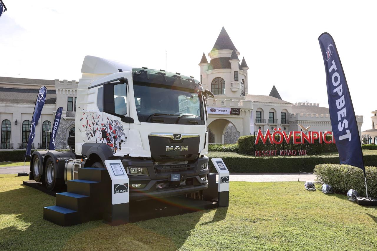 พร้อมกันนี้ บริษัท TOPBEST ได้นำรถบรรทุกสิบล้อหัวลากใหม่ล่าสุด มาตรฐานยูโร 5 รุ่น TGS ขนาด 360 แรงม้า แบบขับเคลื่อนเพลาเดียว (6X2) ซึ่งมีคุณลักษณะเด่นคือ สามารถยกเพลาหลัง กลายเป็นรถ 6 ล้อได้ ในกรณีที่ไม่มีน้ำหนักบรรทุก หรือ มีน้ำหนักบรรทุกน้อย ทำให้ประหยัดเชื้อเพลิงมากยิ่งขึ้นและลดการสึกหรอของยางมาให้ผู้สื่อข่าวได้ชมและสัมผัสส่วนแผนการจำหน่ายในปีนี้ จะนำรถบรรทุกหัวลากสิบล้อขับเคลื่อน 2 เพลา (6X4) รุ่น TGS 400 แรงม้า และรุ่น TGX 480 แรงม้า อีกด้วย รายละเอียดของรถบรรทุกทั้งสองรุ่นจะได้แจ้งให้ทราบต่อไป.