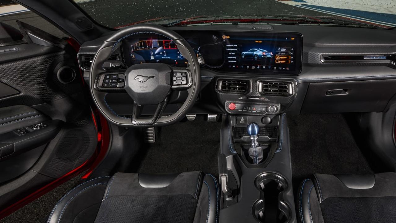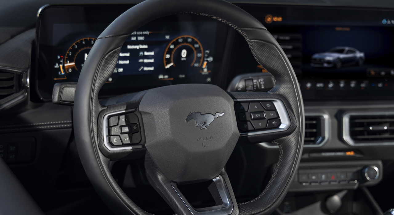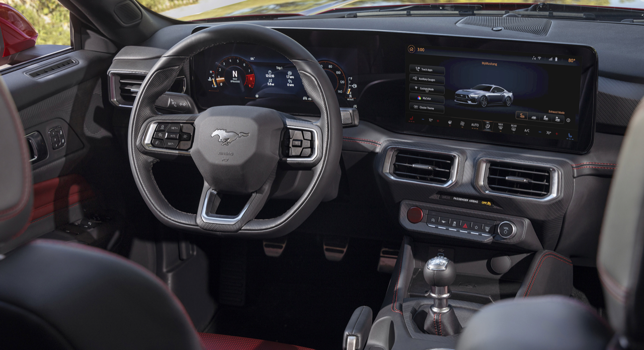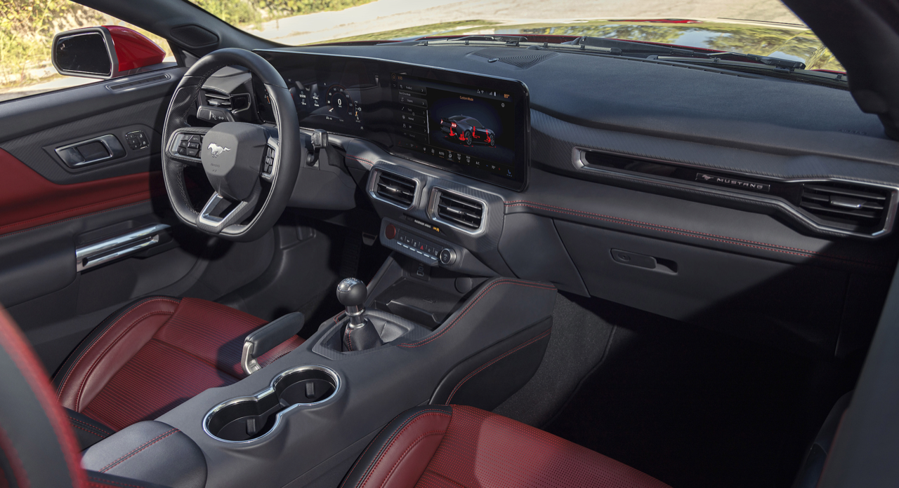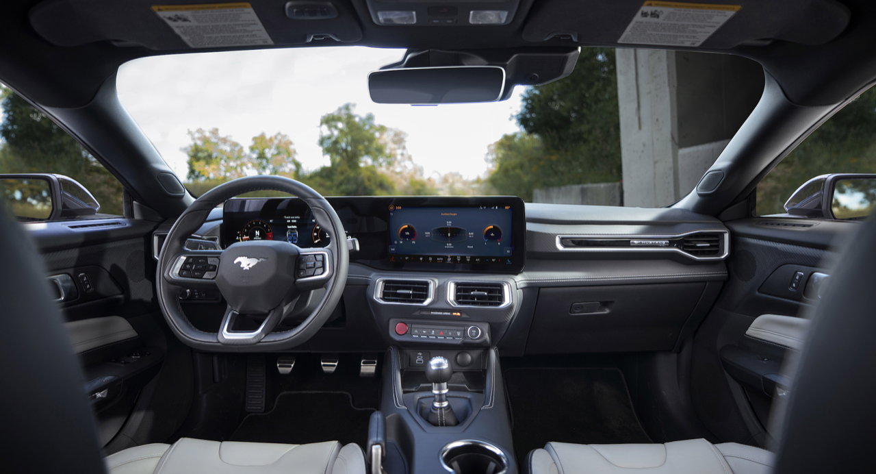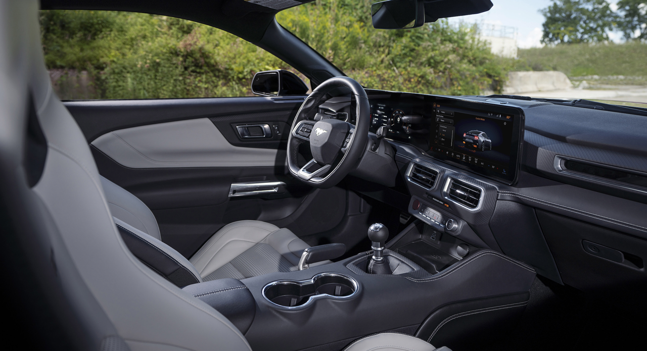 ห้องโดยสารแบบใหม่ปรับสภาพแวดล้อมในการขับขี่ให้ดีขึ้น แป้นหมุนแบบเก่าและสวิตช์เกียร์ที่เกะกะถูกกำจัดออกไปหมดแล้ว ถูกแทนที่ด้วยหน้าจอขนาดใหญ่ที่เชื่อมต่อกันสองจอ หน้าจอขนาด 12.4 นิ้วในส่วนของแผงหน้าปัดมาตรวัด หน้าจอมอนิเตอร์กลางขนาด 13.2 นิ้ว สำหรับระบบอินโฟเทนเมนต์ Ford SYNC 4 ออกแบบซอฟต์แวร์เพื่อเปิดโอกาสให้คนขับสามารถปรับแต่งการแสดงผลได้อย่างหลากหลาย ตั้งแต่การเลือกโหมดท่อไอเสีย 1 ใน 4 โหมด ไปจนถึงการเลือกว่าคุณต้องการให้เครื่องยนต์ส่งเสียงยังไง เพียงแค่กดปุ่มเพียงไม่กี่ปุ่ม