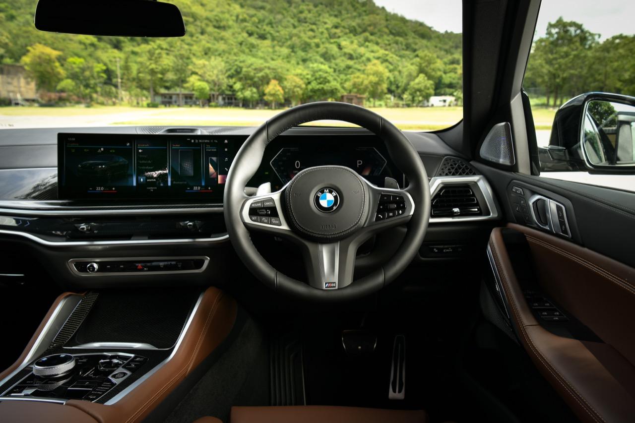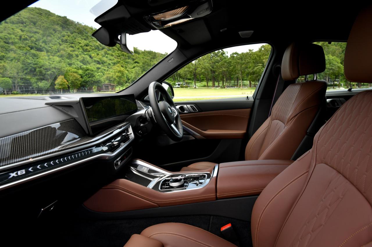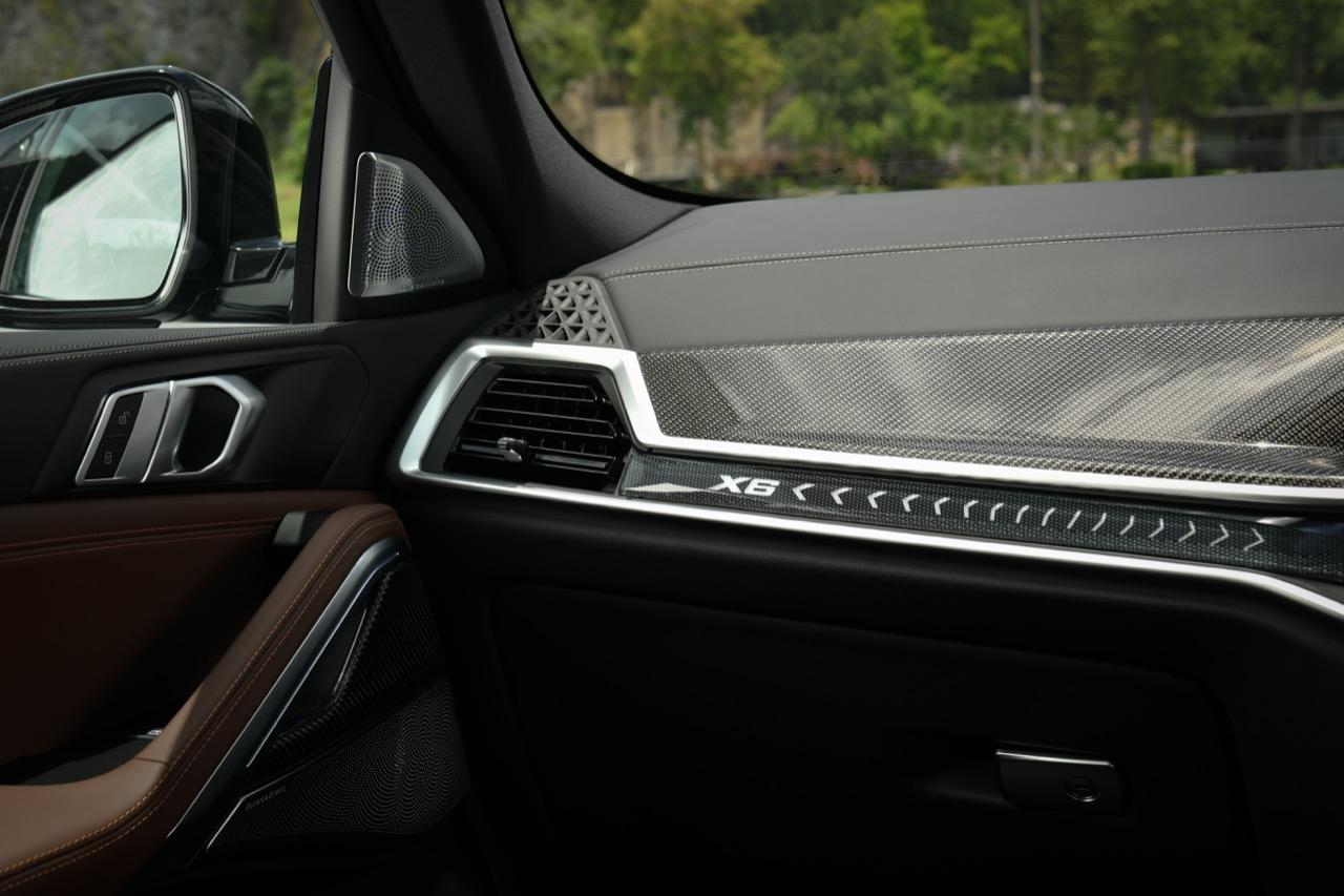 ห้องโดยสารของ X6 xDrive40i M Sport LCI 2023 แพ็กเกจชุดแต่ง M Sport Pro พวงมาลัยหุ้มหนังและเข็มขัดนิรภัยดีไซน์ M ภายในตกแต่งดีไซน์ M ด้วยวัสดุคาร์บอนไฟเบอร์ เพดานหลังคาภายในดีไซน์ M สี Anthracite ภายในตกแต่งด้วยผลึกแก้ว 'CraftedClarity' ม่านบังแดดประตูหลัง สำหรับอุปกรณ์เสริมไฮไลต์อื่น ๆ ได้แก่ ฟังก์ชันสั่งงานระบบ iDrive ด้วยการเคลื่อนไหวมือ BMW Gesture Control หลังคากระจก Panorama Sky Lounge ระบบเสียงรอบทิศทาง Bowers & Wilkins Diamond และระบบ Travel & Comfort