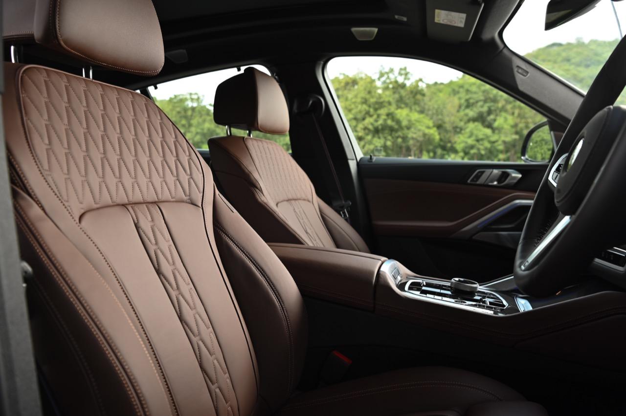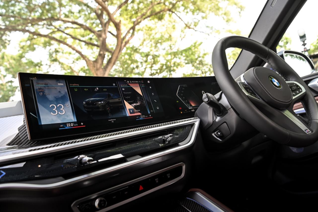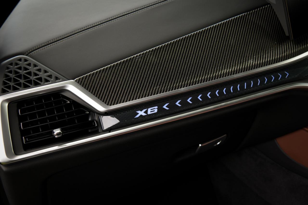 ห้องโดยสารของ X6 xDrive40i M Sport LCI 2023 แพ็กเกจชุดแต่ง M Sport Pro พวงมาลัยหุ้มหนังและเข็มขัดนิรภัยดีไซน์ M ภายในตกแต่งดีไซน์ M ด้วยวัสดุคาร์บอนไฟเบอร์ เพดานหลังคาภายในดีไซน์ M สี Anthracite ภายในตกแต่งด้วยผลึกแก้ว 'CraftedClarity' ม่านบังแดดประตูหลัง สำหรับอุปกรณ์เสริมไฮไลต์อื่น ๆ ได้แก่ ฟังก์ชันสั่งงานระบบ iDrive ด้วยการเคลื่อนไหวมือ BMW Gesture Control หลังคากระจก Panorama Sky Lounge ระบบเสียงรอบทิศทาง Bowers & Wilkins Diamond และระบบ Travel & Comfort