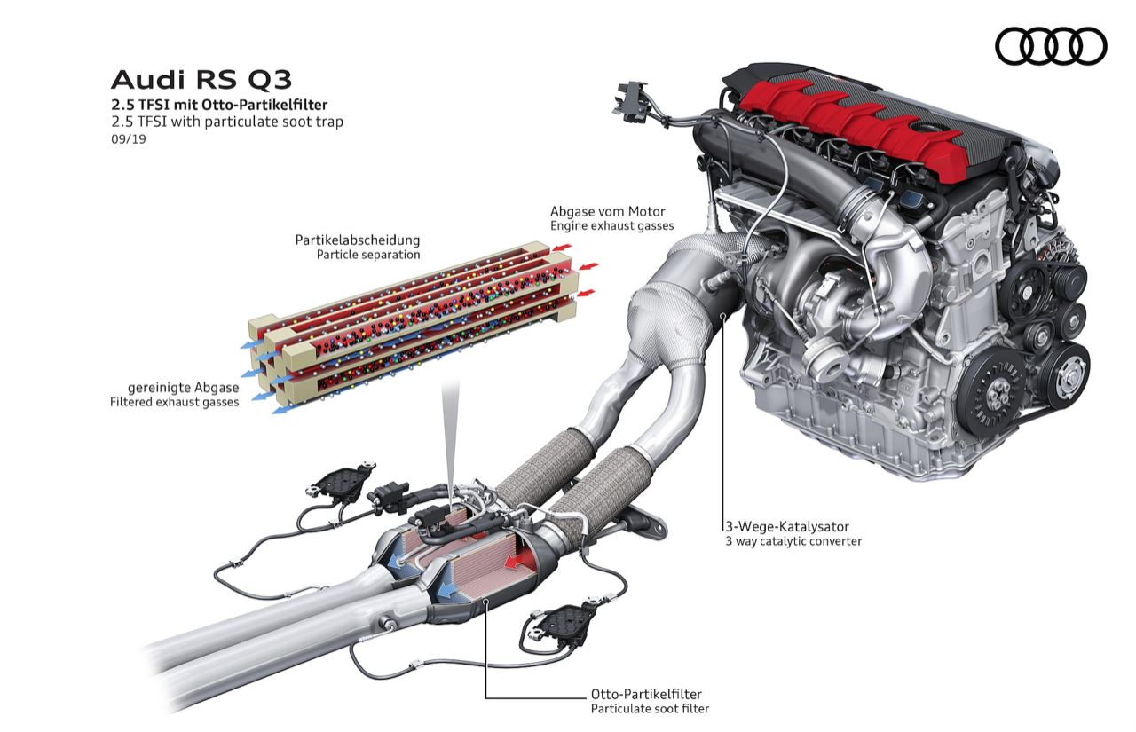 ระบบไอเสียที่ถูกปรับแต่งใหม่ ติดตั้งตัวกรองอนุภาคแบบล่าสุดเพื่อลด Co2 แยกท่อระบายออกเป็นสองชุด ในสไตล์สปอร์ต เพื่อทำให้การระบายไอเสียคล่องขึ้น รวมถึงเสียงท่อระบายท้ายในโหมดสูงสุด RS 1/RS2 ที่เร้าใจ Audi พยายามอธิบายว่าเป็นเสียงท่อที่มีลักษณะเฉพาะตัวของรถยนต์ในเวอร์ชัน RS ในขณะที่ระบบไอเสียแบบ RS Sport จะได้ปลายท่อสีดำ ส่งเสียงคำรามผสมผสานกับการตั้งค่าในโหมดการขับขี่แบบใหม่ ผ่านโหมด RS1 และโหมด RS2 วาล์วบายพาสในท่อจะเปิดออกจนสุด มอบเสียงที่เต็มไปด้วยพลัง พร้อมเสียงระเบิดปะทุเวลาเปลี่ยนเกียร์ สาแก่ใจสาย Quattro