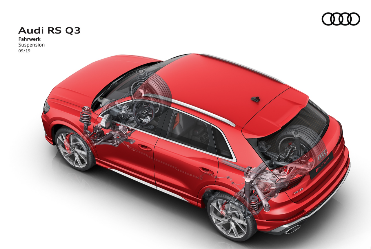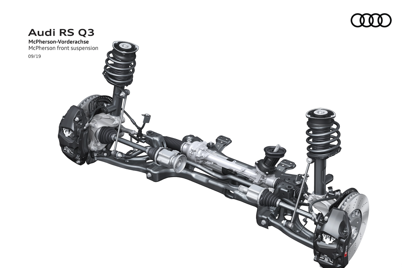 RS Q3 Edition 10 Years เซตอัปเพื่อสร้างอารมณ์การควบคุมที่แตกต่างจากรถครอสโอเวอร์คู่แข่ง เนื่องจากมีกำลังถึง 400 แรงม้า ช่วงล่างของมันจึงถูกปรับให้แข็งขึ้นจากการเลือกใช้สปริงและกระบอกโช้คที่โตกว่า Q3 รุ่นมาตรฐาน ช่วงล่างของ RS Q3 Sportback Edition 10 Years ปรับต่ำลงอีก 10 มิลลิเมตร เมื่อเทียบกับ Q3 รุ่นตัวถังมาตรฐาน ด้านหน้าเป็นแบบแมคเฟอร์สัน สตรัท สปริง โช้คอัพและกันโคลงแบบปรังแต่งพิเศษ ส่วนด้านหลังเป็นแบบ 5 Link ในขณะที่ระบบช่วงล่างแบบออปชันเสริมของ RS Sport plus ที่เจ้าของจะต้องควักเพิ่มหากอยากได้ความหนึบในระดับรถแข่ง มีการเพิ่มการควบคุมแชสซีแบบไดนามิกแต่ก็แข็งกว่าของเดิมพอสมควร ระบบรองรับของ RS Q3 Sportback Edition 10 Years ที่ได้รับการปรุงแต่งจาก Audi Sport ขึ้นชื่อในเรื่องของการตอบสนองต่อทุกสภาพถนน และความนิ่งในย่านความเร็วสูงเมื่อทำงานควบคู่ไปกับระบบขับเคลื่อนสี่ล้อ Quattro