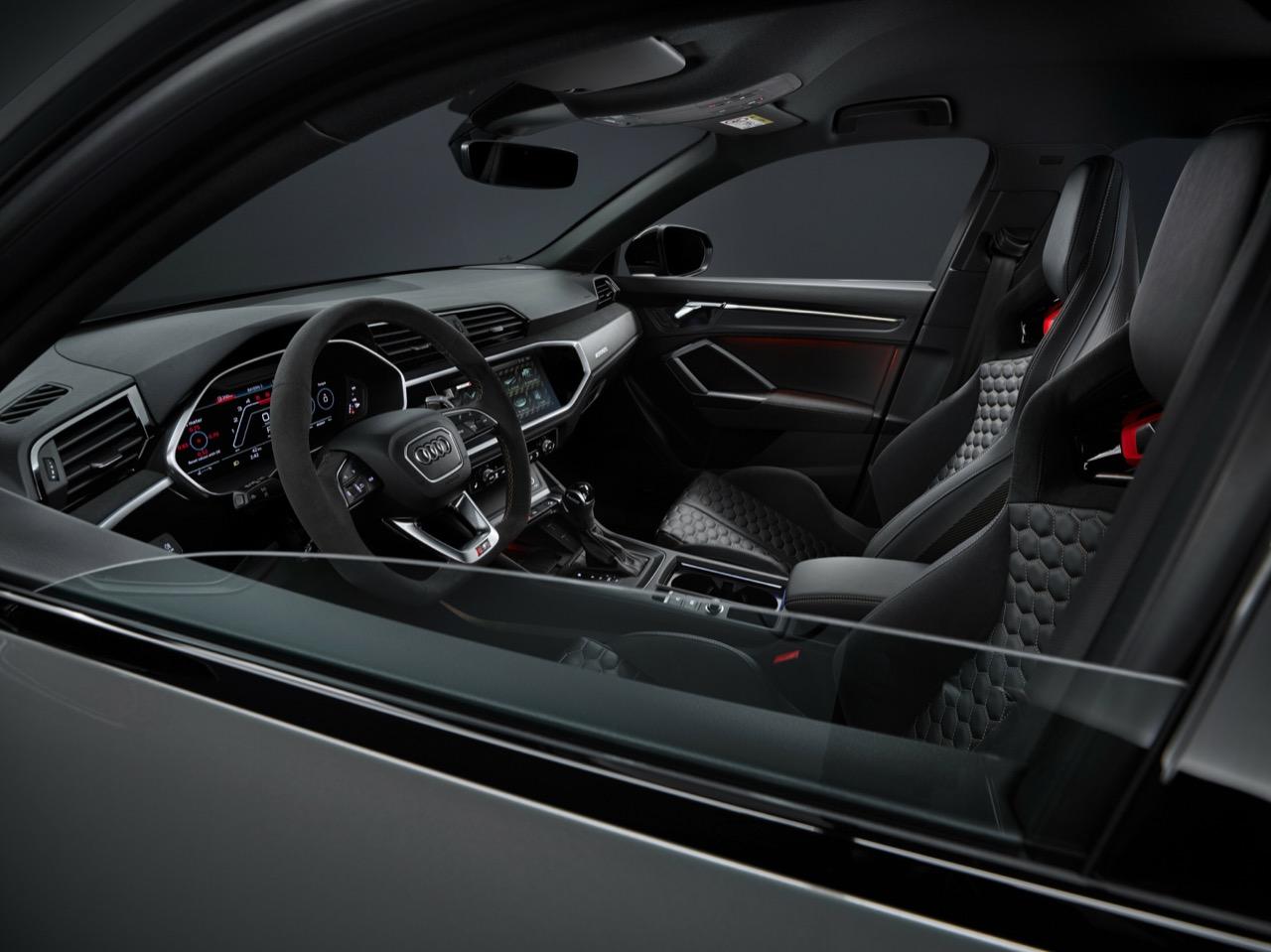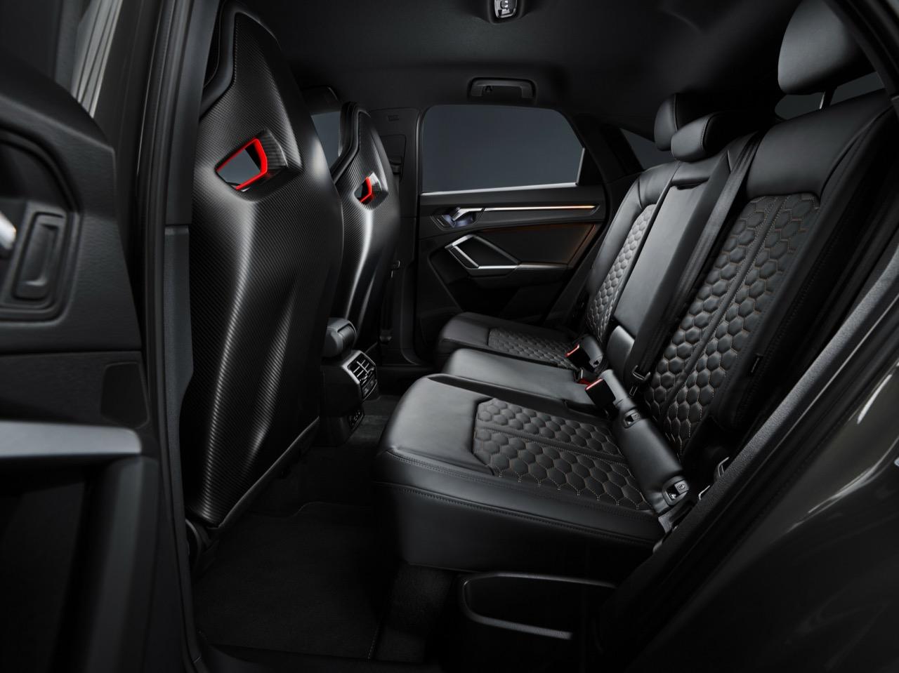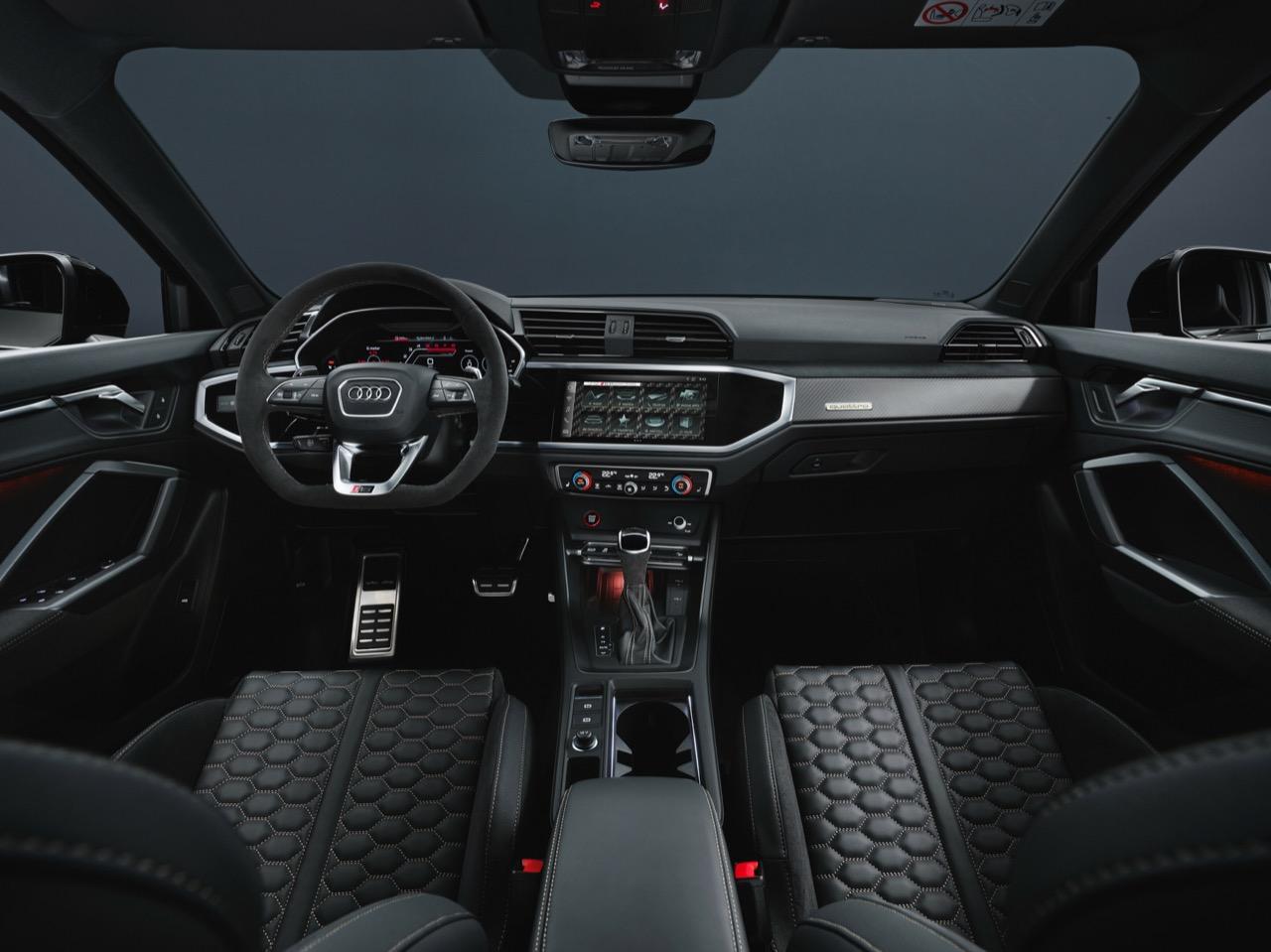เบาะนั่งคู่หน้ารุ่นพิเศษพร้อมตราสัญลักษณ์ RS ที่บริเวณด้านล่างของพนักพิงศีรษะ ฝาครอบเบาะหลังคาร์บอนด้านถูกนำมาติดตั้งเป็นครั้งแรกใน RS Q33 เป็นไฮไลต์พิเศษราคาแพง เบาะนั่งหุ้มด้วยหนังผสม Dinamica สีดำเจ็ตแบล็กซึ่งเป็นสีใหม่ที่พยายามเน้นสไตล์สปอร์ตพร้อมความหรูหรา หนัง Dinamica ไมโครไฟเบอร์ ประกอบด้วยเส้นใย PET รีไซเคิลประมาณ 45% นอกจากส่วนของเบาะนั่งแล้ว ยังใช้กับแผงหน้าปัดและแผงประตู การเย็บแบบรังผึ้งตรงกลางเบาะ ที่วางแขนตรงกลาง ที่เท้าแขน แผงประตู และพวงมาลัย มีให้เลือกทั้งแบบทรงกลม หรือแบบเรียบ พรมปูพื้นสีดำพร้อมทองแดงเคลือบเงา จอแสดงผล MMI หน้าจอสัมผัสขนาด 10.1 นิ้ว มีตัวเลขนัมเบอร์ของรถ กาบบันไดแบบเรืองแสงเฉพาะรุ่น ฉายภาพ 3 มิติสีแดงลงบนพื้นเมื่อเปิดประตู เบาะนั่งคู่หน้ารุ่นพิเศษประทับตราสัญลักษณ์ RS ที่บริเวณด้านล่างของพนักพิงศีรษะ ฝาครอบเบาะหลังคาร์บอนด้าน นำมาใช้เป็นครั้งแรกใน RS Q33 เป็นไฮไลต์พิเศษราคาแพง เบาะนั่งหุ้มด้วยหนังผสม Dinamica สีดำเจ็ตแบล็กซึ่งเป็นสีใหม่ที่พยายามเน้นสไตล์สปอร์ตพร้อมความหรูหรา หนัง Dinamica ไมโครไฟเบอร์ ประกอบด้วยเส้นใย PET รีไซเคิลประมาณ 45% นอกจากส่วนของเบาะนั่งแล้วยังใช้กับแผงหน้าปัดและแผงประตู การเย็บแบบรังผึ้งตรงกลางเบาะ ที่วางแขนตรงกลาง ที่เท้าแขน แผงประตู และพวงมาลัย มีให้เลือกทั้งแบบทรงกลมหรือแบบเรียบ พรมปูพื้นสีดำพร้อมทองแดงเคลือบเงา จอแสดงผล MMI หน้าจอสัมผัสขนาด 10.1 นิ้ว มีตัวเลขนัมเบอร์ของรถ กาบบันไดแบบเรืองแสงเฉพาะรุ่น ฉายภาพ 3 มิติสีแดงลงบนพื้นเมื่อเปิดประตู