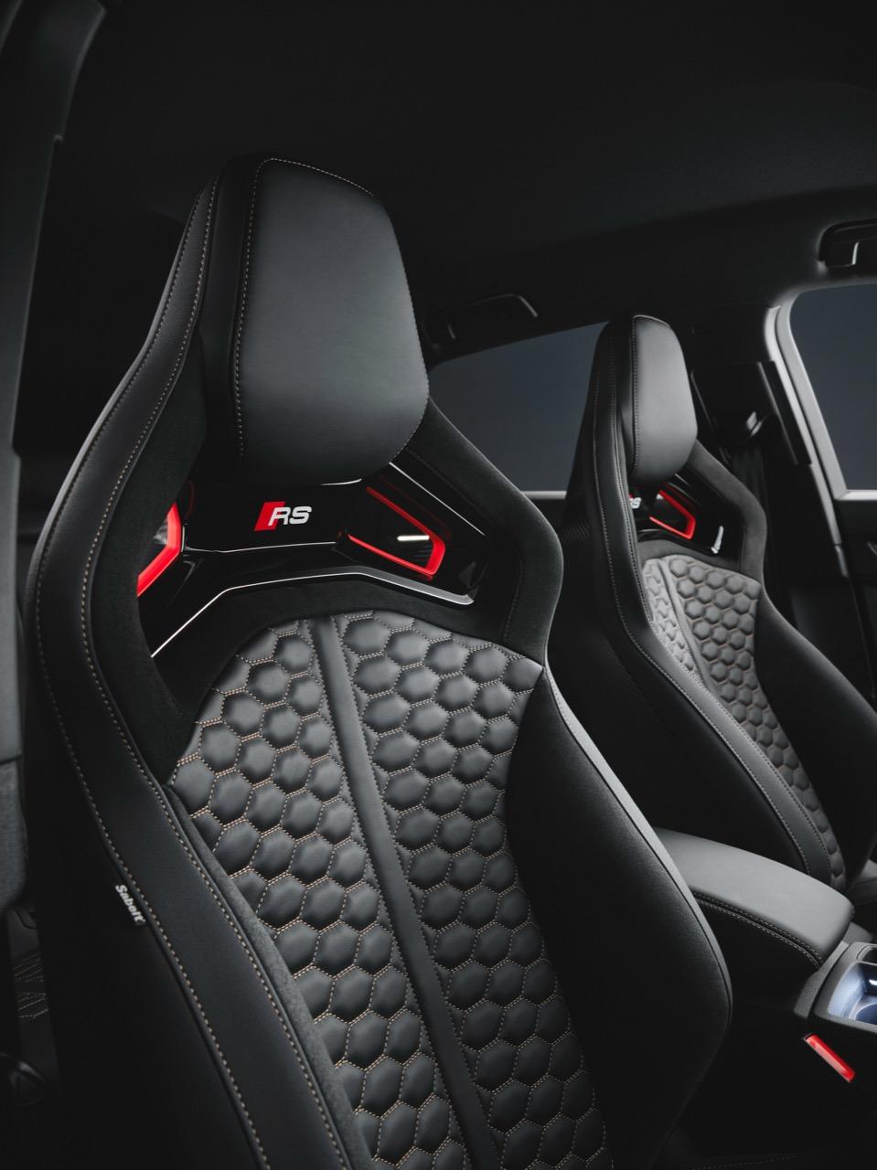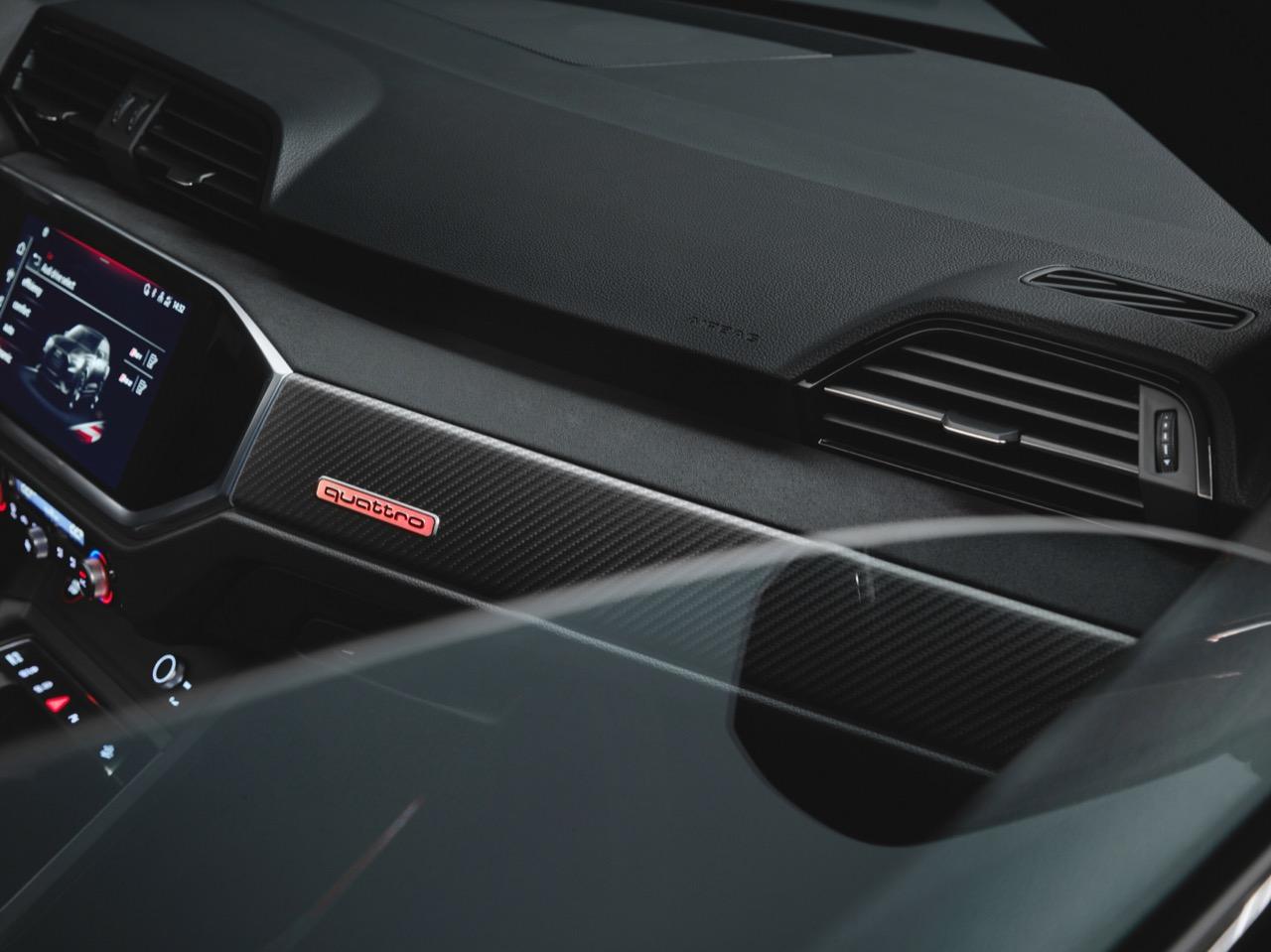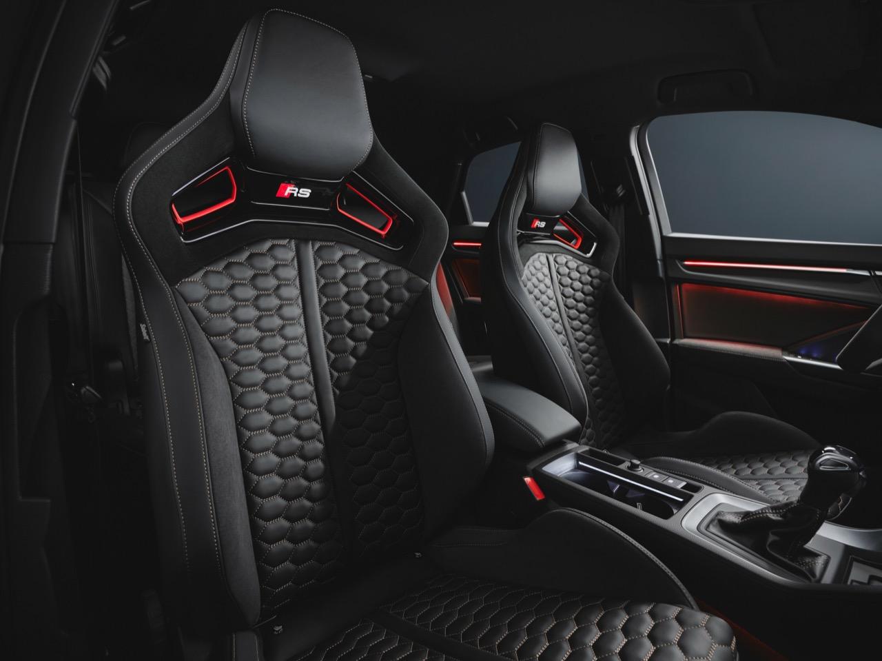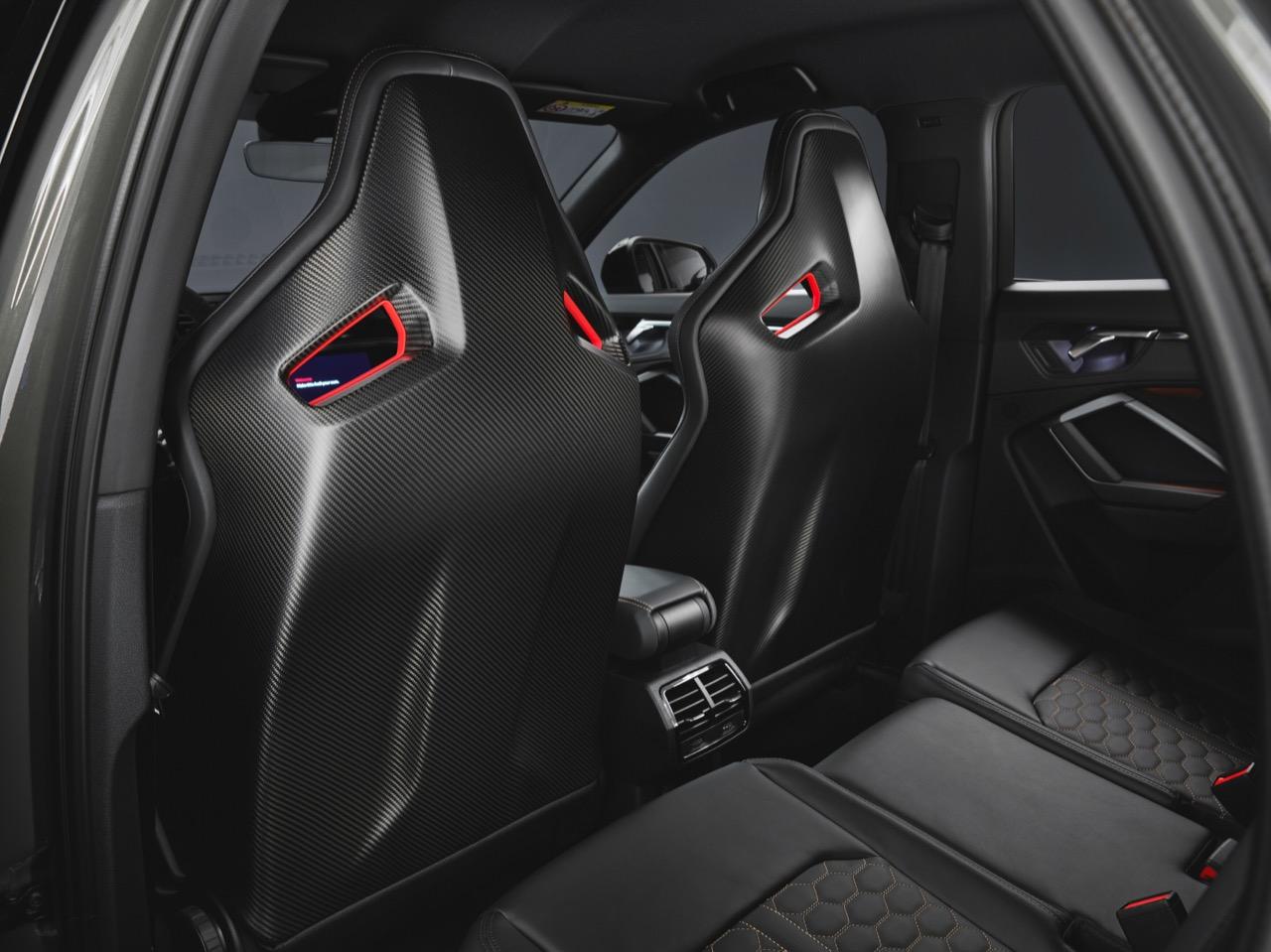 เบาะนั่งคู่หน้ารุ่นพิเศษพร้อมตราสัญลักษณ์ RS ที่บริเวณด้านล่างของพนักพิงศีรษะ ฝาครอบเบาะหลังคาร์บอนด้านถูกนำมาติดตั้งเป็นครั้งแรกใน RS Q33 เป็นไฮไลต์พิเศษราคาแพง เบาะนั่งหุ้มด้วยหนังผสม Dinamica สีดำเจ็ตแบล็กซึ่งเป็นสีใหม่ที่พยายามเน้นสไตล์สปอร์ตพร้อมความหรูหรา หนัง Dinamica ไมโครไฟเบอร์ ประกอบด้วยเส้นใย PET รีไซเคิลประมาณ 45% นอกจากส่วนของเบาะนั่งแล้ว ยังใช้กับแผงหน้าปัดและแผงประตู การเย็บแบบรังผึ้งตรงกลางเบาะ ที่วางแขนตรงกลาง ที่เท้าแขน แผงประตู และพวงมาลัย มีให้เลือกทั้งแบบทรงกลม หรือแบบเรียบ พรมปูพื้นสีดำพร้อมทองแดงเคลือบเงา จอแสดงผล MMI หน้าจอสัมผัสขนาด 10.1 นิ้ว มีตัวเลขนัมเบอร์ของรถ กาบบันไดแบบเรืองแสงเฉพาะรุ่น ฉายภาพ 3 มิติสีแดงลงบนพื้นเมื่อเปิดประตู เบาะนั่งคู่หน้ารุ่นพิเศษประทับตราสัญลักษณ์ RS ที่บริเวณด้านล่างของพนักพิงศีรษะ ฝาครอบเบาะหลังคาร์บอนด้าน นำมาใช้เป็นครั้งแรกใน RS Q33 เป็นไฮไลต์พิเศษราคาแพง เบาะนั่งหุ้มด้วยหนังผสม Dinamica สีดำเจ็ตแบล็กซึ่งเป็นสีใหม่ที่พยายามเน้นสไตล์สปอร์ตพร้อมความหรูหรา หนัง Dinamica ไมโครไฟเบอร์ ประกอบด้วยเส้นใย PET รีไซเคิลประมาณ 45% นอกจากส่วนของเบาะนั่งแล้วยังใช้กับแผงหน้าปัดและแผงประตู การเย็บแบบรังผึ้งตรงกลางเบาะ ที่วางแขนตรงกลาง ที่เท้าแขน แผงประตู และพวงมาลัย มีให้เลือกทั้งแบบทรงกลมหรือแบบเรียบ พรมปูพื้นสีดำพร้อมทองแดงเคลือบเงา จอแสดงผล MMI หน้าจอสัมผัสขนาด 10.1 นิ้ว มีตัวเลขนัมเบอร์ของรถ กาบบันไดแบบเรืองแสงเฉพาะรุ่น ฉายภาพ 3 มิติสีแดงลงบนพื้นเมื่อเปิดประตู