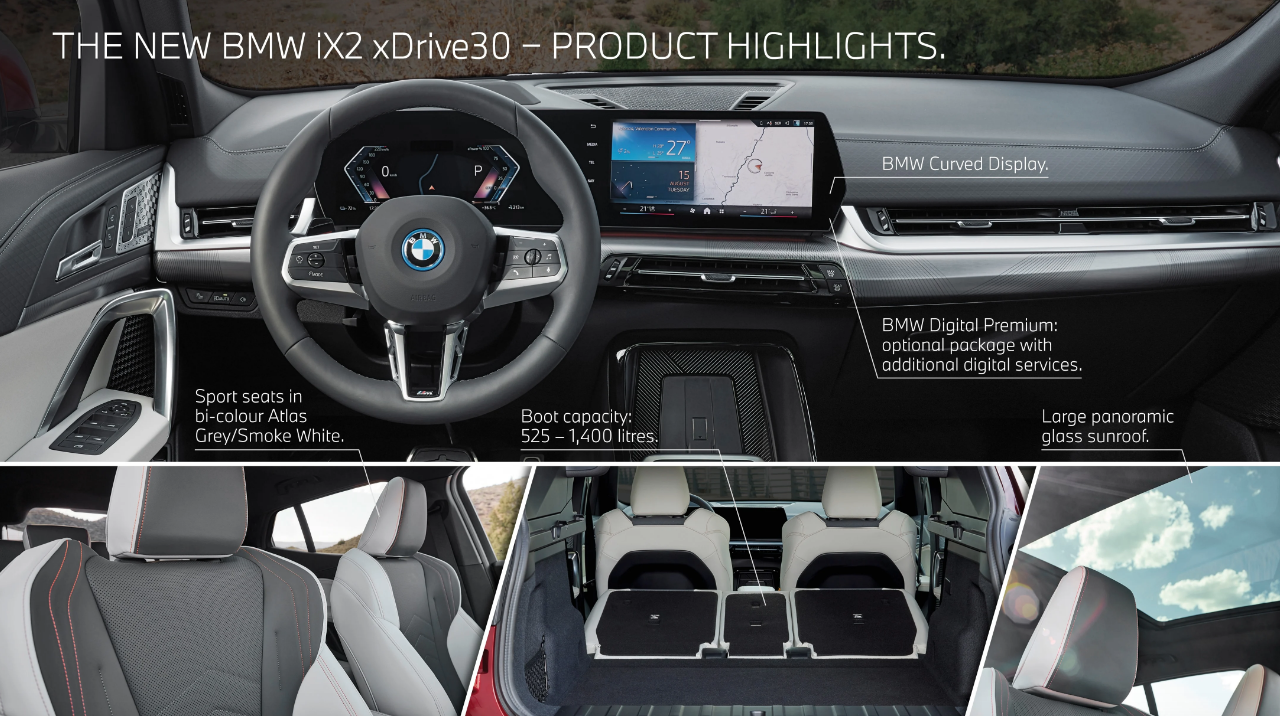 BMW iX2 xDrive30 ใช้ขุมพลังเดียวกับ BMW iX1 / Countryman Cooper SE ALL4 ที่เปิดตัวไปแล้วก่อนหน้านี้ มอเตอร์ตัวหน้า eDrive 5.0 M170SF กำลัง 190 แรงม้า แรงบิดสูงสุด 247 นิวตันเมตร มอเตอร์ตัวหลัง กำลัง 190 แรงม้า แรงบิดสูงสุด 247 นิวตันเมตร กำลังมอเตอร์คู่ 2 ตัว 313 แรงม้า แรงบิดสูงสุด 494 นิวตันเมตร ขับเคลื่อน 4 ล้อ xDrive แบตเตอรี่ Lithium-ion ขนาด 64.7 kWh ชาร์จเต็มวิ่งไกล 449 กิโลเมตร อัตราเร่ง 0-100 กิโลเมตรต่อชั่วโมง ใน 5.6 วินาที ความเร็วสูงสุด 180 กิโลเมตรต่อชั่วโมง ชาร์จไฟ AC สูงสุด 11 kW ประมาณ 6 ชั่วโมง 30 นาที AC สูงสุด 22 kW ประมาณ 3 ชั่วโมง 45 นาที DC Fast Charge สูงสุด 130 kW จาก 10-80% ภายใน 29 นาที DC DC Fast Charge 10 นาที วิ่งไกล 120 กิโลเมตร