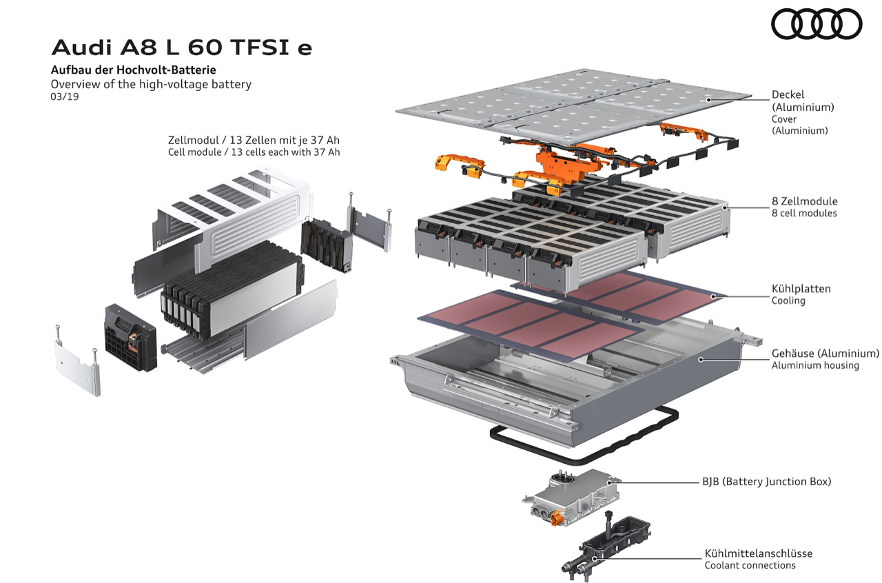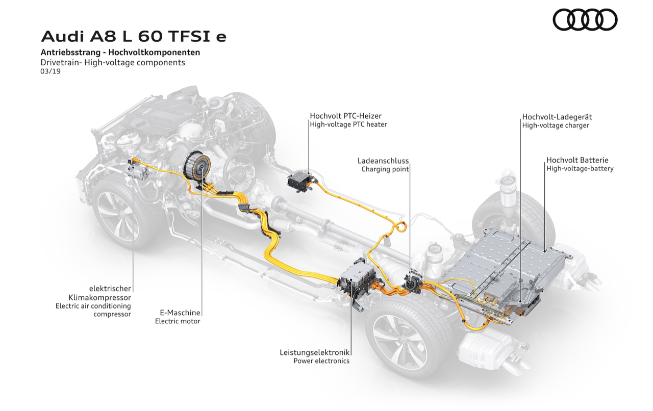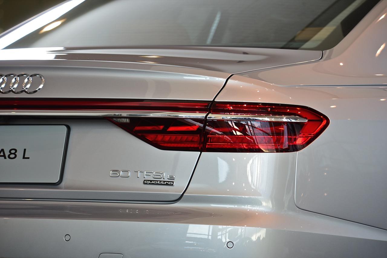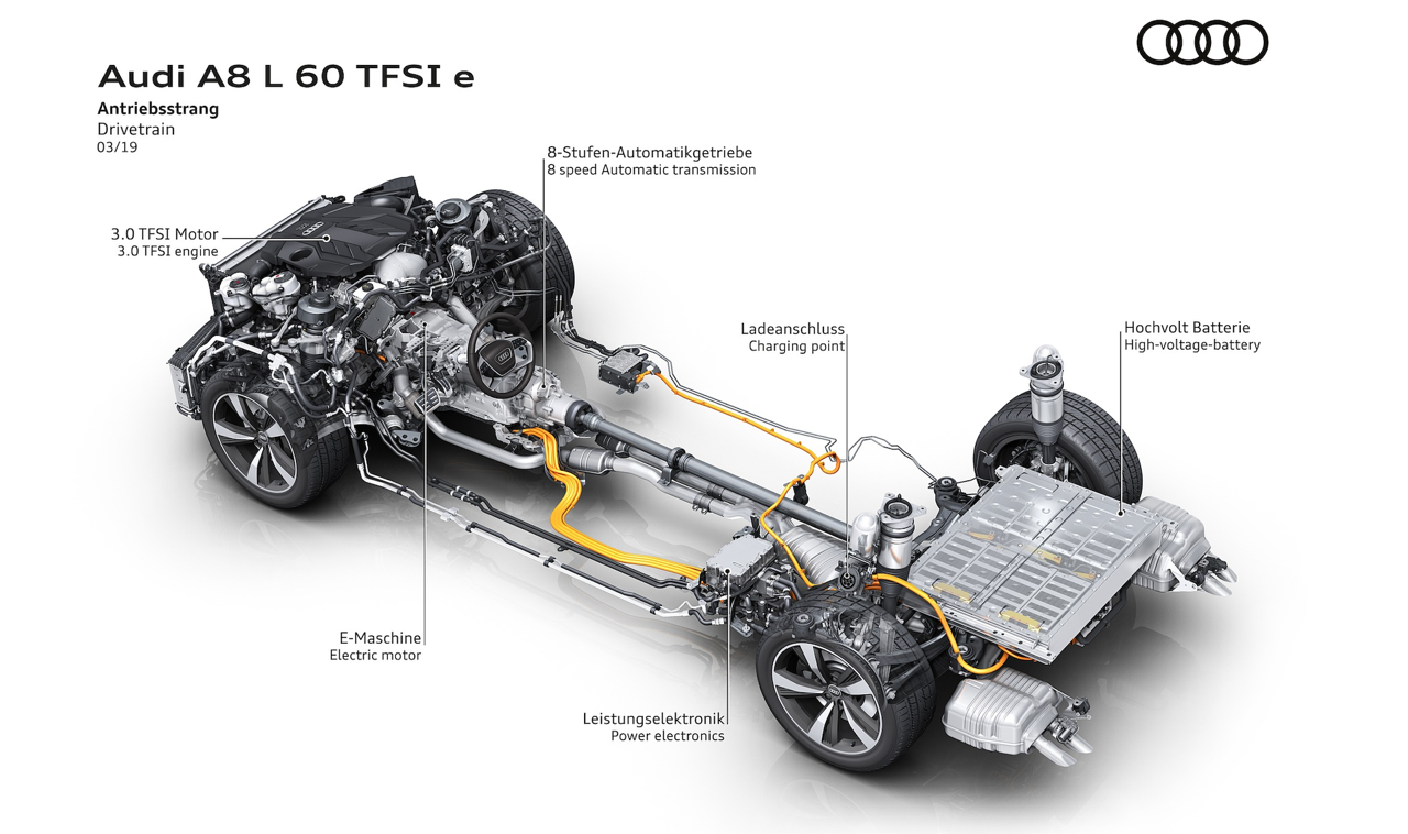 Audi A8 L 60TFSI e quattro เรือธงรุ่น Plug-in Hybrid (PHEV) ติดตั้งมอเตอร์ไฟฟ้าเสริมแรงบิดขนาดกะทัดรัด เชื่อมต่อการทำงานกับระบบเกียร์ เครื่องยนต์เบนซิน V6 ขนาดความจุ 3.0 ลิตร TFSI แบตเตอรี่ลิเธียมไอออนที่ด้านหลัง เก็บพลังงานไฟฟ้า 17.9 kWh กำลังของเครื่องยนต์ และมอเตอร์ไฟฟ้า รวม 340 kW หรือ 462 แรงม้า แรงบิดสูงสุด 700 นิวตันเมตร Audi A8 L 60 TFSI e quattro เร่งจาก 0 ถึง 100 กม./ชม. ใน 4.9 วินาที รุ่น Plug-in Hybrid มีโหมดการขับขี่ให้เลือก 4 โหมด เร่ิมจากโหมด “EV” การขับขี่ด้วยไฟฟ้าเต็มรูปแบบ โหมด “Hybrid” การผสานรวมระบบขับเคลื่อนทั้งสองแบบ (เครื่องยนต์ + มอเตอร์) อย่างมีประสิทธิภาพ โหมด “Hold” การอนุรักษ์พลังงานไฟฟ้าที่มีอยู่ โหมด "ชาร์จ" เครื่องยนต์สันดาปจะทำหน้าที่ชาร์จแบตเตอรี่ สำหรับกาชาร์จไฟที่บ้าน หรือสถานีชาร์จ สามารถชาร์จสูงสุดด้วยไฟฟ้ากระแสสลับ AC 7.4 กิโลวัตต์ ใช้เวลาชาร์จจาก 0 ไปจนถึง 100% ภายใน 55 นาที และขับไกลด้วยโหมด EV ที่ 52 กิโลเมตร