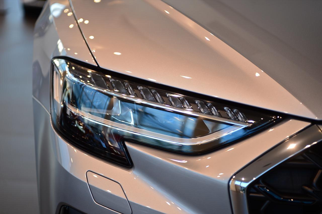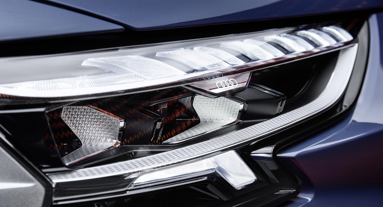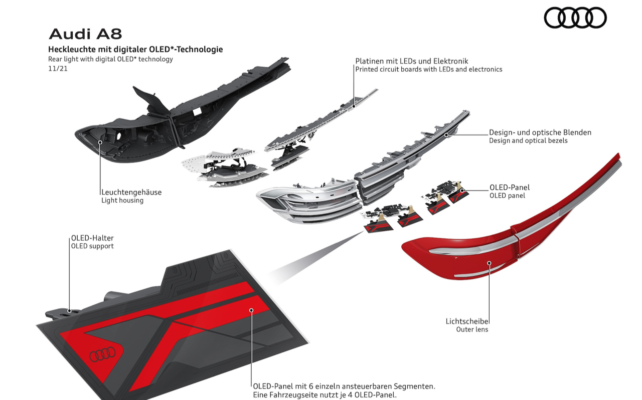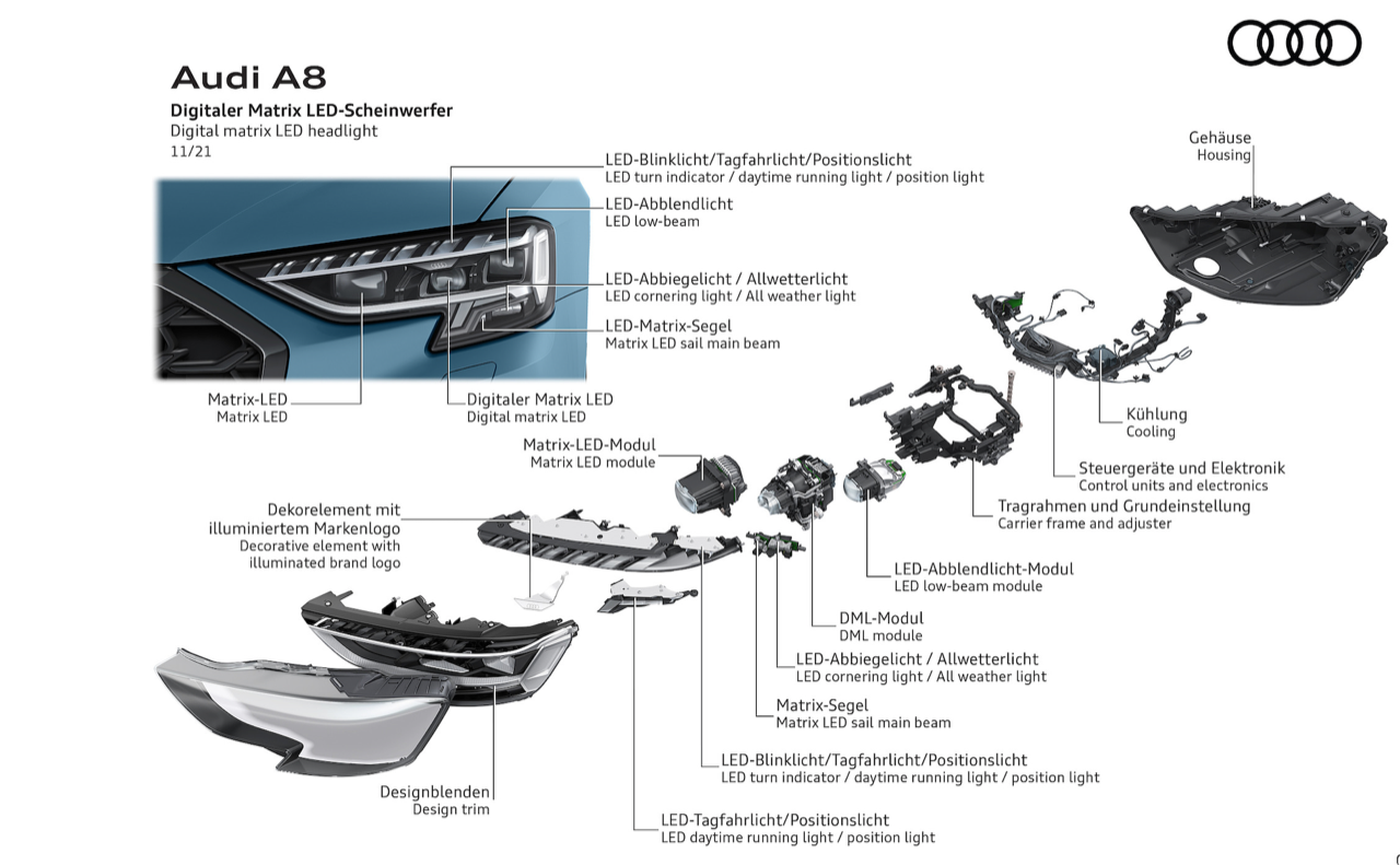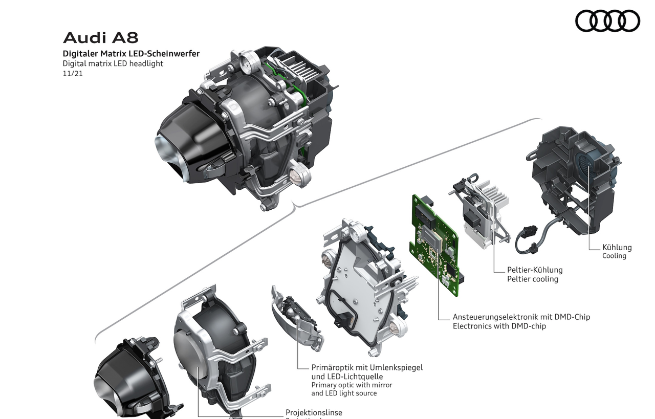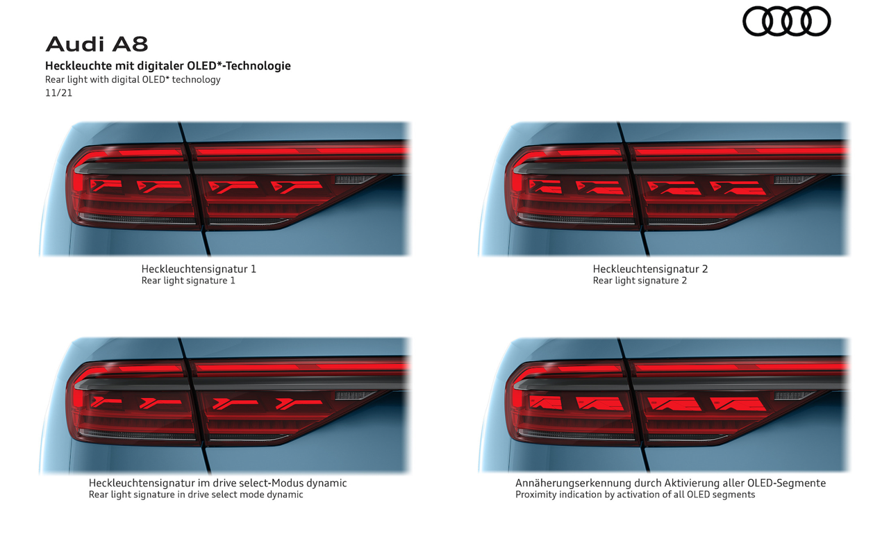 ไฟหน้า Digital Matrix LED เทียบได้กับเครื่องฉายวิดีโอ ใช้เทคโนโลยี DMD (digital micromirror device) อุปกรณ์กระจกไมโครดิจิทัล ไฟหน้าแต่ละดวงมีกระจกขนาดเล็กประมาณ 1.3 ล้านชิ้น ทำหน้าที่แบ่งแสงออกเป็นพิกเซลเล็กๆ ช่วยปรับการมองเห็นในที่มืด เพิ่มแสงสว่างบนถนนที่ปราสจากแสงไฟ ทำให้สามารถควบคุมรถได้อย่างแม่นยำ ฟังก์ชันใหม่ที่ทำให้เรื่องที่ยากมีความเป็นไปได้ นั่นก็คือไฟช่องทาง และไฟแสดงทิศทางสำหรับขับขี่บนทางหลวง ไฟหน้าจะเปล่งแสงส่องสว่างเฉพาะเลนของคนขับให้สว่างเป็นพิเศษ ไฟแสดงทิศทาง ออกแบบการทำงานเพื่อช่วยให้ผู้ขับอยู่ในเลนของตนเอง เมื่อขับผ่านถนนที่กำลังมีการก่อสร้างซึ่งมักจะไม่มีเส้นแบ่งช่องทาง และอาจก่อให้เกิดอันตราย ไฟหน้า Matrix LED แบบดิจิทัล พร้อมฟังก์ชัน coming home/leaving home แบบไดนามิก เมื่อปลดล็อกและออกจากรถ ระบบไฟจะส่องแสงสว่างคล้ายกับเครื่องสไตล์ที่ฉายบนพื้น หรือผนัง A8 รุ่นปรับโฉมยังมาพร้อมกับไฟท้าย OLED แบบดิจิตอล (OLED = organic light-emitting diode) เมื่อเลือกโหมด Dynamic ไฟท้าย OLED จะทำการปรับเปลี่ยนรูปแบบภายในกรอบไฟท้ายให้กว้างขึ้น เพิ่มความสว่างมากกว่าเดิม ระบบควบคุม และสั่งงานไฟท้ายจะทำงานด้วยการเปิดไฟ OLED ในรูปแบบเฉพาะ ในโหมดสูงสุดเท่านั้น แม้ในตอนกลางวัน เมื่อมีรถคันอื่นวิ่งเข้ามาใกล้กับส่วนท้ายของ A8 ภายในระยะ 2 เมตร ระบบ OLED ทั้งหมดจะถูกเปิดใช้งานโดยอัตโนมัติทันที สำหรับฟังก์ชันเพิ่มเติมได้แก่ สัญญาณไฟเลี้ยวแบบไดนามิก รวมถึงฟังก์ชัน coming home/leaving home