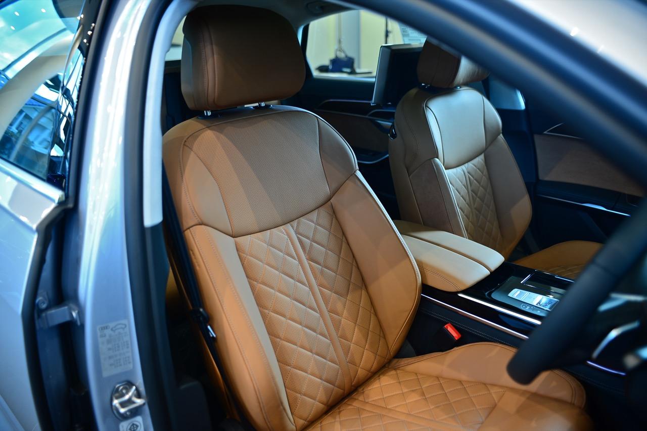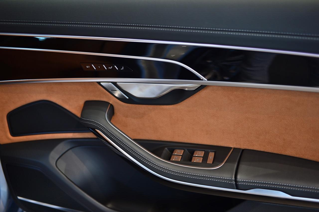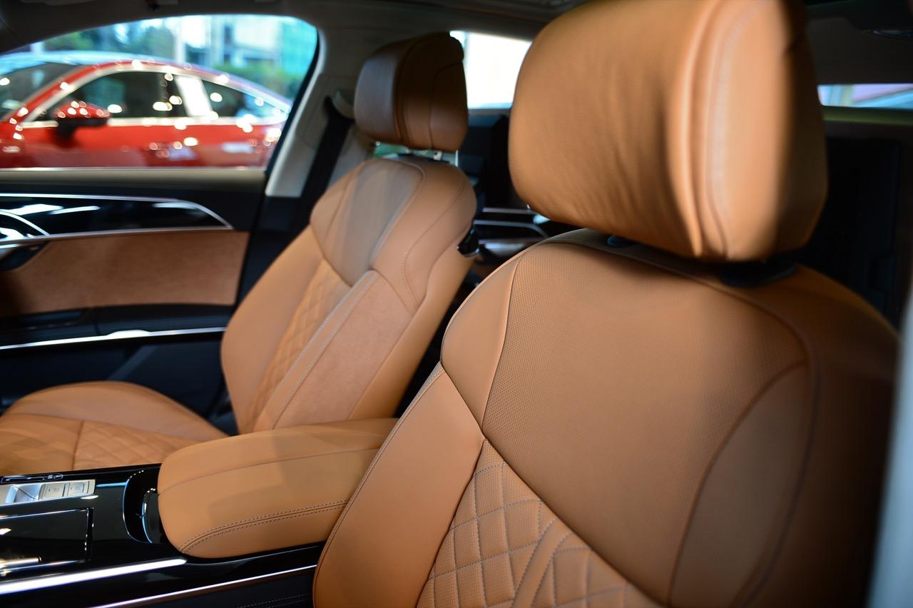 การเจาะรูอย่างแม่นยำบนหนังที่ใช้หุ้มเบาะ, ม่านบังแสงเปิดและปิดด้วยไฟฟ้า, ช่องแอร์บริเวณเสากลาง ผ้ากำมะหยี่ที่นุ่มสบาบบนพนักพิงศีรษะ เบาะนั่งหุ้มด้วยหนัง Valcona สีน้ำตาลคอนยัค วัสดุไมโครไฟเบอร์ Dinamica สีขาวหุ้มบริเวณขอบเสาหน้า กลาง หลัง และเพดานรถทั้งหมด ลักษณะเฉพาะของ A8 ที่ได้รับการปรับปรุงใหม่ก็คือ การกำหนดค่าโทนสีภายในที่มีให้เลือกตามใจลูกค้า รวมถึงการออกแบบของ Audi ในสีเงินพาสเทล และภายใน S line สีดำ สีแดงเมอร์โลต์ หรือคอนญัก แพ็กเกจเครื่องหนังและอุปกรณ์เครื่องหนังหลายรายการจาก Audi Exclusive เป็นออปชันเสริมราคาแพงที่มีให้เลือกมากมาย พร้อมแพ็กเกจระบบเสริมคุณภาพอากาศด้วยเครื่องสร้างประจุไอออน และกลิ่นหอมที่ทำให้สดชื่น